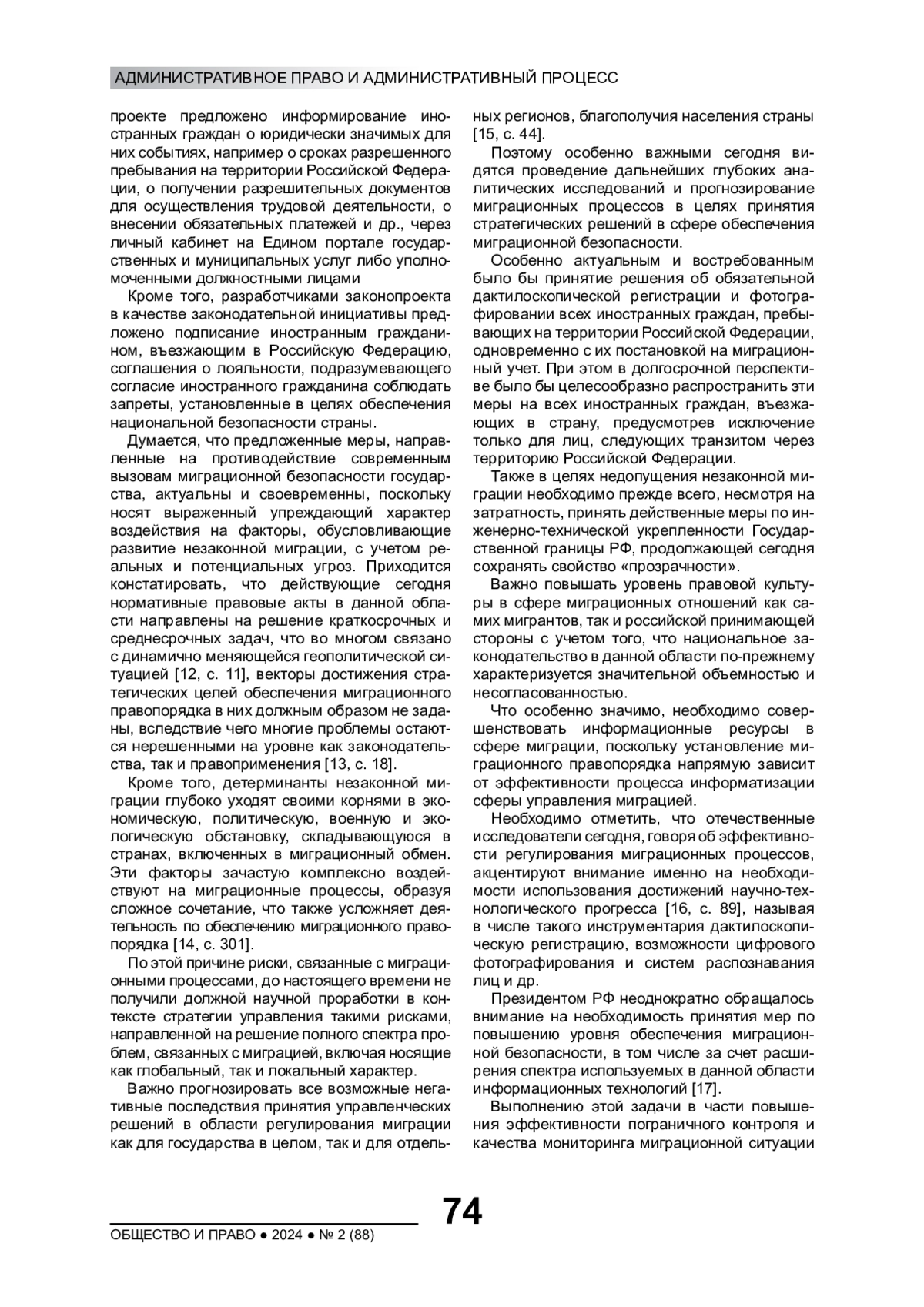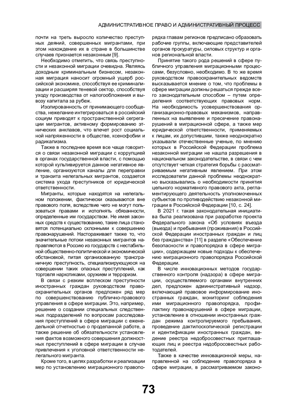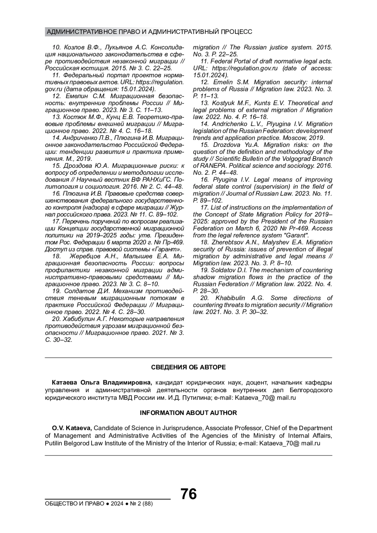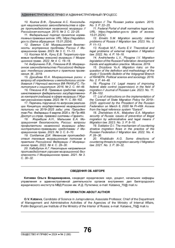 18. Жеребцов А.Н., Малышев Е.А. Миграционная безопасность России: вопросы профилактики незаконной миграции административно-правовыми средствами // Миграционное право. 2023. № 3. С. 8-10. EDN: IAQYEB