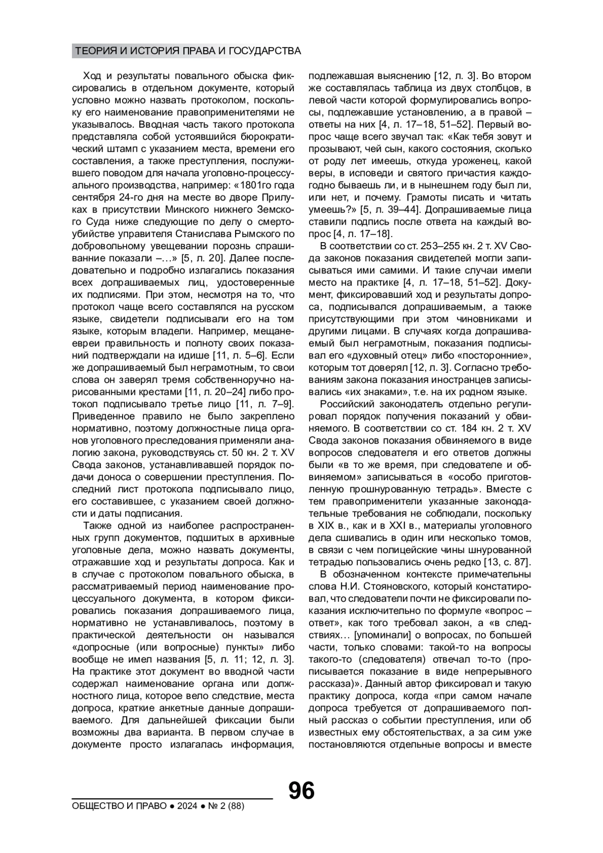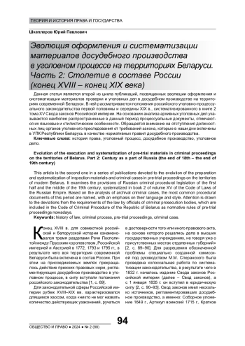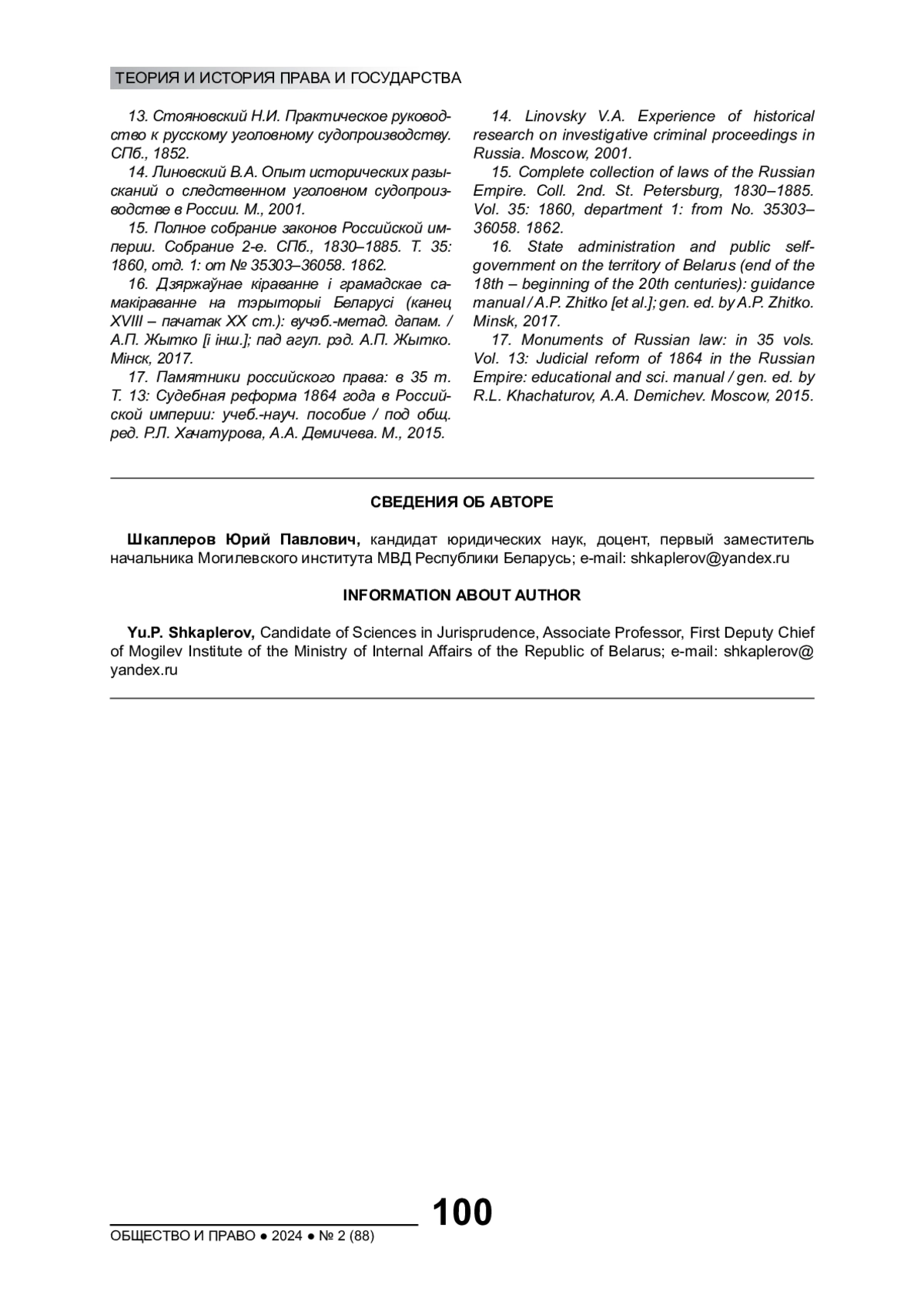 ШКАПЛЕРОВ Ю. П. ЭВОЛЮЦИЯ ОФОРМЛЕНИЯ И СИСТЕМАТИЗАЦИИ МАТЕРИАЛОВ ДОСУДЕБНОГО ПРОИЗВОДСТВА В УГОЛОВНОМ ПРОЦЕССЕ НА ТЕРРИТОРИЯХ БЕЛАРУСИ. ЧАСТЬ 2: СТОЛЕТИЕ В СОСТАВЕ РОССИИ (КОНЕЦ XVIII - КОНЕЦ XIX ВЕКА) // ОБЩЕСТВО И ПРАВО. 2024. № 2 (88)