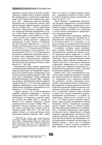 Статья: ЭВОЛЮЦИЯ ОФОРМЛЕНИЯ И СИСТЕМАТИЗАЦИИ МАТЕРИАЛОВ ДОСУДЕБНОГО ПРОИЗВОДСТВА В УГОЛОВНОМ ПРОЦЕССЕ НА ТЕРРИТОРИЯХ БЕЛАРУСИ. ЧАСТЬ 2: СТОЛЕТИЕ В СОСТАВЕ РОССИИ (КОНЕЦ XVIII - КОНЕЦ XIX ВЕКА) (2024)