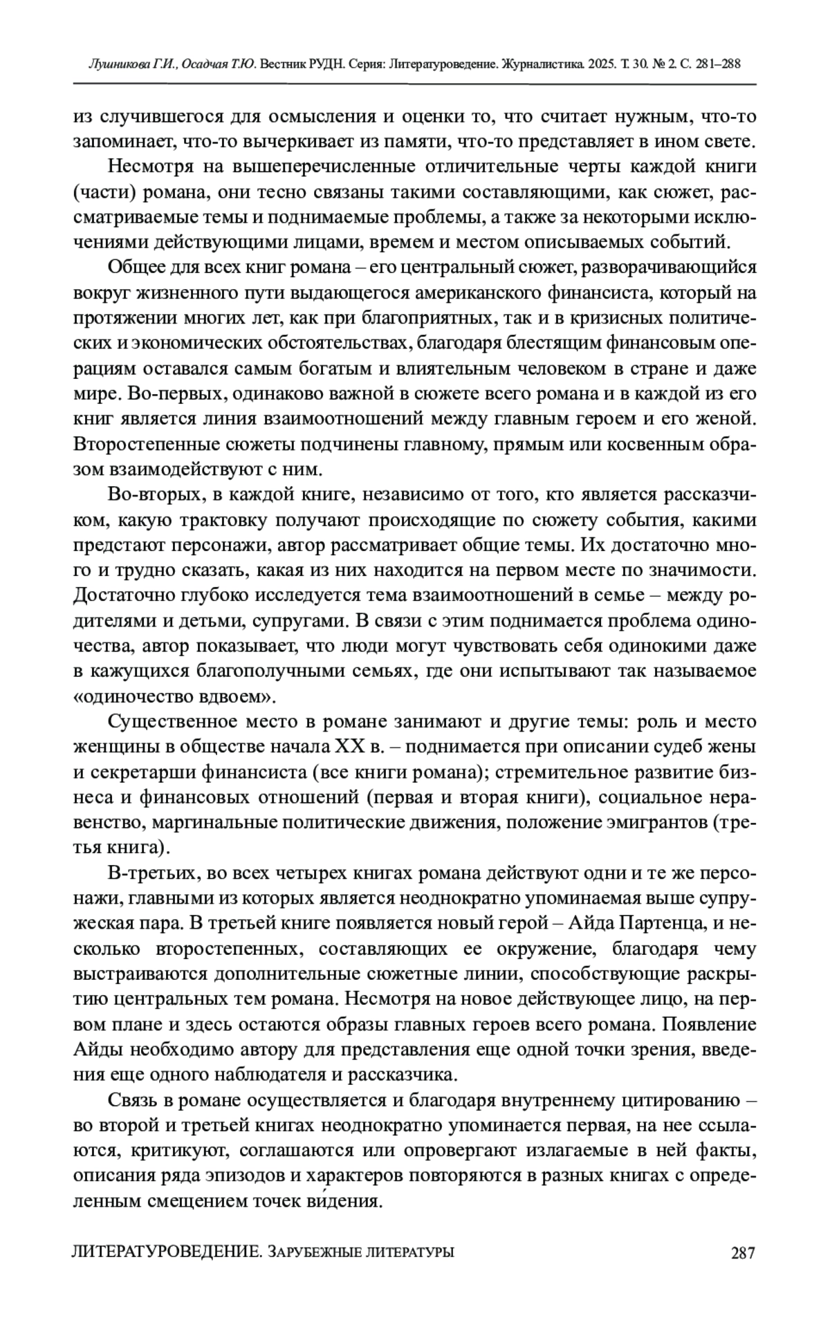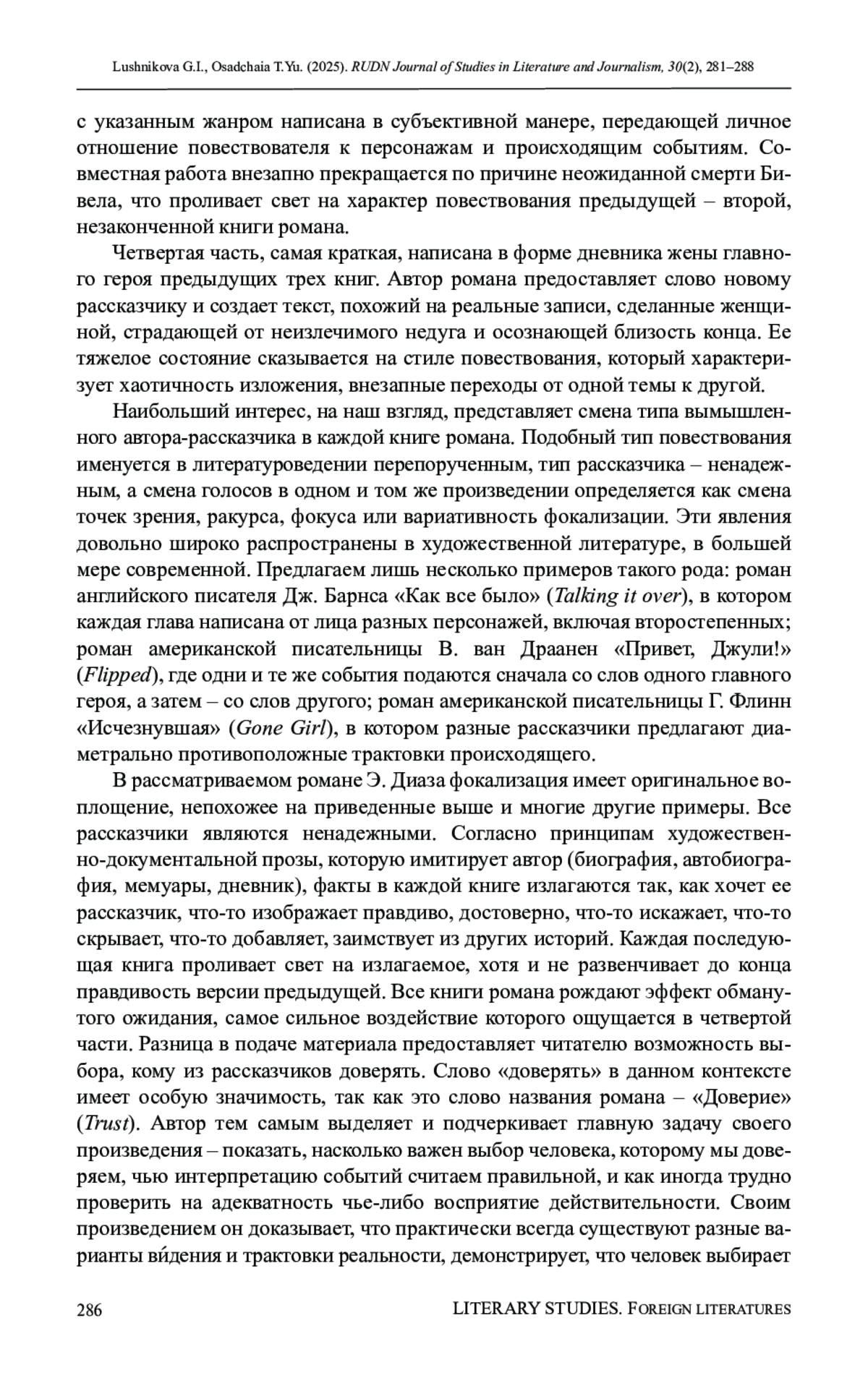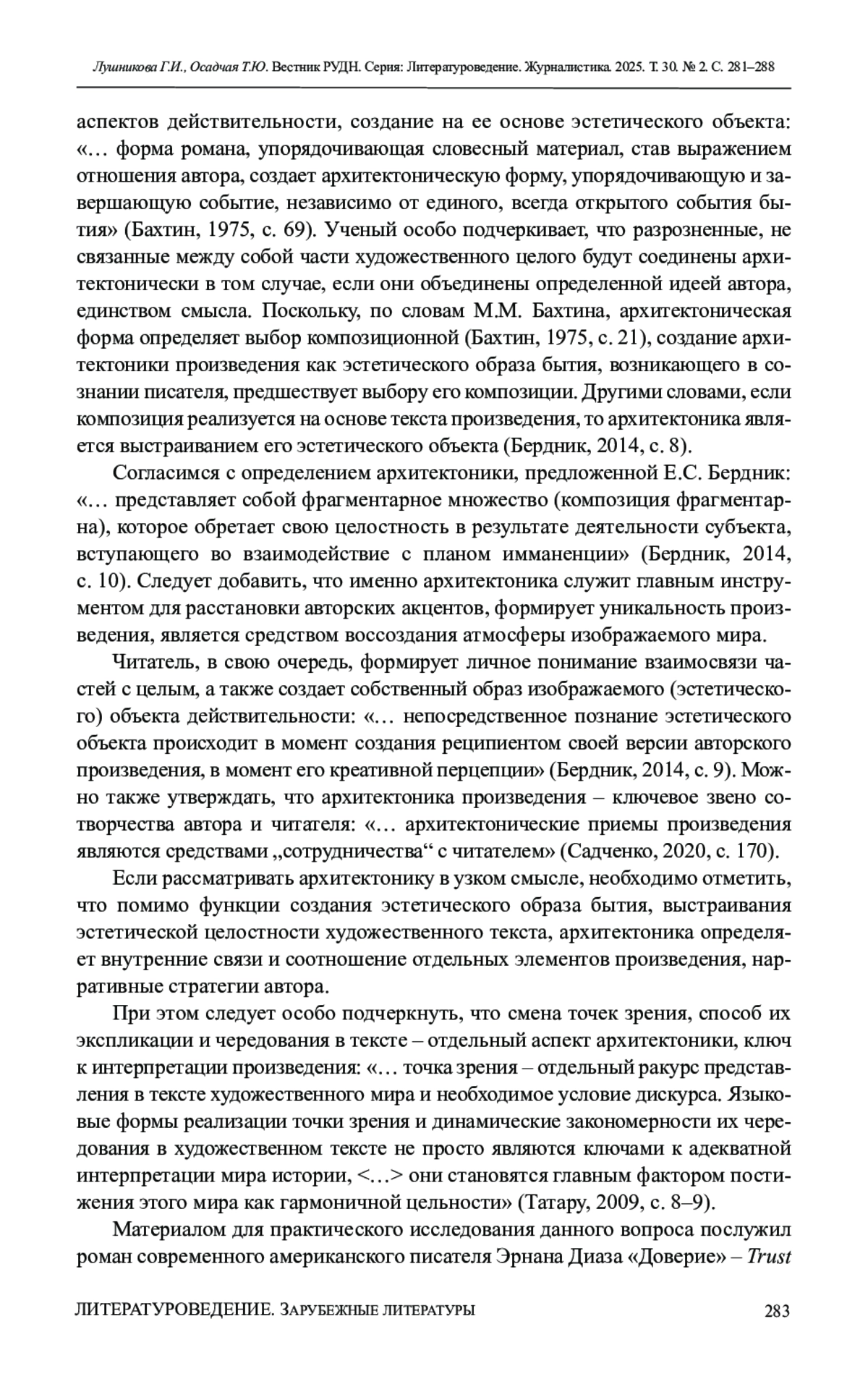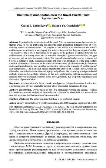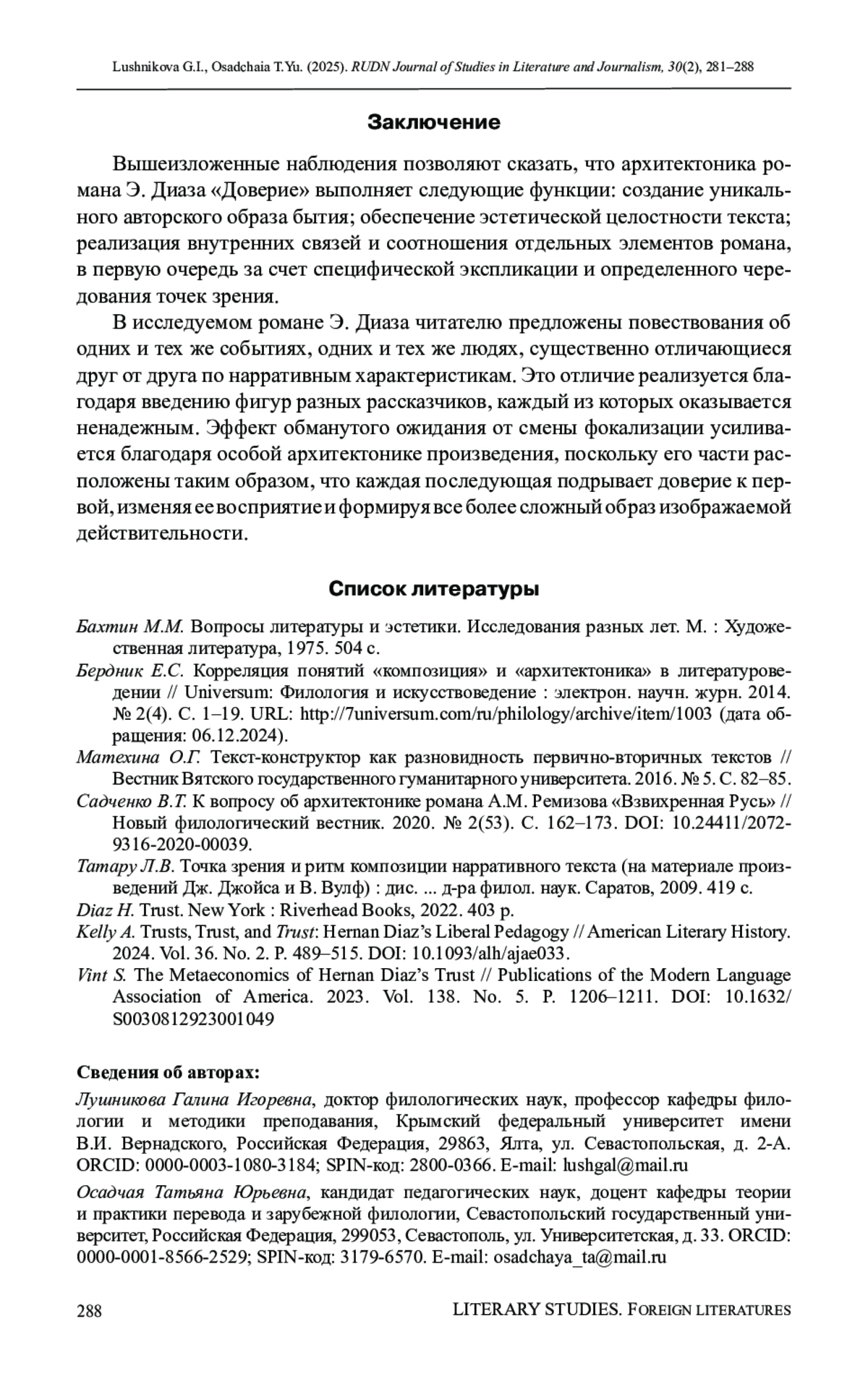 ЛУШНИКОВА Г. И., ОСАДЧАЯ Т. Ю. РОЛЬ АРХИТЕКТОНИКИ В РОМАНЕ-КОНСТРУКТОРЕ Э. ДИАЗА «ДОВЕРИЕ» // ВЕСТНИК РОССИЙСКОГО УНИВЕРСИТЕТА ДРУЖБЫ НАРОДОВ. СЕРИЯ: ЛИТЕРАТУРОВЕДЕНИЕ. ЖУРНАЛИСТИКА. 2025. ТОМ 30 № 2