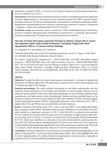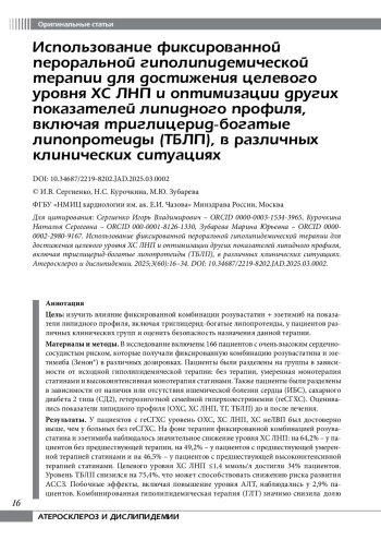 Цель: изучить влияние фиксированной комбинации розувастатин + эзетимиб на показатели липидного профиля, включая триглицерид-богатые липопротеиды, у пациентов различных клинических групп и оценить безопасность назначения данной терапии.