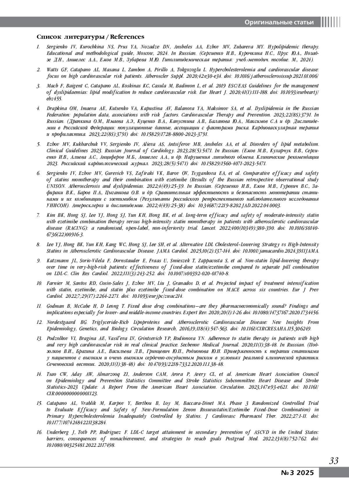 6. Sergienko IV, Ezhov MV, Gurevich VS, Zafiraki VK, Barov OV, Tsygankova EA, et al.Comparative efficacy and safety of statins monotherapy and their combination with ezetimibe (Results of the Russian retrospective observational study UNISON. Atherosclerosis and dyslipidemias. 2022;4(49):25-39. In Russian.
