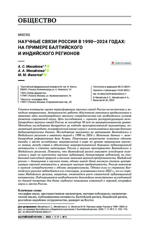 Статья посвящена оценке трансформации научных связей России на восточном и западном направлениях. Актуальность работы обусловлена активным продвижением в практике идеи международного научного сотрудничества как необходимого условия развития современной науки. Цель исследования — оценить реструктуризацию международных научных связей России за последние 30 лет на макрорегиональном уровне. Методика исследования базируется на подходе пространственной наукометрии, позволяющей проводить географический анализ науки с использованием массива больших библиометрических данных. Исследование выполнено на материалах Балтийского и Индийского регионов и охватило период с 1990 по 2024 г. Источник данных — международная реферативная база Scopus. Полученные результаты позволили сделать выводы о месте исследуемых макрорегионов в мире по уровню приращения научного знания, вкладу стран в обеспечение макрорегиональной динамики публикационной активности и степени интеграции России в научное пространство Балтийского и Индийского регионов. Показано, что Балтийский регион занимает устойчивое положение в мире по количеству научных публикаций, демонстрируя небольшой, но стабильный ежегодный прирост и высокие значения научной продуктивности. Индийский регион — динамичнее в научном плане, однако имеет более высокую степень централизации научной активности и меньшую научную продуктивность. Россия вовлечена в научное сотрудничество с обоими макрорегионами. Однако если со странами Балтийского региона наблюдается его стагнация, усилившаяся после 2022 г., то со странами Индийского региона, напротив, отмечается рост совместной публикационной активности. Подчеркивается необходимость дальнейших качественных исследований по данной тематике для более глубокого понимания изменений в мировой географии науки и места России.