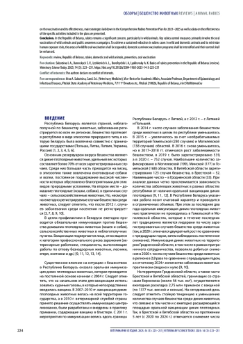 Введение. На современном этапе бешенство продолжает оставаться одним из самых опасных инфекционных заболеваний зоонозной природы. Республика Беларусь является неблагополучной по бешенству животных, при этом заболевание регистрируется во всех регионах страны.
