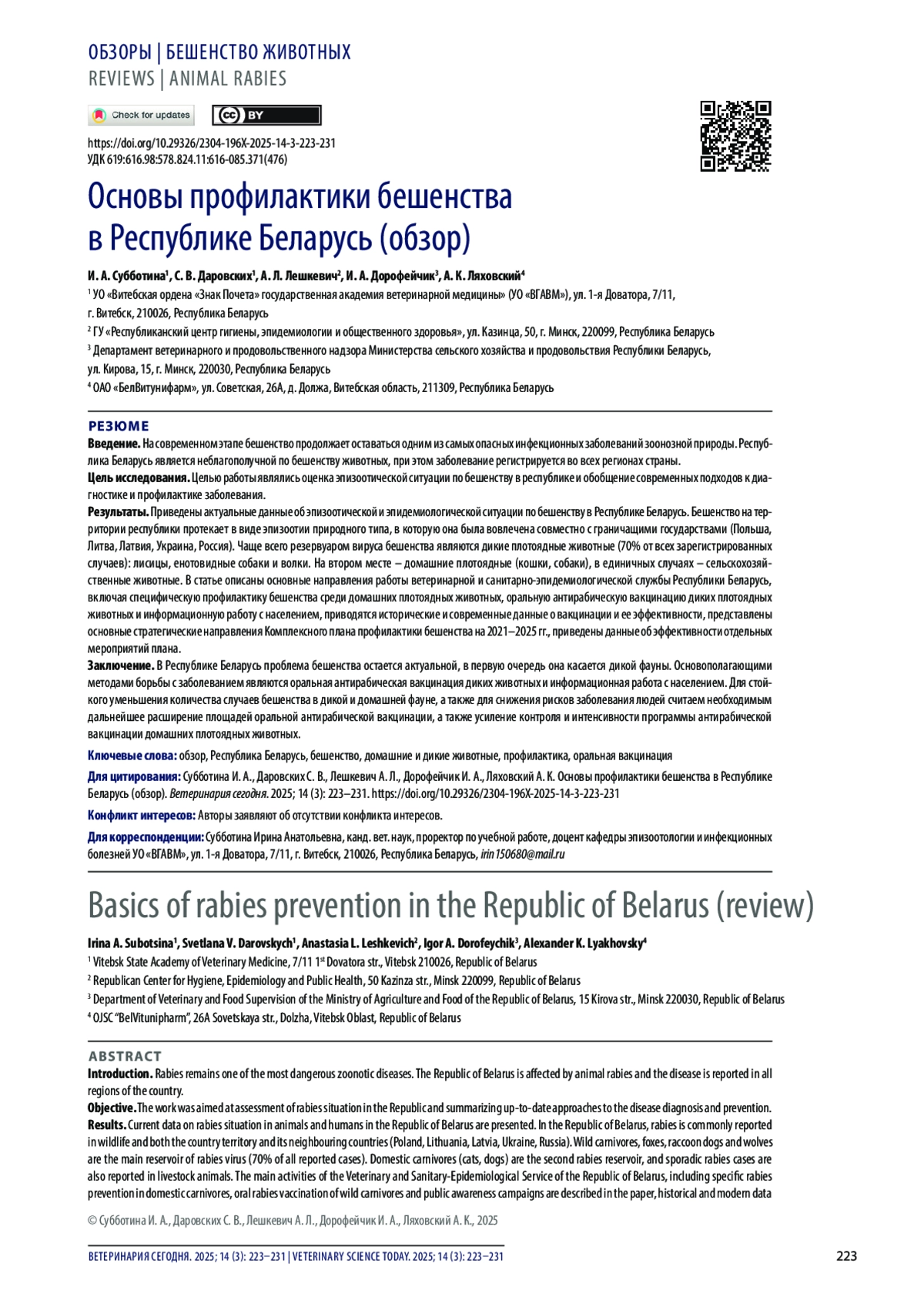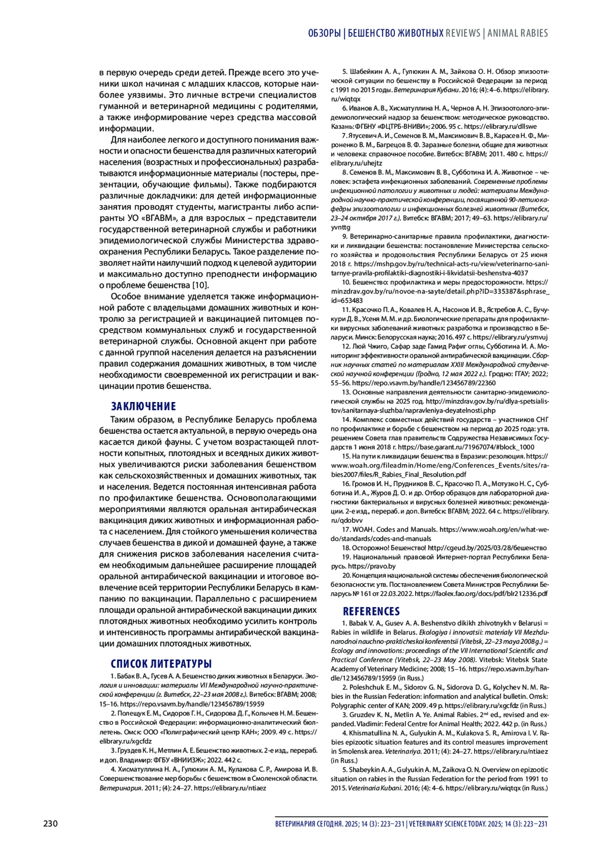 1. Бабак В. А., Гусев А. А. Бешенство диких животных в Беларуси. Экология и инновации: материалы VII Международной научно-практической конференции (г. Витебск, 22-23 мая 2008 г.). Витебск: ВГАВМ; 2008; 15-16. https://repo.vsavm.by/handle/123456789/15959.