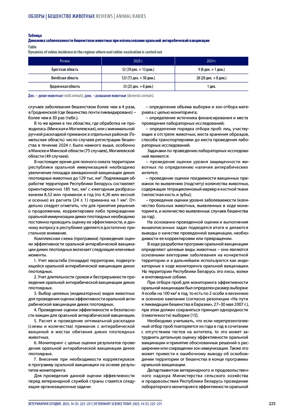 Результаты. Приведены актуальные данные об эпизоотической и эпидемиологической ситуации по бешенству в Республике Беларусь. Бешенство на территории республики протекает в виде эпизоотии природного типа, в которую она была вовлечена совместно с граничащими государствами (Польша, Литва, Латвия, Украина, Россия). Чаще всего резервуаром вируса бешенства являются дикие плотоядные животные (70% от всех зарегистрированных случаев): лисицы, енотовидные собаки и волки. На втором месте – домашние плотоядные (кошки, собаки), в единичных случаях – сельскохозяйственные животные. В статье описаны основные направления работы ветеринарной и санитарно-эпидемиологической службы Республики Беларусь, включая специфическую профилактику бешенства среди домашних плотоядных животных, оральную антирабическую вакцинацию диких плотоядных животных и информационную работу с населением, приводятся исторические и современные данные о вакцинации и ее эффективности, представлены основные стратегические направления Комплексного плана профилактики бешенства на 2021–2025 гг., приведены данные об эффективности отдельных мероприятий плана.