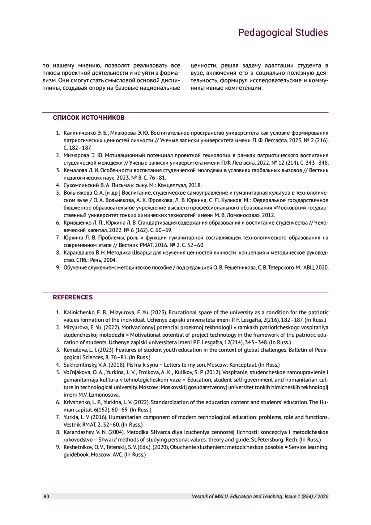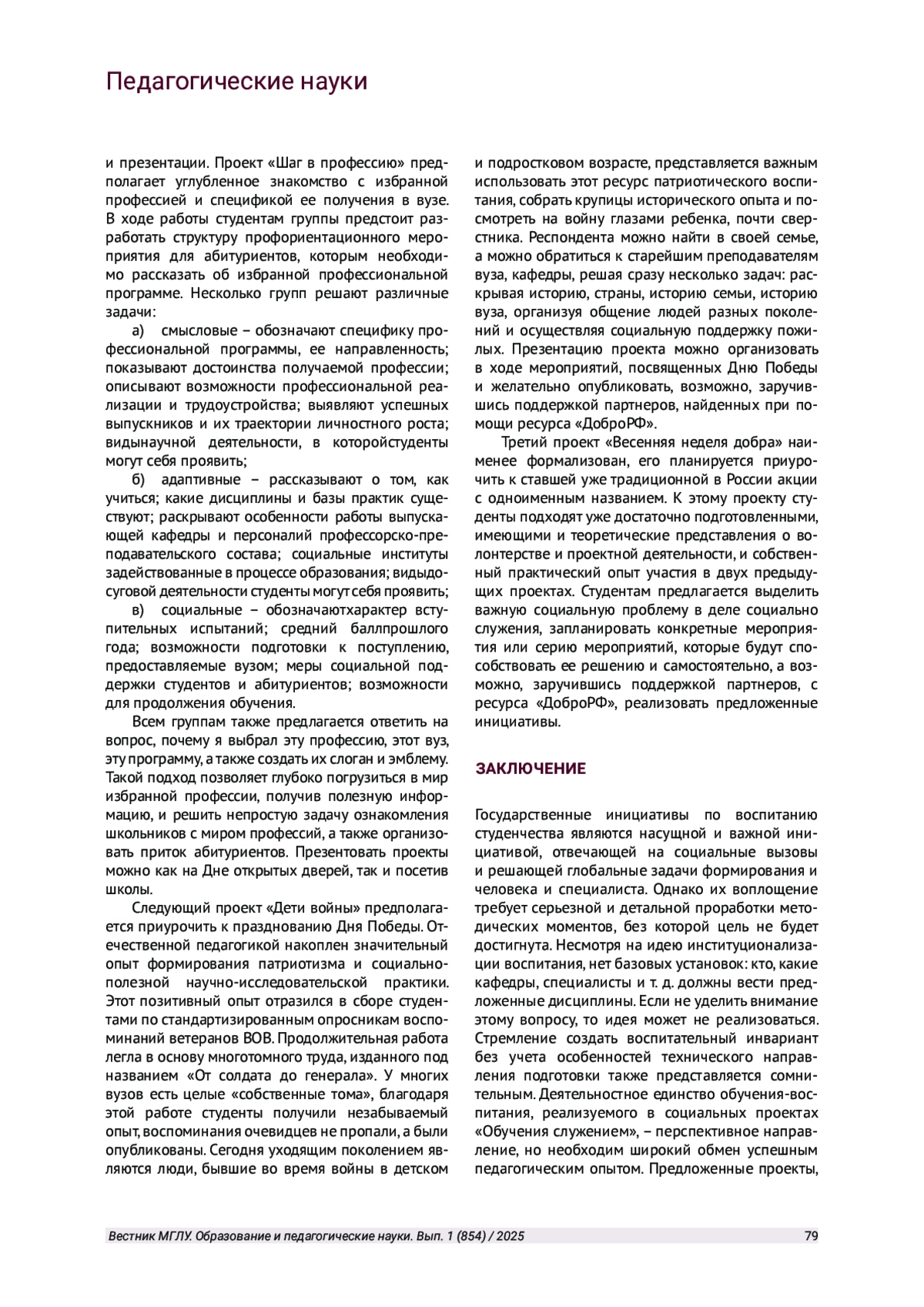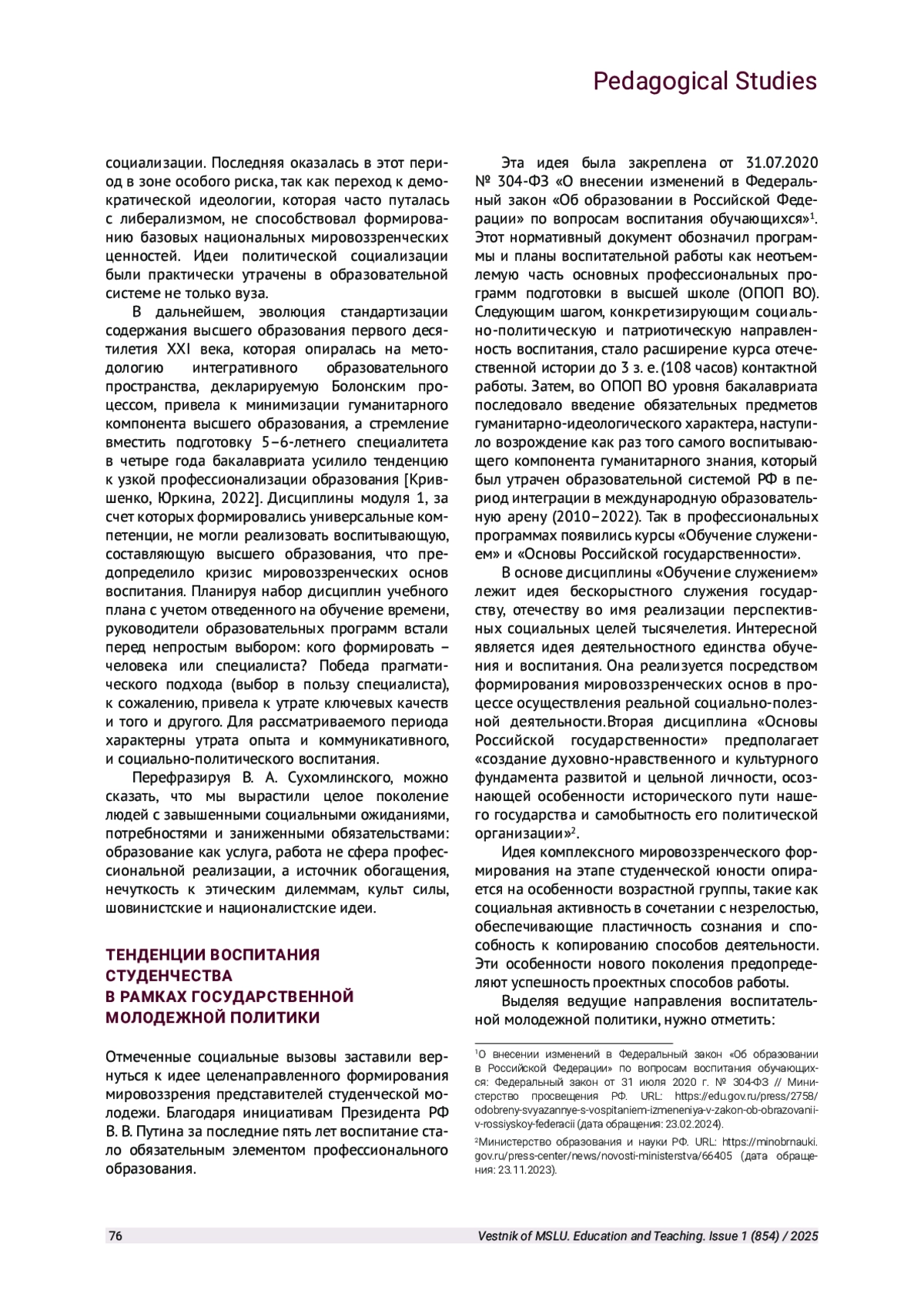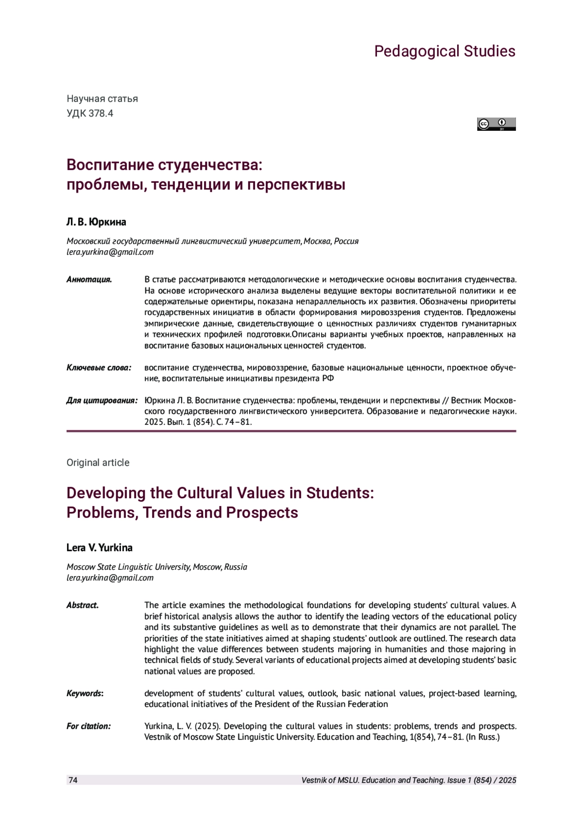 ЮРКИНА Л. В. ВОСПИТАНИЕ СТУДЕНЧЕСТВА: ПРОБЛЕМЫ, ТЕНДЕНЦИИ И ПЕРСПЕКТИВЫ // ВЕСТНИК МОСКОВСКОГО ГОСУДАРСТВЕННОГО ЛИНГВИСТИЧЕСКОГО УНИВЕРСИТЕТА. ОБРАЗОВАНИЕ И ПЕДАГОГИЧЕСКИЕ НАУКИ. 2025. № 1 (854)