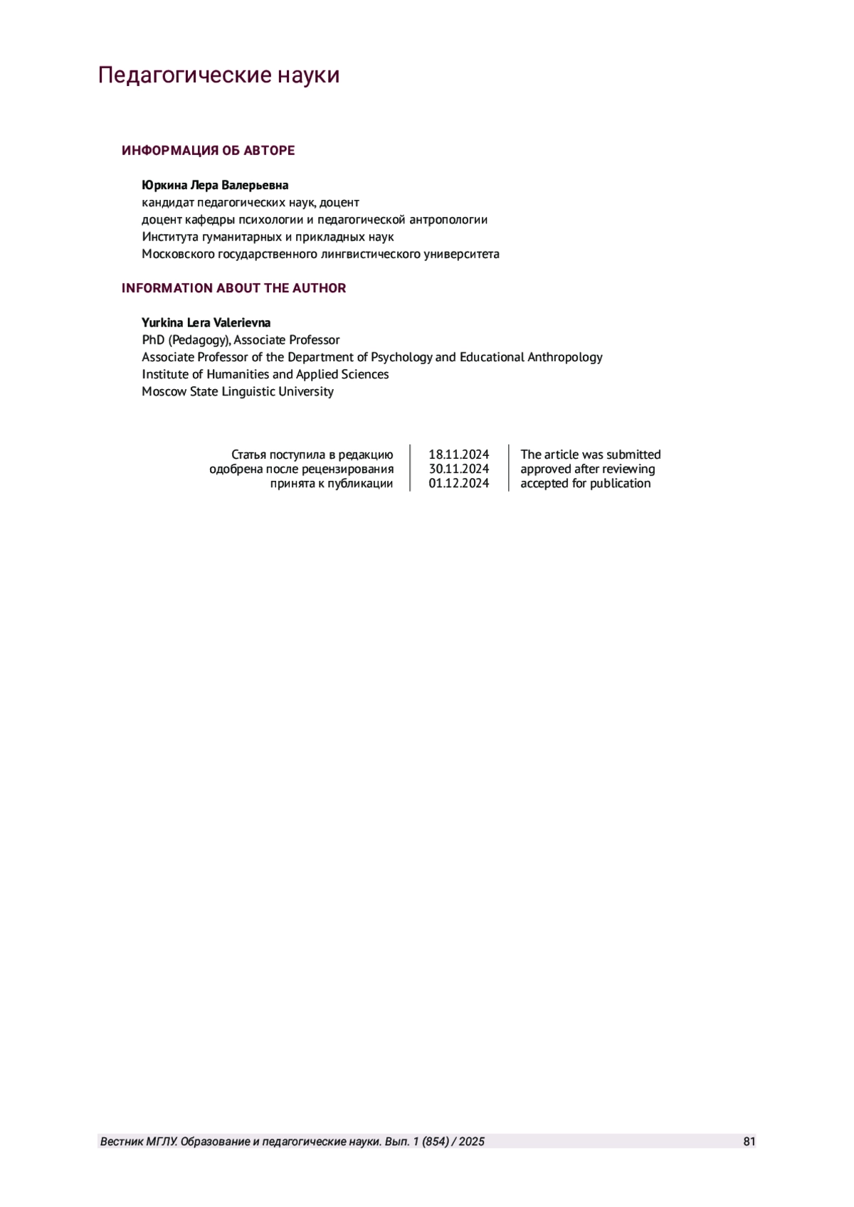 Журнал: ВЕСТНИК МОСКОВСКОГО ГОСУДАРСТВЕННОГО ЛИНГВИСТИЧЕСКОГО УНИВЕРСИТЕТА. ОБРАЗОВАНИЕ И ПЕДАГОГИЧЕСКИЕ НАУКИ