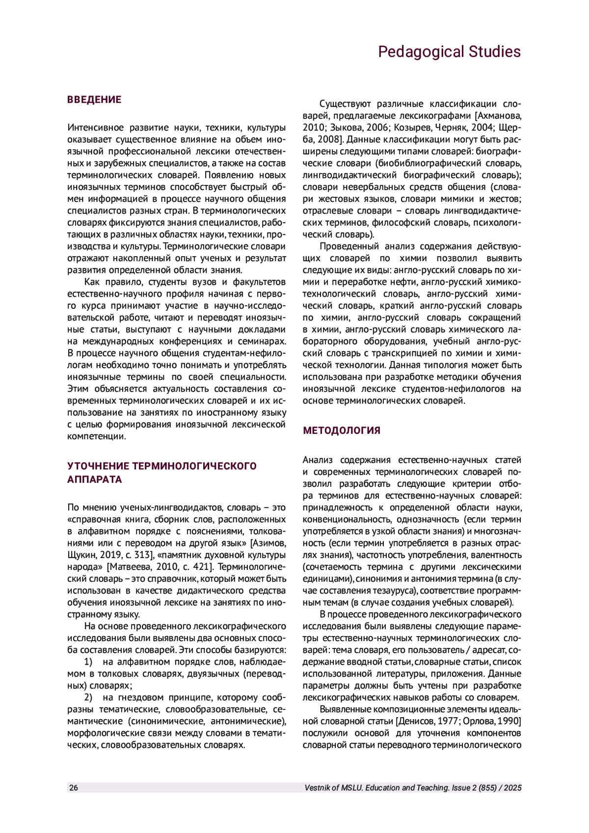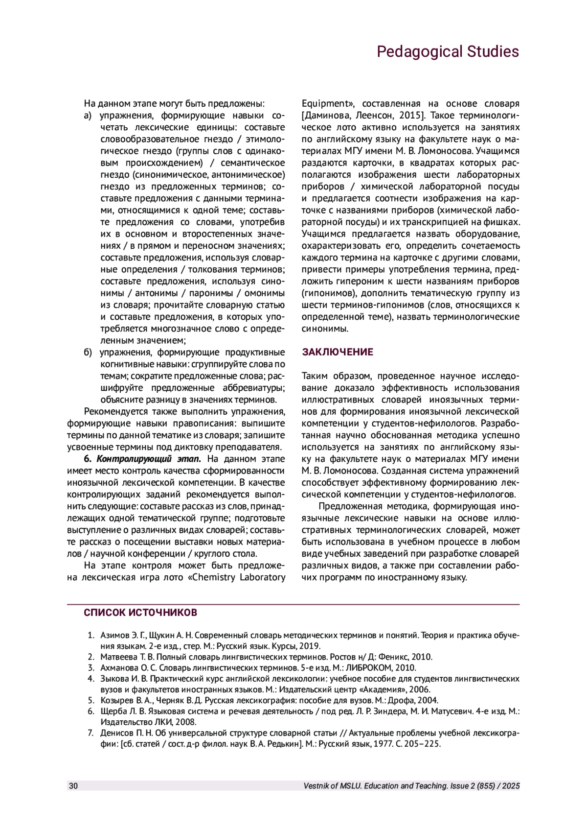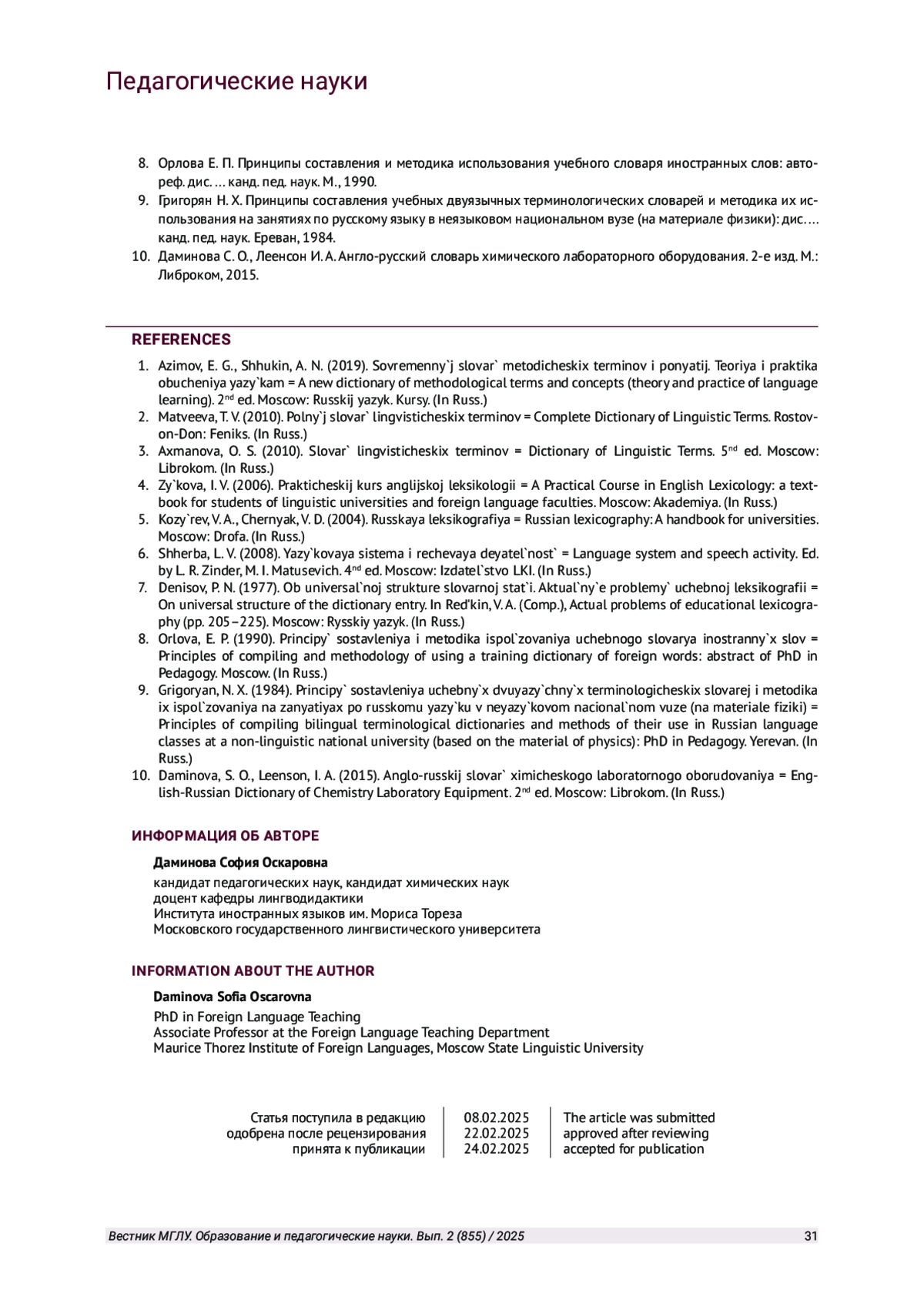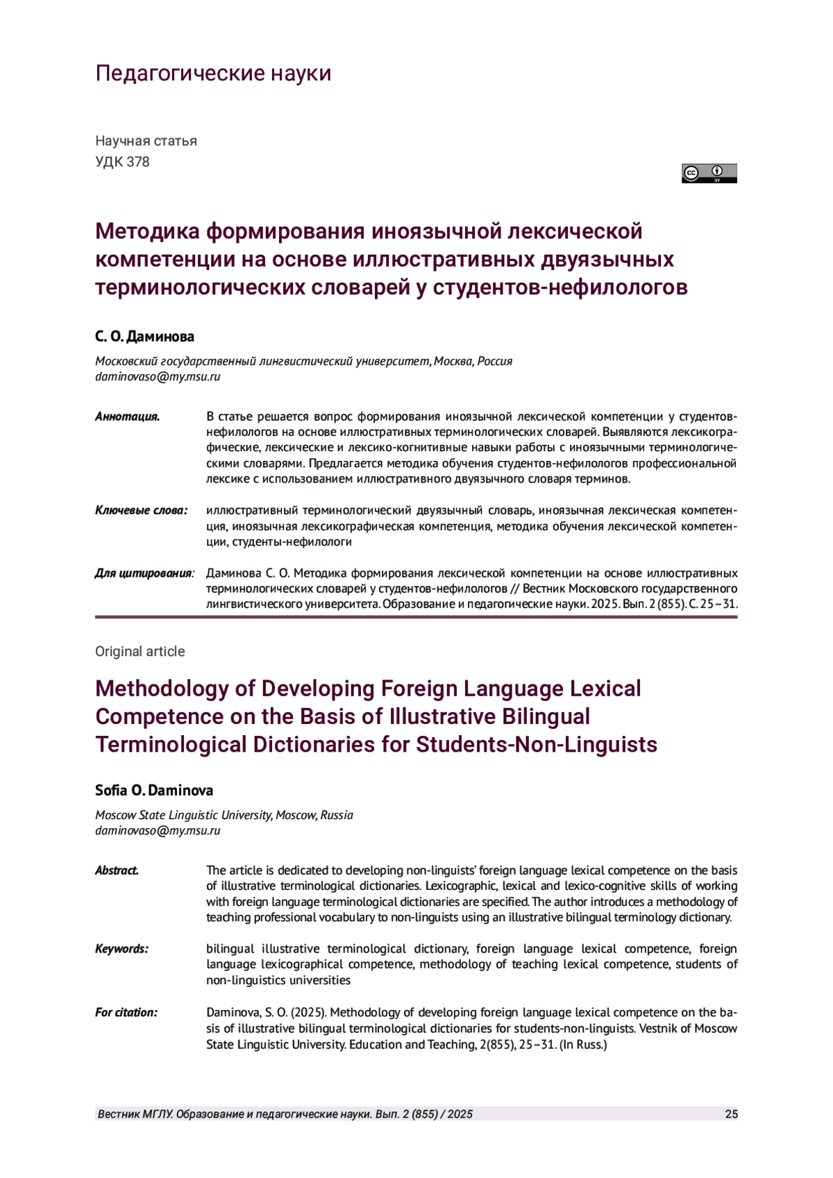 ДАМИНОВА С. О. МЕТОДИКА ФОРМИРОВАНИЯ ИНОЯЗЫЧНОЙ ЛЕКСИЧЕСКОЙ КОМПЕТЕНЦИИ НА ОСНОВЕ ИЛЛЮСТРАТИВНЫХ ДВУЯЗЫЧНЫХ ТЕРМИНОЛОГИЧЕСКИХ СЛОВАРЕЙ У СТУДЕНТОВ-НЕФИЛОЛОГОВ // ВЕСТНИК МОСКОВСКОГО ГОСУДАРСТВЕННОГО ЛИНГВИСТИЧЕСКОГО УНИВЕРСИТЕТА. ОБРАЗОВАНИЕ И ПЕДАГОГИЧЕСКИЕ НАУКИ. 2025. № 2 (855)