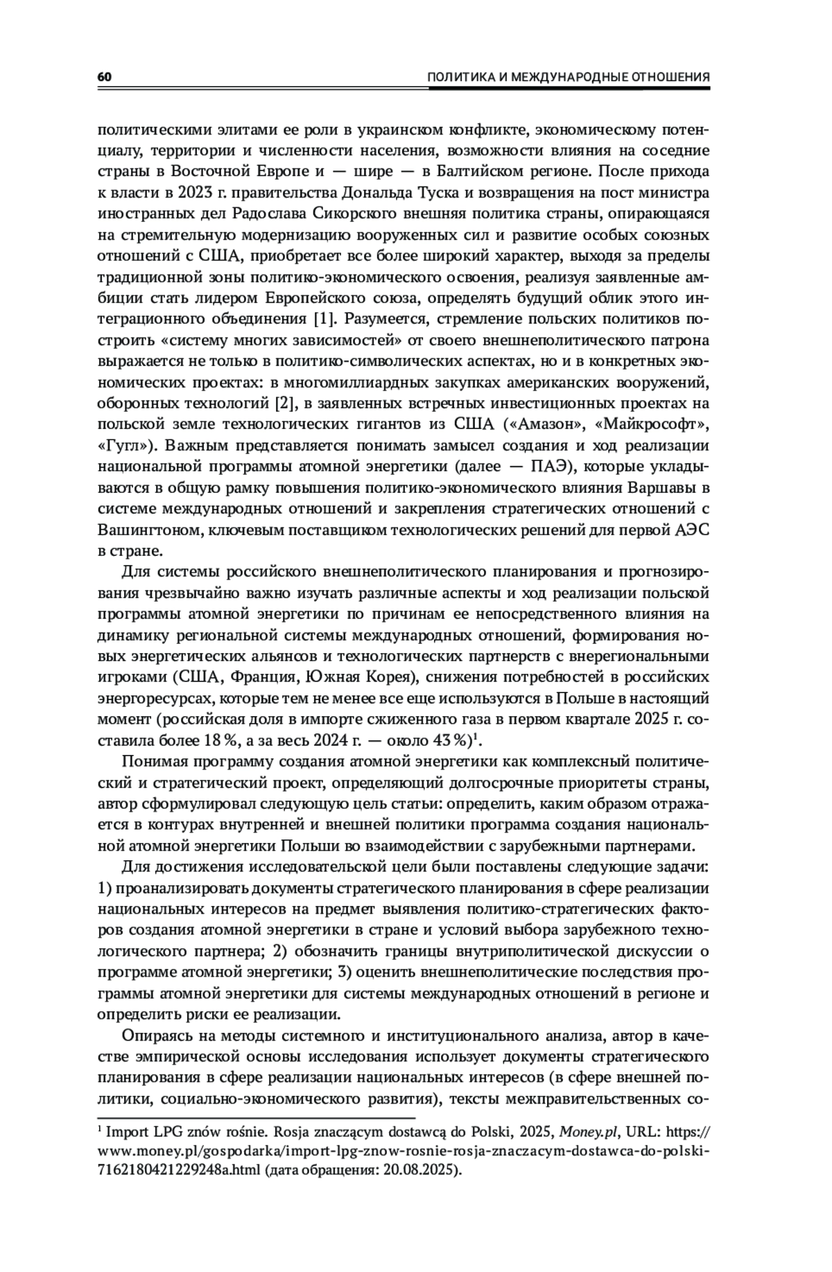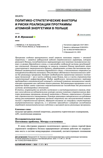 В статье, опирающейся на методы системного и институционального анализа, впервые в российском исследовательском контуре изучены политико-стратегические факторы реализации программы атомной энергетики в Польше, отраженные в документах стратегического планирования. В рамках реализации эмпирического исследования автор рассматривает программу атомной энергетики как многоаспектный политический и стратегический проект, обращает внимание на специфику сопутствующих внутриполитических процессов, а в качестве прикладного измерения исследования определяет внешнеполитические следствия и оценивает риски реализации программы.