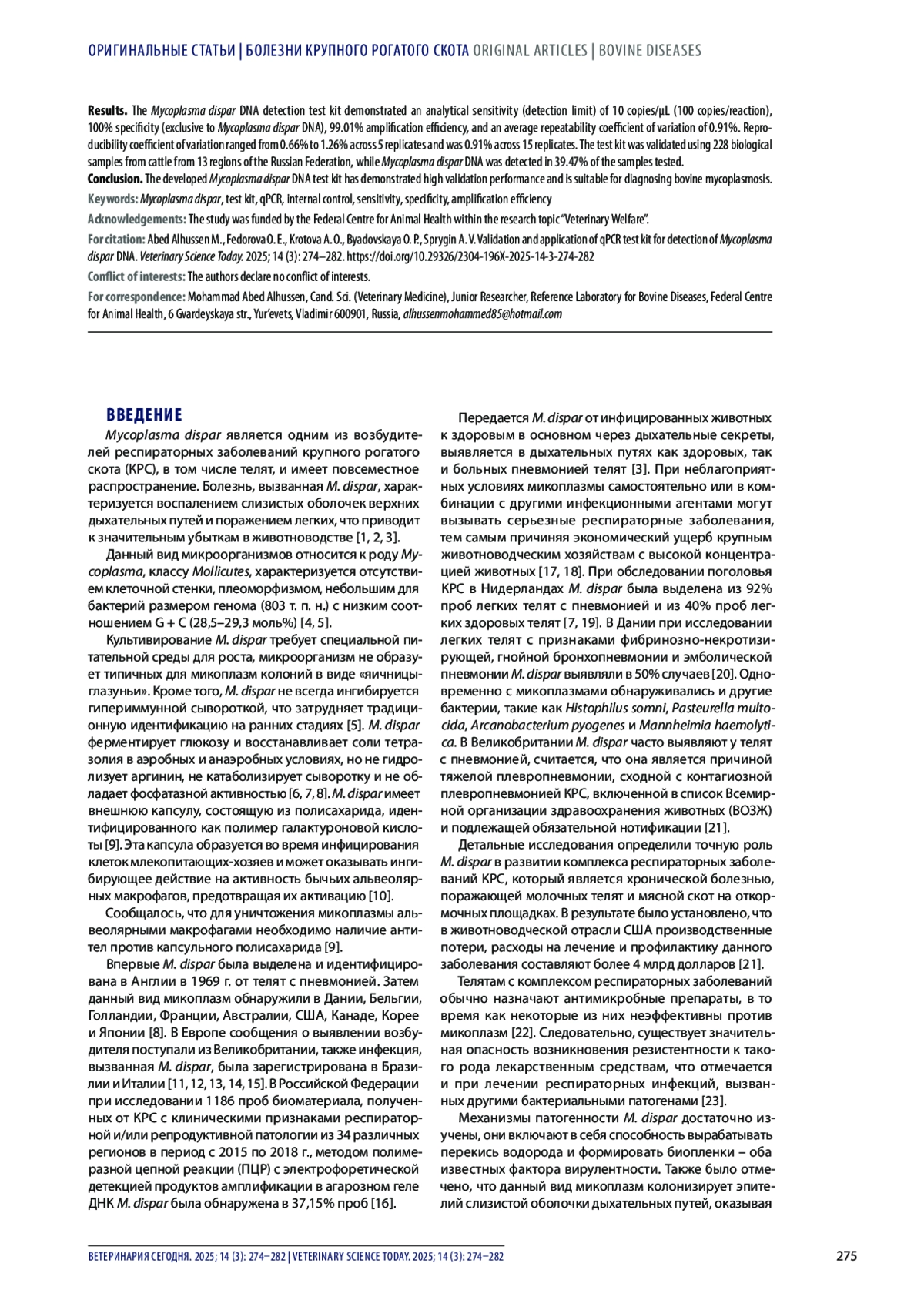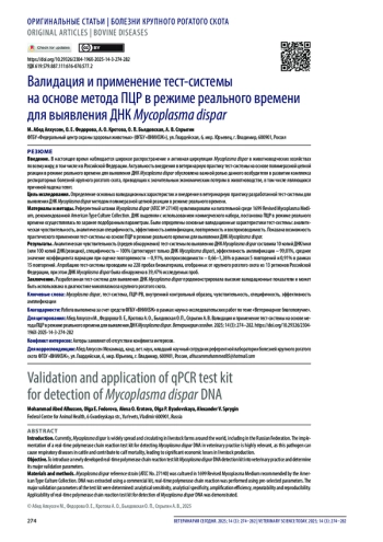 Введение. В настоящее время наблюдается широкое распространение и активная циркуляция Mycoplasma dispar в животноводческих хозяйствах по всему миру, в том числе и в Российской Федерации. Актуальность внедрения в ветеринарную практику тест-системы на основе полимеразной цепной реакции в режиме реального времени для выявления ДНК Mycoplasma dispar обусловлена важной ролью данного возбудителя в развитии комплекса респираторных болезней крупного рогатого скота, приводящих к значительным экономическим потерям в животноводстве, в том числе являющихся причиной падежа телят.