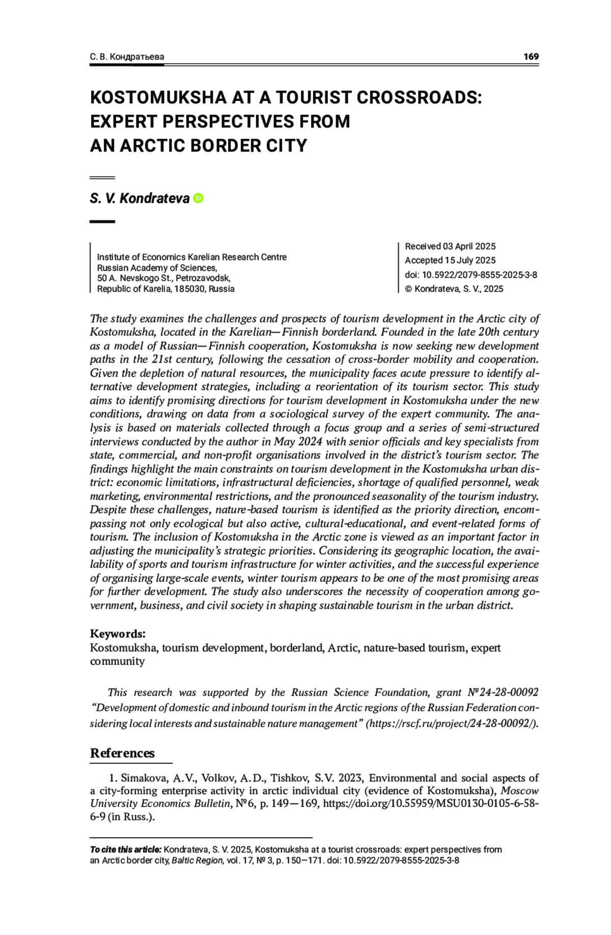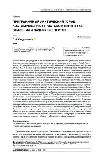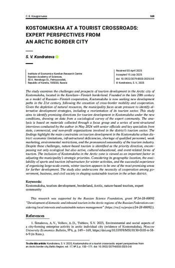 Исследование фокусируется на проблематике туристского развития арктического Костомукшского муниципального округа в карело-финском приграничье. Город Костомукша, сформированный как образец российско-финляндского сотрудничества в конце XX в., в XXI в. в связи с прекращением трансграничных перемещений и приграничного сотрудничества ищет новые пути своего развития. В связи с исчерпаемостью природных ресурсов перед муниципалитетом остро стоит вызов выстраивания новых направлений развития, включая переориентацию сферы туризма. Цель — выявление направлений туристского развития приграничного г. Костомукша в новых условиях на основе данных социологического опроса экспертного сообщества. Обобщены данные работы фокус-группы и серии полуформализованных интервью, проведенных автором (май 2024 г.) с руководителями и ключевыми специалистами государственных, коммерческих и некоммерческих организаций, связанных с развитием туризма в округе. Выявлены основные ограничения развития туризма в Костомукшском муниципальном округе: экономические, инфраструктурные, кадровые, маркетинговые, природоохранные, а также сезонность туристского бизнеса. Природоориентированный туризм является приоритетным видом туризма в муниципалитете, подразумевая не только экологический, но и активный, культурно-познавательный, событийный и иные виды. Включение Костомукшского муниципального округа в Арктическую зону представляется одним из направлений корректировки стратегических приоритетов муниципалитета. С учетом специфики локации округа, обеспеченности спортивно-туристской инфраструктурой для зимних видов туризма, успешного опыта организации событийных мероприятий одним из перспективных туристских направлений представляется развитие зимних видов туризма. Исследование выявило необходимость кооперации и взаимодействия сегментов триады «власть — бизнес — общество» в сфере туризма.
