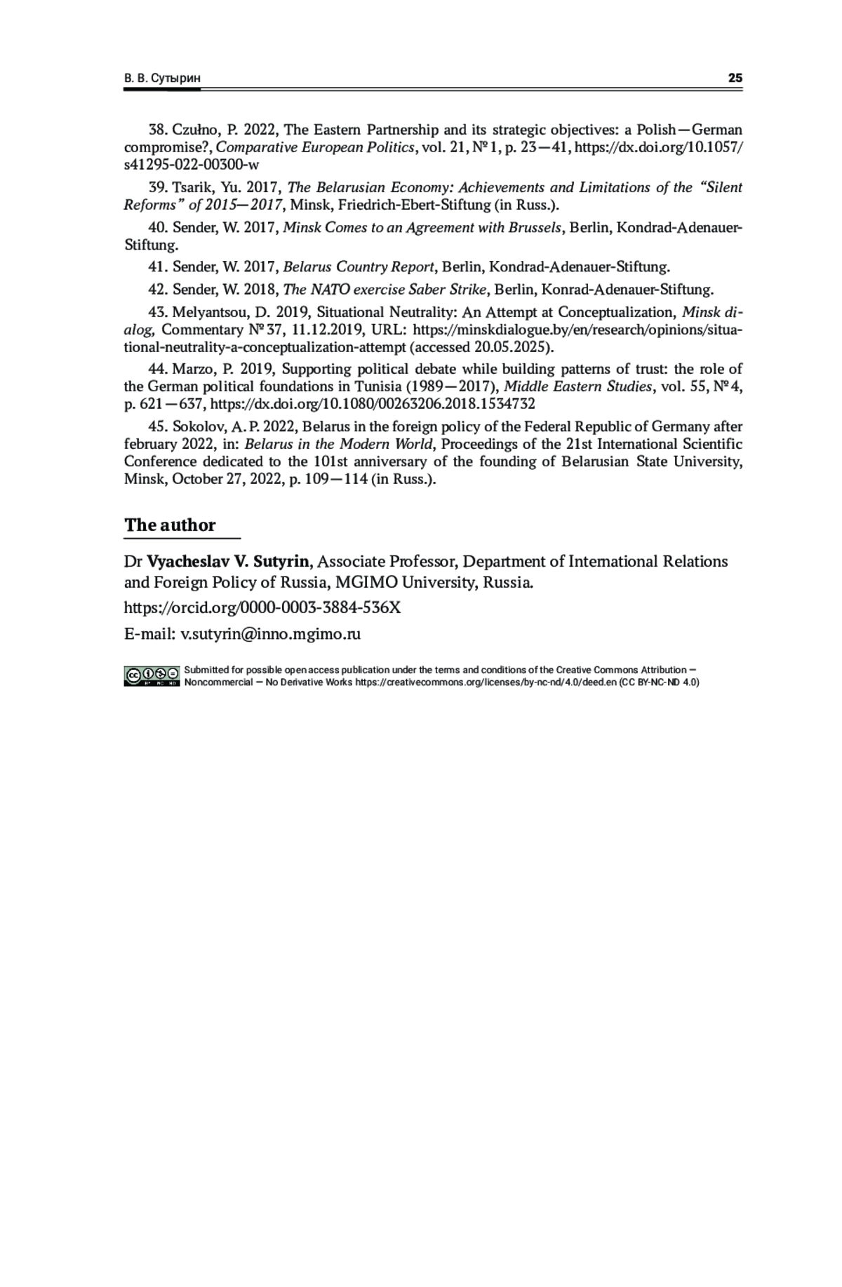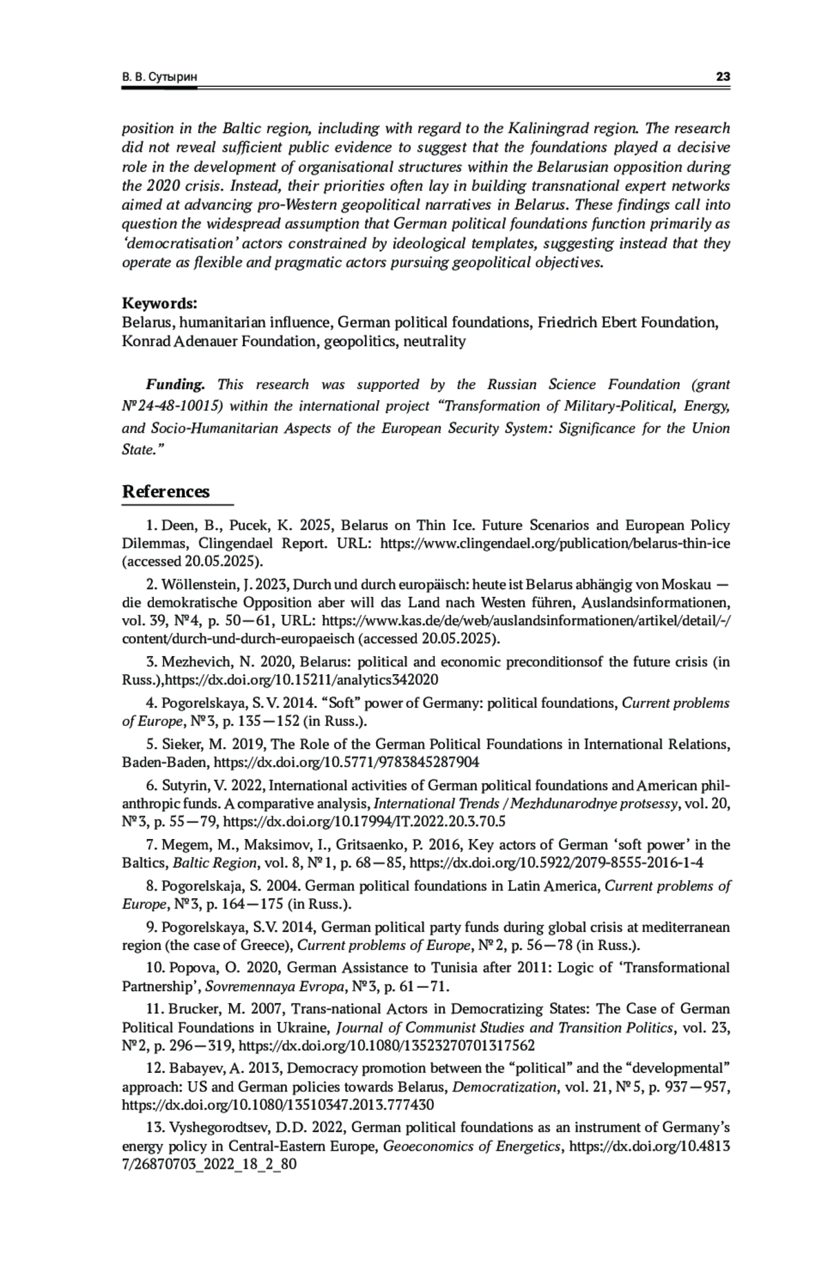 6. Сутырин, В. В. 2022, Финансы для либерального порядка. Cравнительный анализ международной деятельности политических фондов ФРГ и филантропических фондов США, Международные процессы, т. 20, No 3, с. 55—79, EDN: DIIOHV, https://doi.org/10.17994/