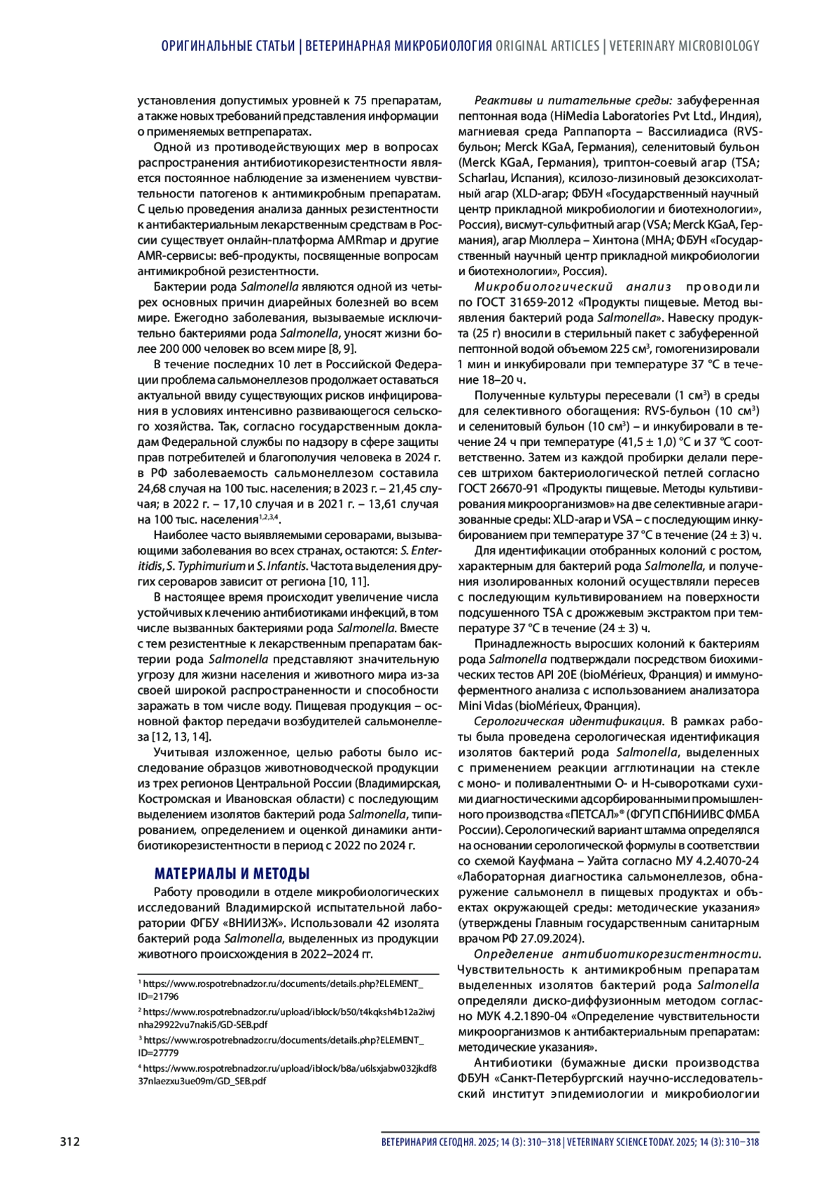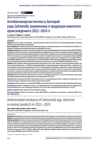Заключение. Показано значительное распространение устойчивости к антимикробным препаратам, в том числе множественной, среди изолятов бактерий рода Salmonella, выявленных в продукции животного происхождения в 2022–2024 гг.