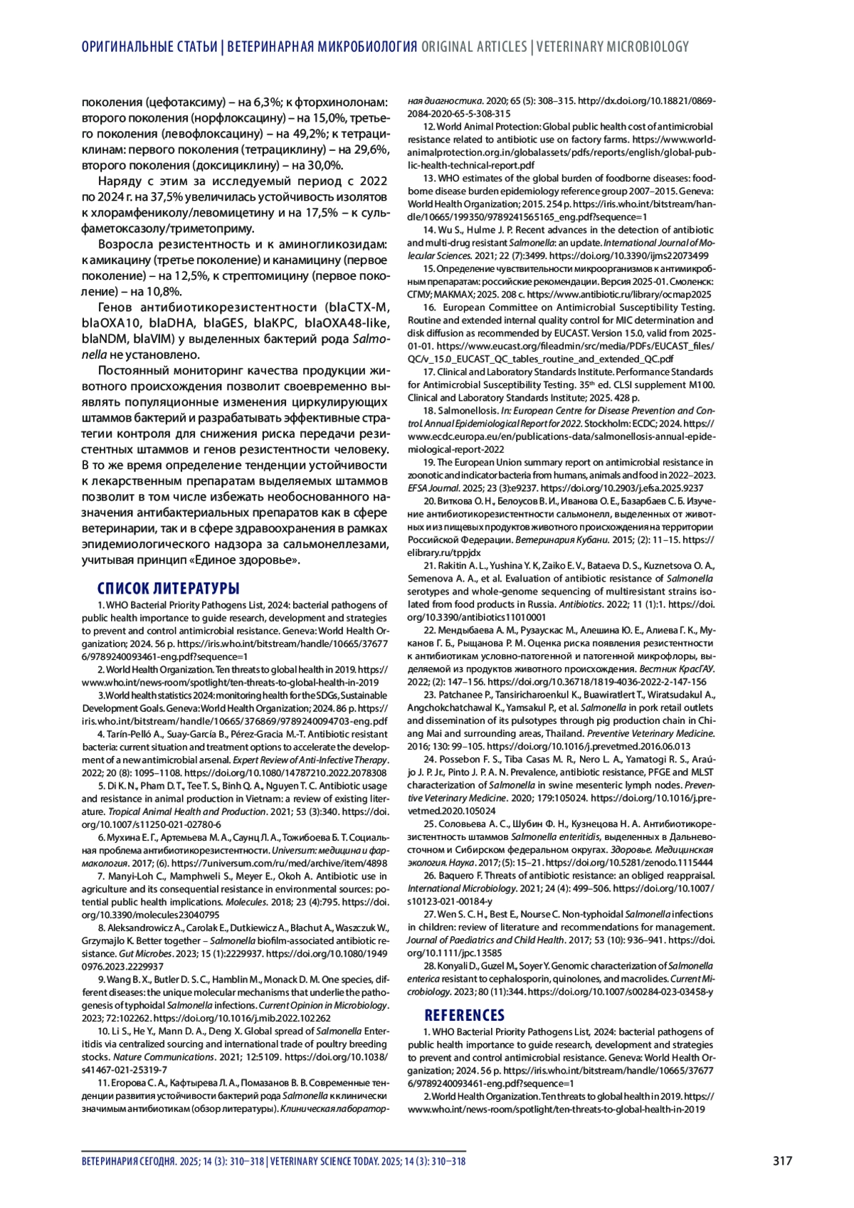 11. Егорова С. А., Кафтырева Л. А., Помазанов В. В. Современные тенденции развития устойчивости бактерий рода Salmonella к клинически значимым антибиотикам (обзор литературы). Клиническая лабораторная диагностика. 2020; 65 (5): 308-315. DOI: 10.18821/0869-2084-2020-65-5-308-315