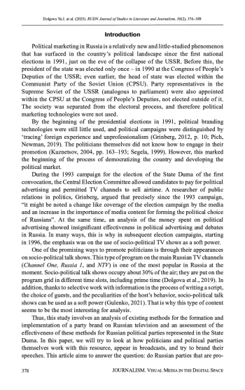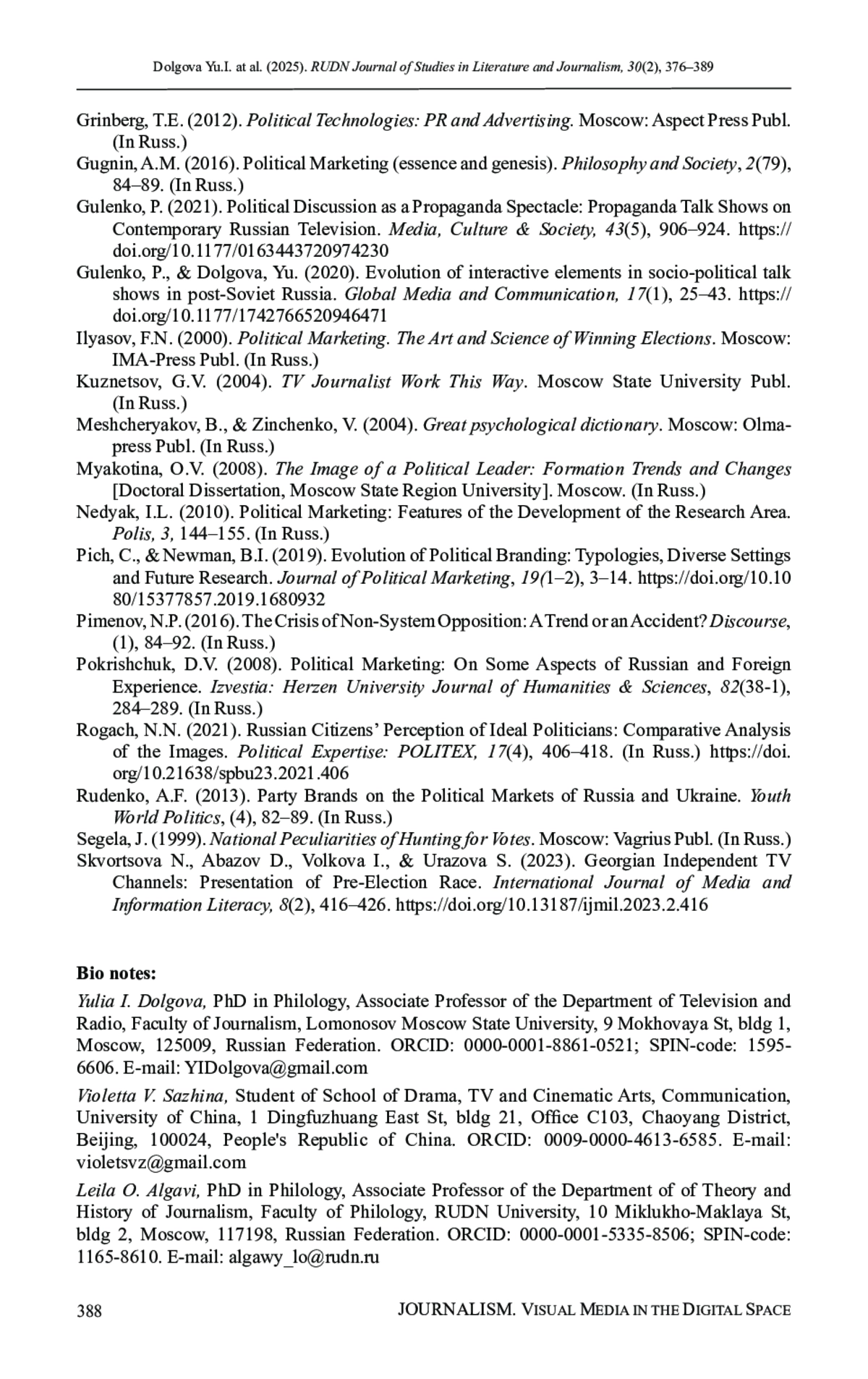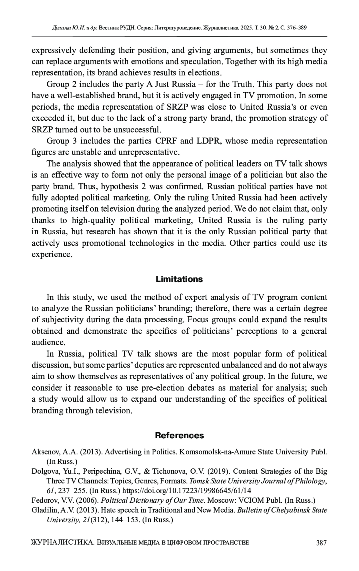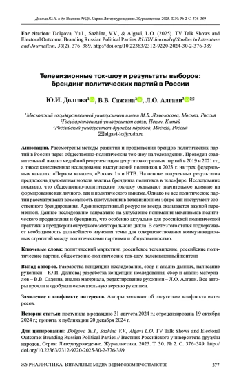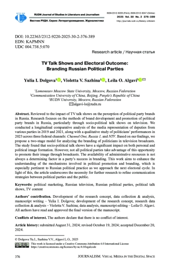 ДОЛГОВА Ю. И., САЖИНА В. В., АЛГАВИ Л. О. ТЕЛЕВИЗИОННЫЕ ТОК-ШОУ И РЕЗУЛЬТАТЫ ВЫБОРОВ: БРЕНДИНГ ПОЛИТИЧЕСКИХ ПАРТИЙ В РОССИИ // ВЕСТНИК РОССИЙСКОГО УНИВЕРСИТЕТА ДРУЖБЫ НАРОДОВ. СЕРИЯ: ЛИТЕРАТУРОВЕДЕНИЕ. ЖУРНАЛИСТИКА. 2025. ТОМ 30 № 2