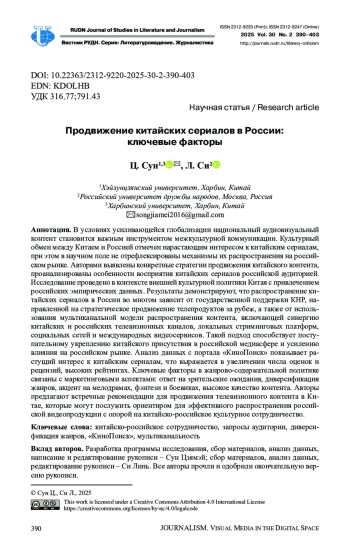 В условиях усиливающейся глобализации национальный аудиовизуальный контент становится важным инструментом межкультурной коммуникации. Культурный обмен между Китаем и Россией отмечен нарастающим интересом к китайским сериалам, при этом в научном поле не отрефлексированы механизмы их распространения на российском рынке. Авторами выявлены конкретные стратегии продвижения китайского контента, проанализированы особенности восприятия китайских сериалов российской аудиторией. Исследование проведено в контексте внешней культурной политики Китая с привлечением российских эмпирических данных. Результаты демонстрируют, что распространение китайских сериалов в России во многом зависит от государственной поддержки КНР, направленной на стратегическое продвижение телепродуктов за рубеж, а также от использования мультиканальной модели распространения контента, включающей синергию китайских и российских телевизионных каналов, локальных стриминговых платформ, социальных сетей и международных видеосервисов. Такой подход способствует поступательному укреплению китайского присутствия в российской медиасфере и усилению влияния на российском рынке. Анализ данных с портала «КиноПоиск» показывает растущий интерес к китайским сериалам, что выражается в увеличении числа оценок и рецензий, высоких рейтингах. Ключевые факторы в жанрово-содержательной политике связаны с маркетинговыми аспектами: ответ на зрительские ожидания, диверсификация жанров, акцент на мелодрамах, фэнтези и боевиках, высокое качество контента. Авторы предлагают встречные рекомендации для продвижения телевизионного контента в Китае, которые могут послужить ориентиром для эффективного распространения российской видеопродукции с опорой на китайско-российское культурное сотрудничество.