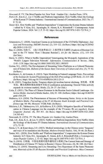 3. Ван С.王晓娟, 中国电视剧对俄传播现状与策略 [Современное состояние и стратегия распространения китайских телесериалов в России] // Китайское телевидение. 2019. № 8. С. 96-100.