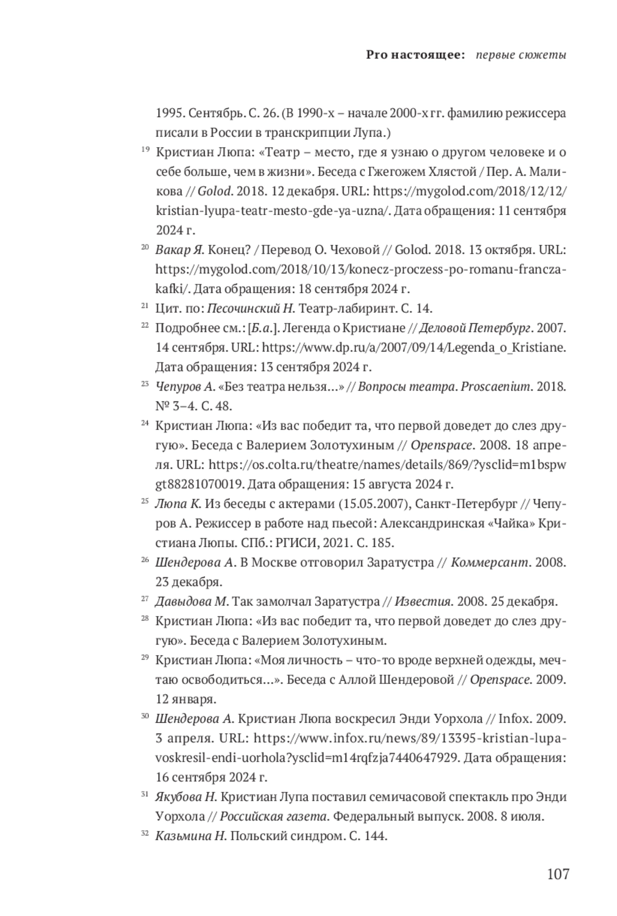 18. Кристиан Люпа: “Театр - место, где я узнаю о другом человеке и о себе больше, чем в жизни”. Беседа с Гжегожем Хлястой / Пер. А. Маликова // Golod. 2018. 12 декабря. URL: https://mygolod.com/2018/12/12/kristian-lyupa-teatr-mesto-gde-ya-uzna/ (Дата обращения: 11 сентября 2024 г.).