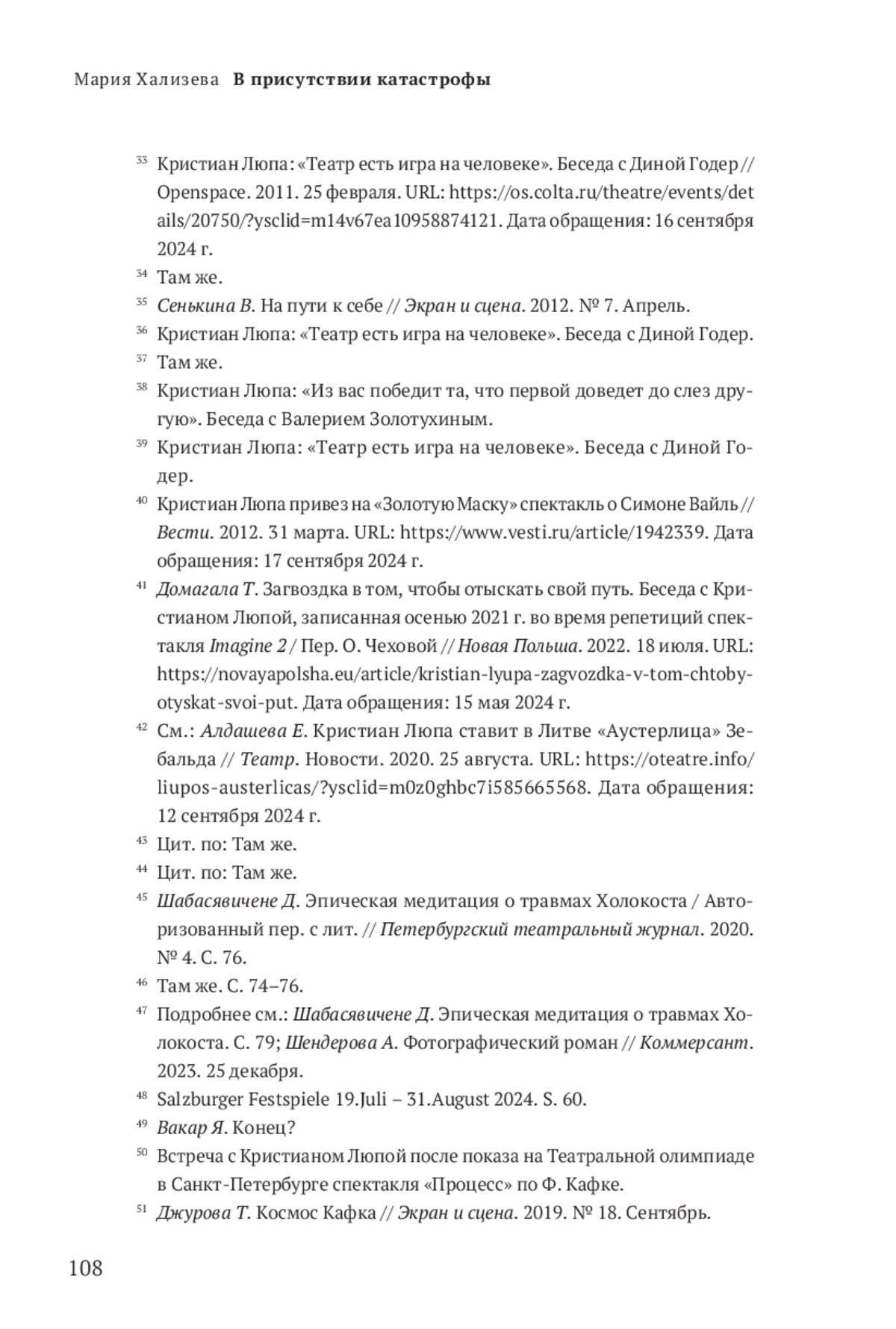 32. Кристиан Люпа: “Театр есть игра на человеке”. Беседа с Диной Годер // Openspace. 2011. 25 февраля. URL: https://os.colta.ru/theatre/events/details/20750/?ysclid=m14v67ea10958874121 (Дата обращения: 16 сентября 2024 г.).