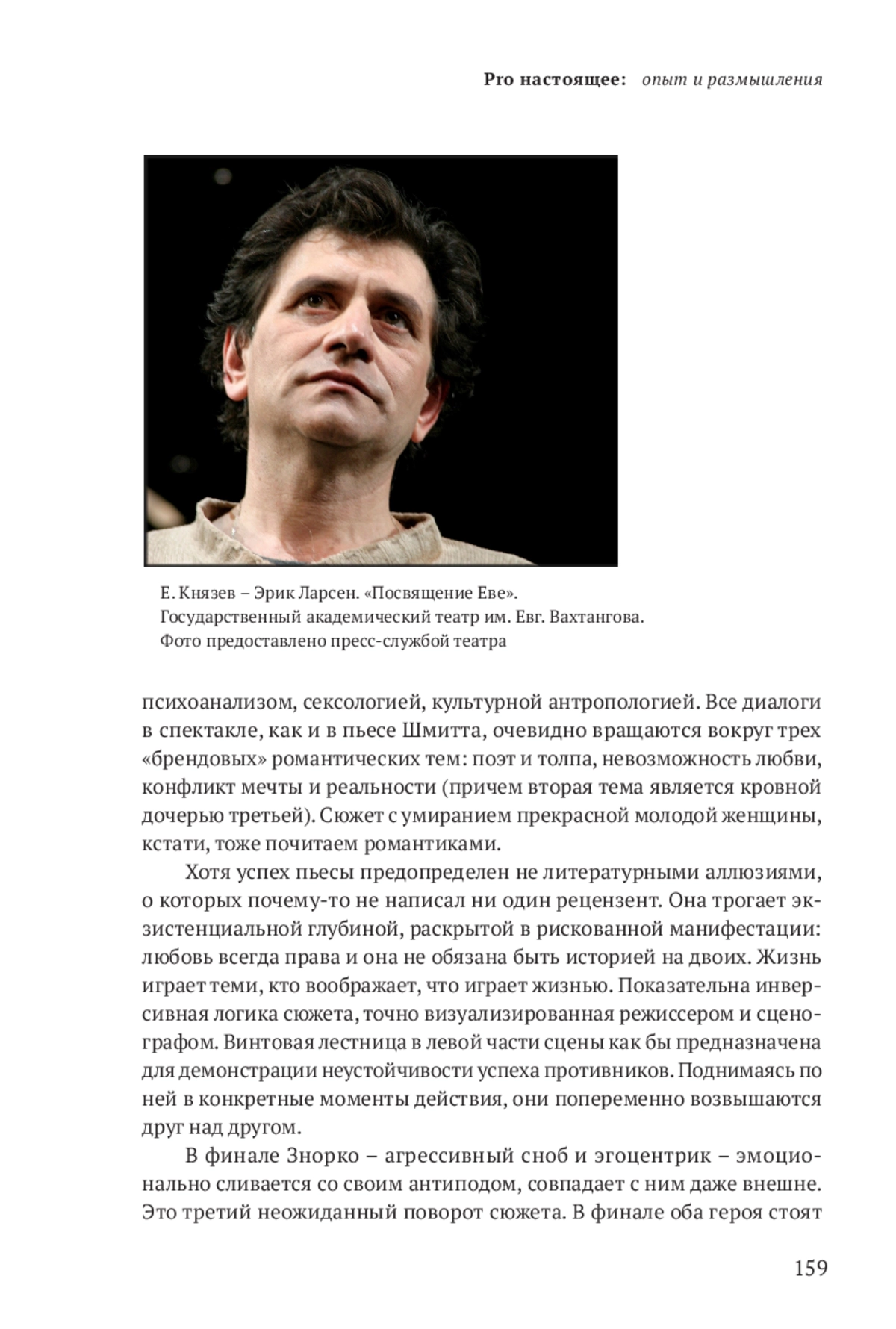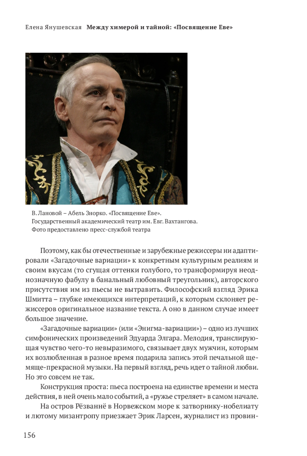 «Посвящение Еве», поставленное в 1999 г. Сергеем Яшиным и Сергеем Голомазовым в Театре имени Евг. Вахтангова, можно назвать легендарным уже потому, что на протяжении двадцати лет роль Абеля Знорко играл Василий Семенович Лановой. Последний раз – 20 декабря 2020 г., незадолго до смерти выдающегося актера. Однако это не единственный повод для разговора о постановке в историческом контексте. Театральное произведение рождается на стыке писательского замысла, режиссерской интерпретации, того, что смог донести до зрителя актер и воспринять зритель. Иными словами, работая с литературным источником, режиссер должен, в первую очередь, ясно понимать, что хотел сообщить нам автор и каково его место в культурном процессе.