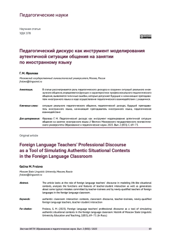 В статье рассматривается роль педагогического дискурса в создании ситуаций реального иноязычного общения, определяются функции и характеристики профессионального педагогического общения, выявляются типичные ошибки, которые допускают будущие и начинающие преподаватели иностранного языка в ходе осуществления педагогического взаимодействия с учащимися.