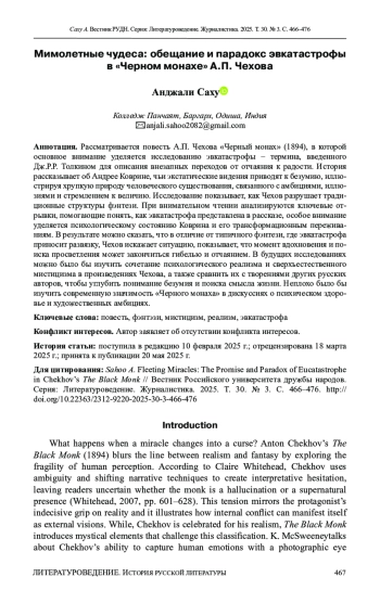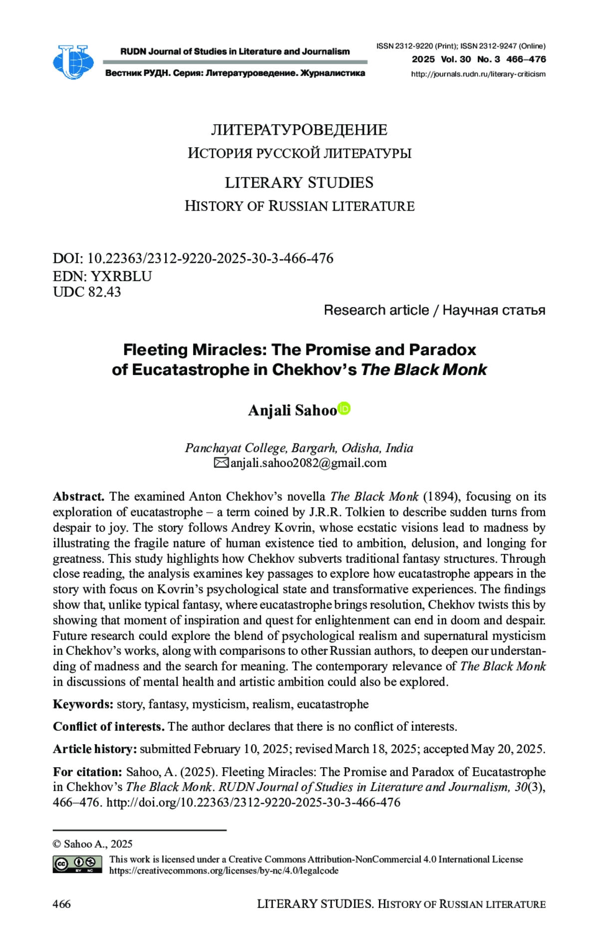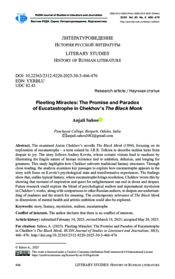 Рассматривается повесть А. П. Чехова «Черный монах» (1894), в которой основное внимание уделяется исследованию эвкатастрофы – термина, введенного Дж. Р. Р. Толкином для описания внезапных переходов от отчаяния к радости. История рассказывает об Андрее Коврине, чьи экстатические видения приводят к безумию, иллюстрируя хрупкую природу человеческого существования, связанного с амбициями, иллюзиями и стремлением к величию. Исследование показывает, как Чехов разрушает традиционные структуры фэнтези. При внимательном чтении анализируются ключевые от рывки, помогающие понять, как эвкатастрофа представлена в рассказе, особое внимание уделяется психологическому состоянию Коврина и его трансформационным переживаниям. В результате можно сказать, что в отличие от типичного фэнтези, где эвкатастрофа приносит развязку, Чехов искажает ситуацию, показывает, что момент вдохновения и по иска просветления может закончиться гибелью и отчаянием. В будущих исследованиях можно было бы изучить сочетание психологического реализма и сверхъестественного мистицизма в произведениях Чехова, а также сравнить их с творениями других русских авторов, чтобы углубить понимание безумия и поиска смысла жизни. Неплохо было бы изучить современную значимость «Черного монаха» в дискуссиях о психическом здоровье и художественных амбициях.