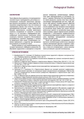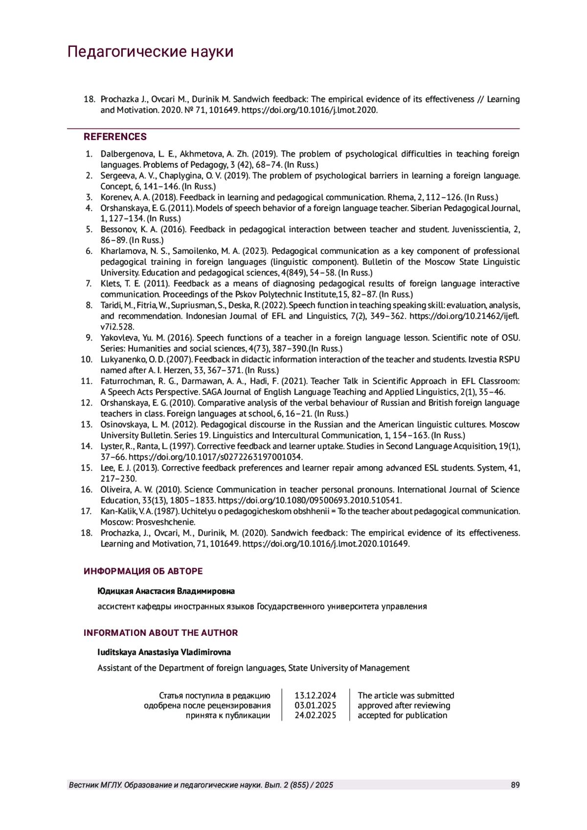 5. Бессонов К. А. Обратная связь в педагогическом взаимодействии преподавателя и студента // Juvenis scientia. 2016. № 2. С. 86-89. EDN: VTZZRH