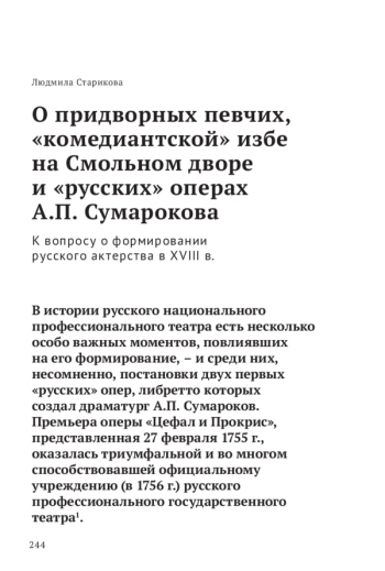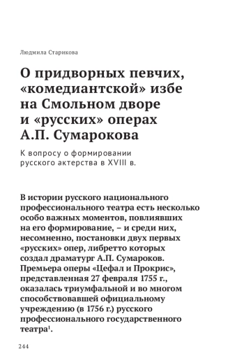 В истории русского национального профессионального театра есть несколько особо важных моментов, повлиявших на его формирование, – и среди них, несомненно, постановки двух первых «русских» опер, либретто которых создал драматург А. П. Сумароков. Премьера оперы «Цефал и Прокрис», представленная 27 февраля 1755 г., оказалась триумфальной и во многом способствовавшей официальному учреждению (в 1756 г.) русского профессионального государственного театра1.