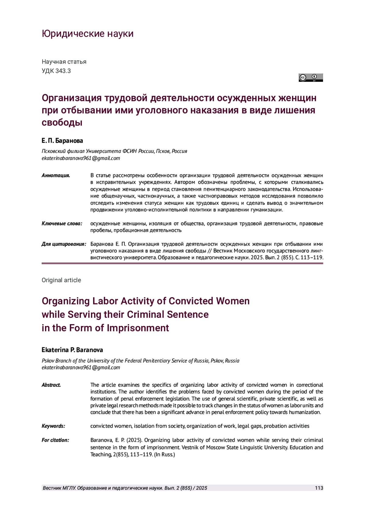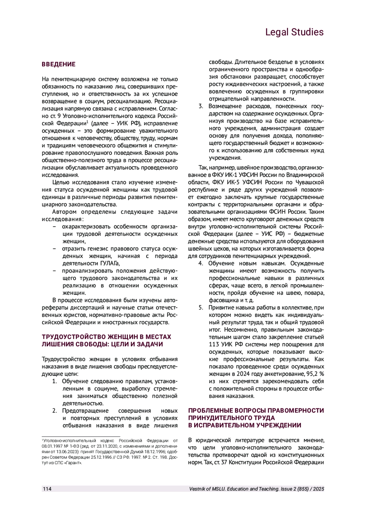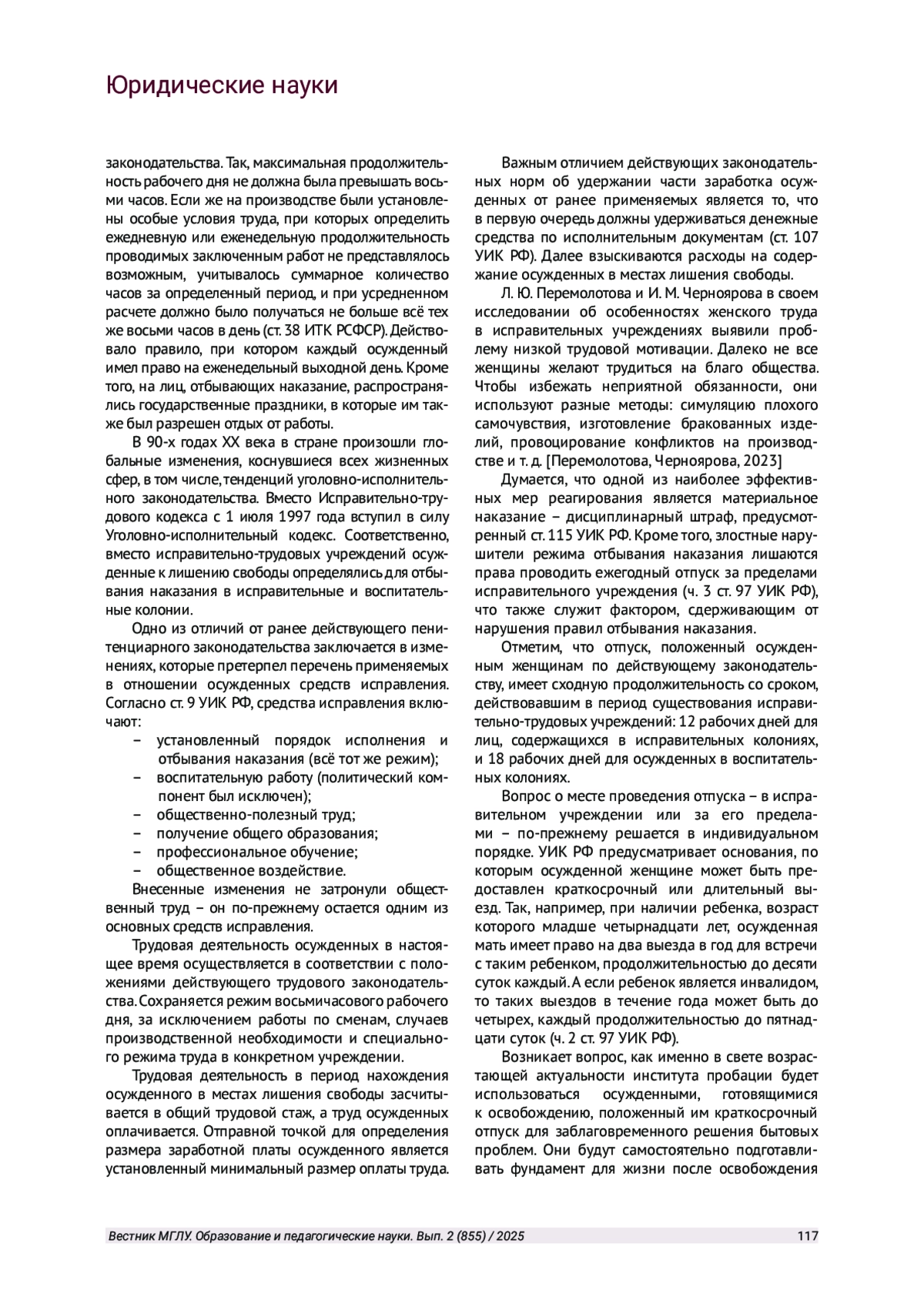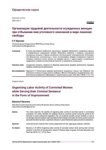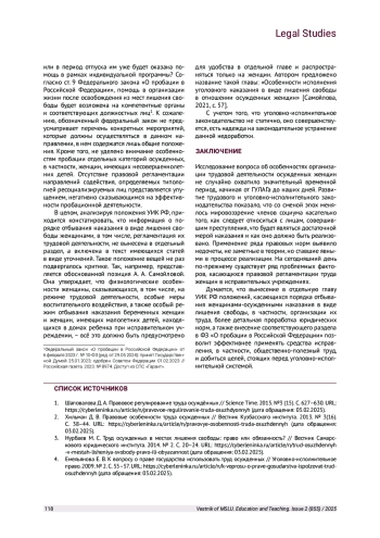 7. Перемолотова Л. Ю., Черноярова И. М. Особенности организации труда женщин, осужденных к лишению свободы // Вестник СурГУ. 2023. № 4 (42). С 116-120. URL: https://cyberleninka.ru/article/n/osobennosti-organizatsii -truda-zhenschin-osuzhdennyh-k-lisheniyu-svobody (дата обращения: 03.02.2025).