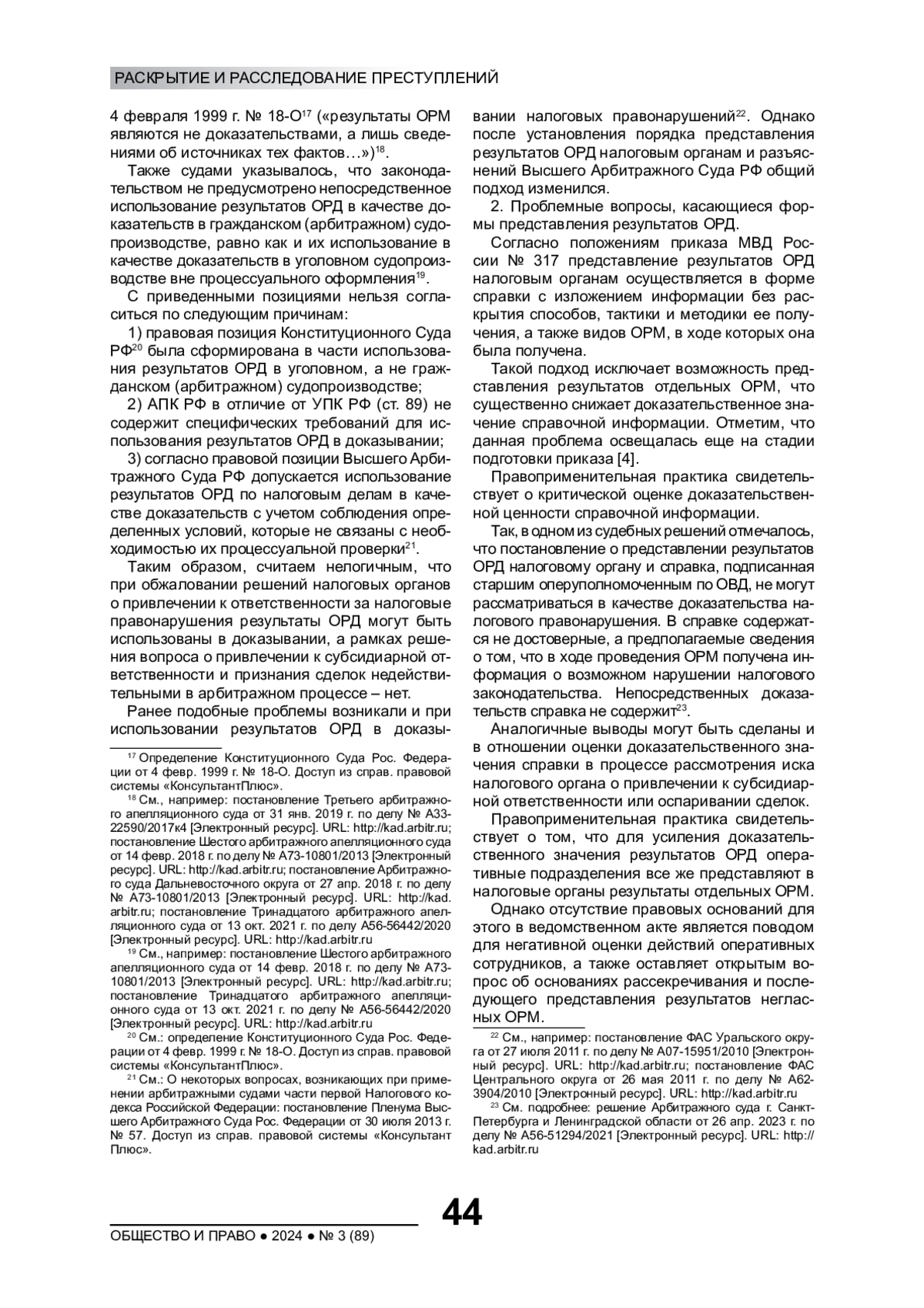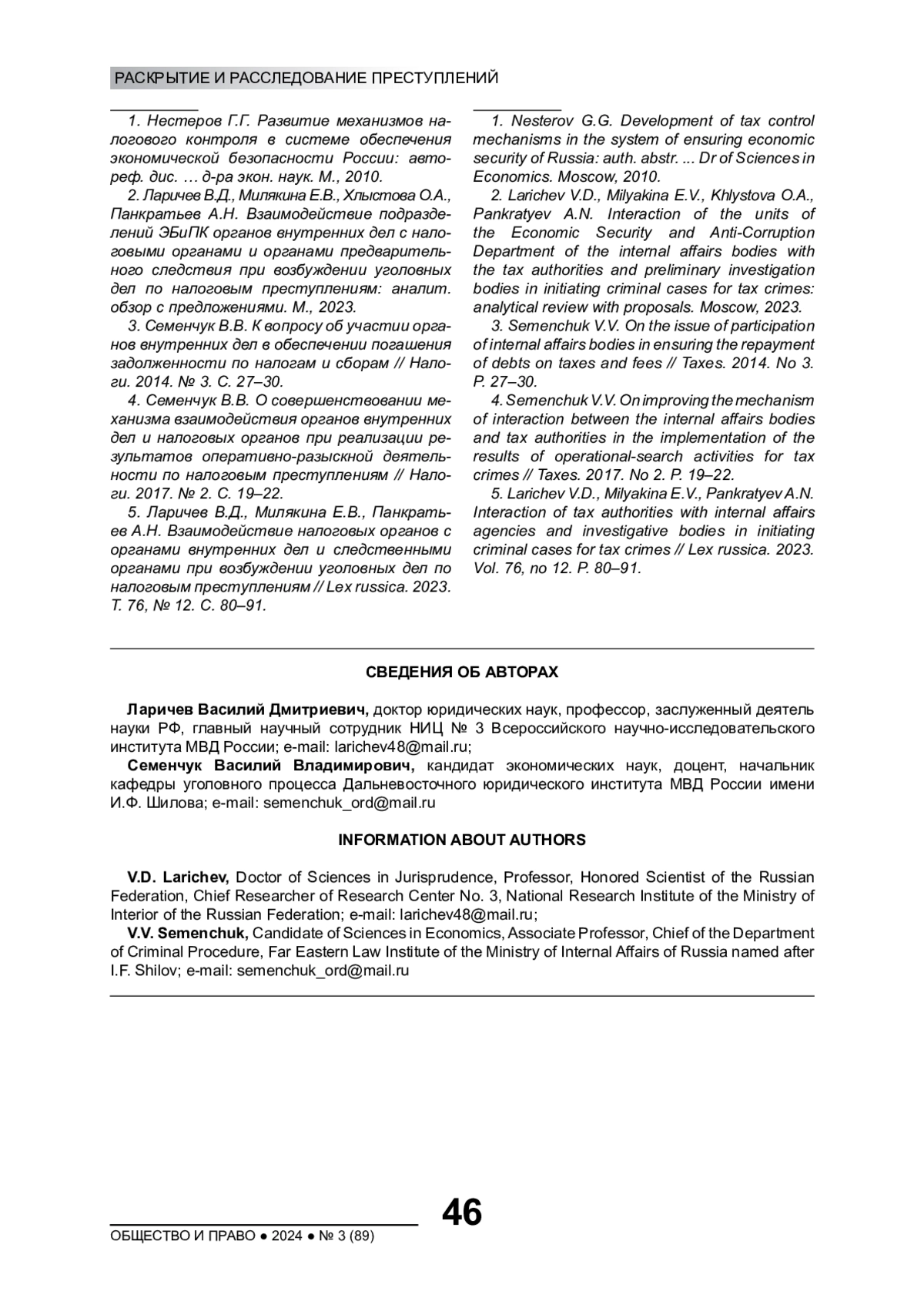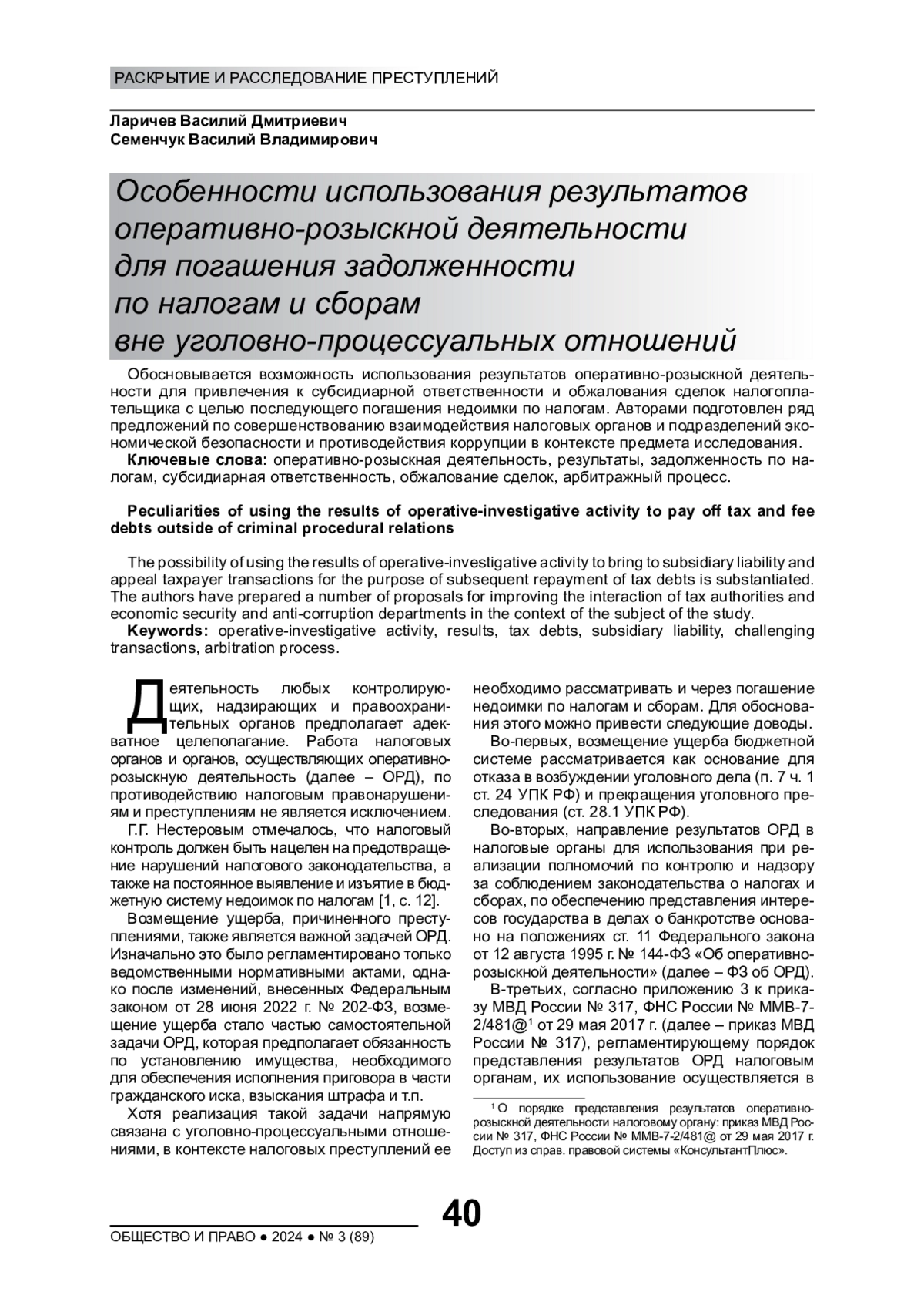 ЛАРИЧЕВ В. Д., СЕМЕНЧУК В. В. ОСОБЕННОСТИ ИСПОЛЬЗОВАНИЯ РЕЗУЛЬТАТОВ ОПЕРАТИВНО-РОЗЫСКНОЙ ДЕЯТЕЛЬНОСТИ ДЛЯ ПОГАШЕНИЯ ЗАДОЛЖЕННОСТИ ПО НАЛОГАМ И СБОРАМ ВНЕ УГОЛОВНО-ПРОЦЕССУАЛЬНЫХ ОТНОШЕНИЙ // ОБЩЕСТВО И ПРАВО. 2024. № 3 (89)
