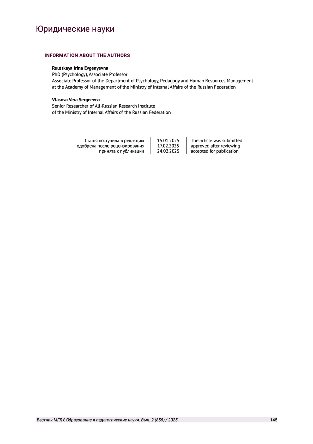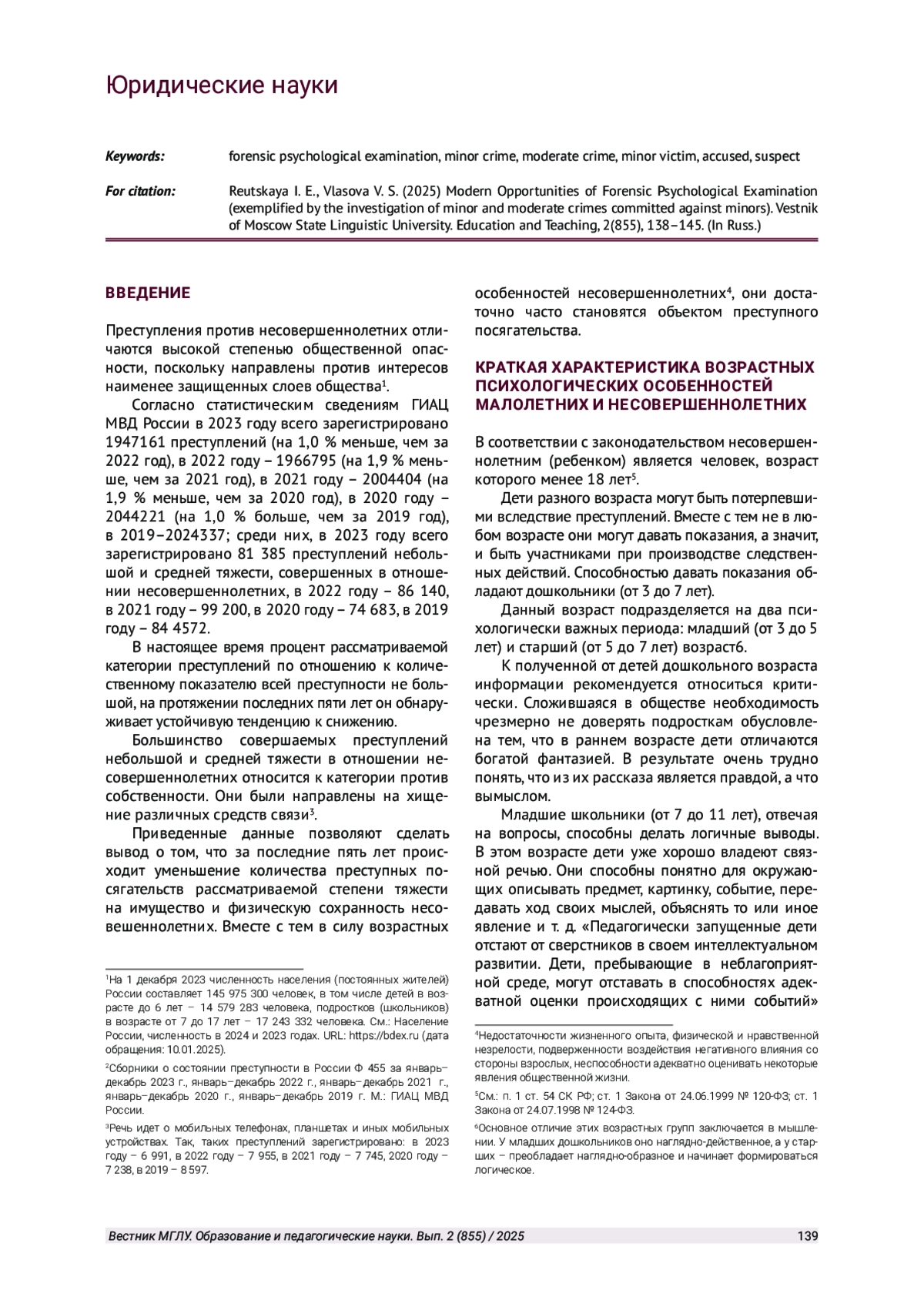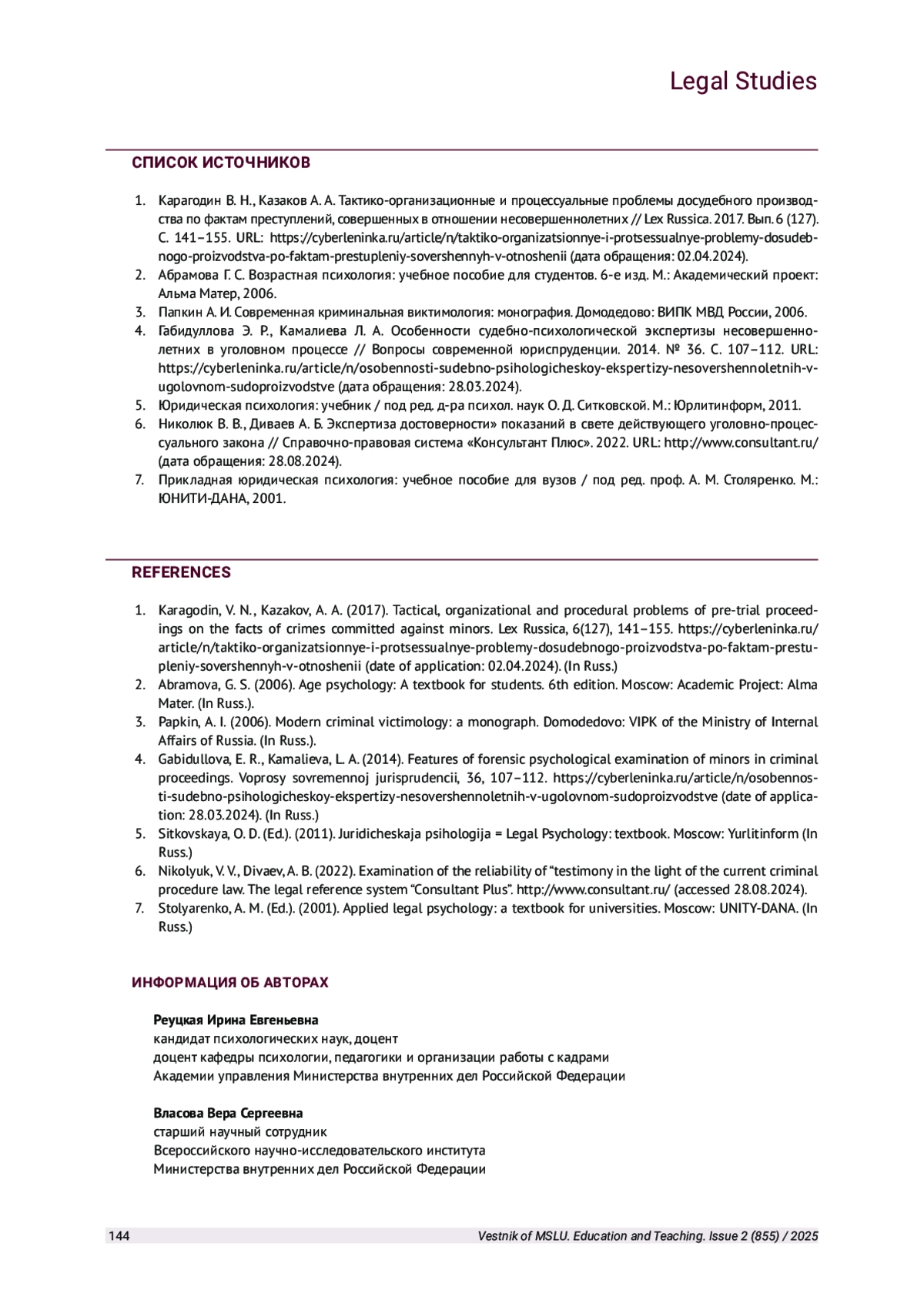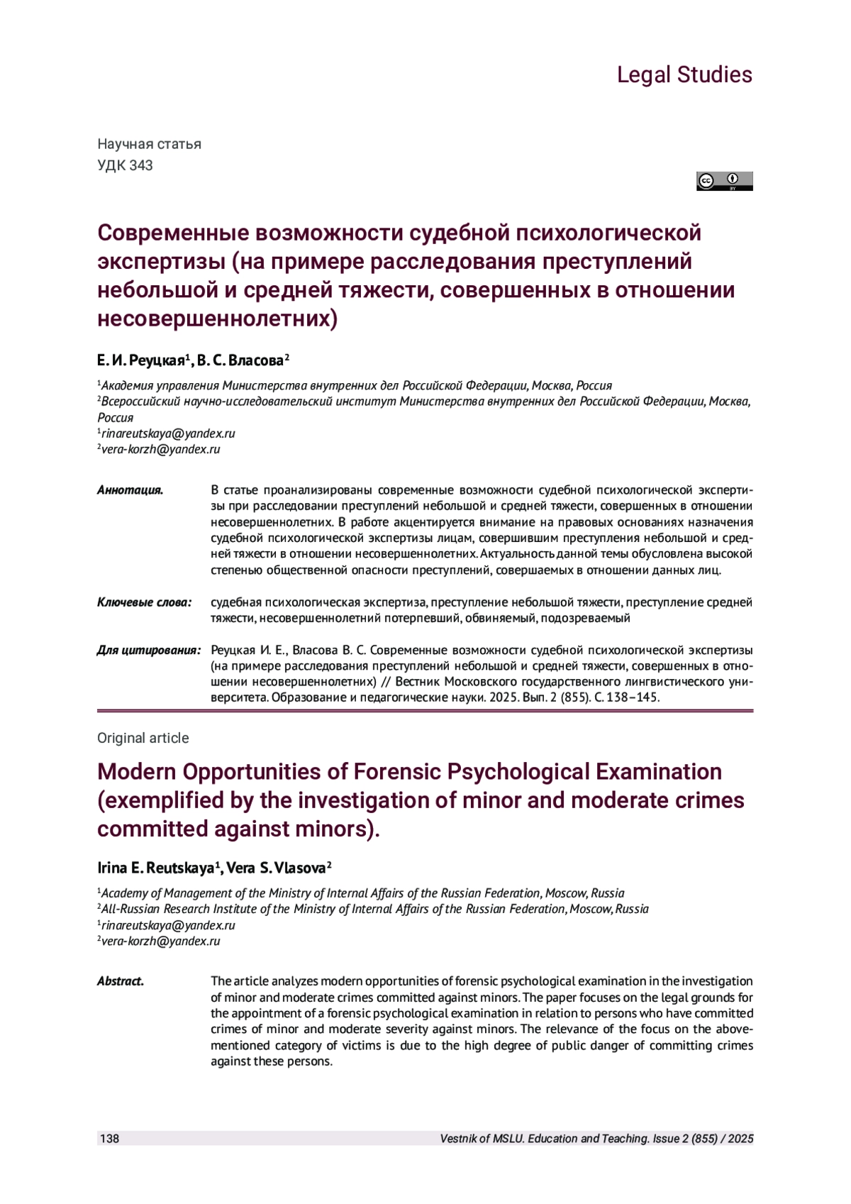 РЕУЦКАЯ И. Е., ВЛАСОВА В. С. СОВРЕМЕННЫЕ ВОЗМОЖНОСТИ СУДЕБНОЙ ПСИХОЛОГИЧЕСКОЙ ЭКСПЕРТИЗЫ (НА ПРИМЕРЕ РАССЛЕДОВАНИЯ ПРЕСТУПЛЕНИЙ НЕБОЛЬШОЙ И СРЕДНЕЙ ТЯЖЕСТИ, СОВЕРШЕННЫХ В ОТНОШЕНИИ НЕСОВЕРШЕННОЛЕТНИХ) // ВЕСТНИК МОСКОВСКОГО ГОСУДАРСТВЕННОГО ЛИНГВИСТИЧЕСКОГО УНИВЕРСИТЕТА. ОБРАЗОВАНИЕ И ПЕДАГОГИЧЕСКИЕ НАУКИ. 2025. № 2 (855)