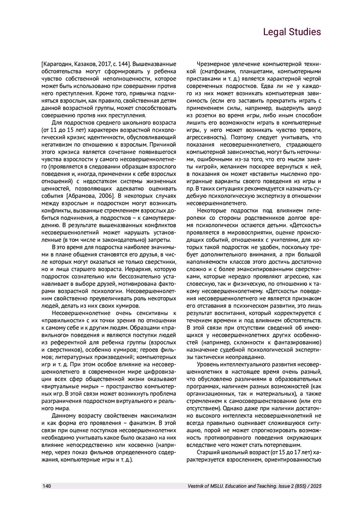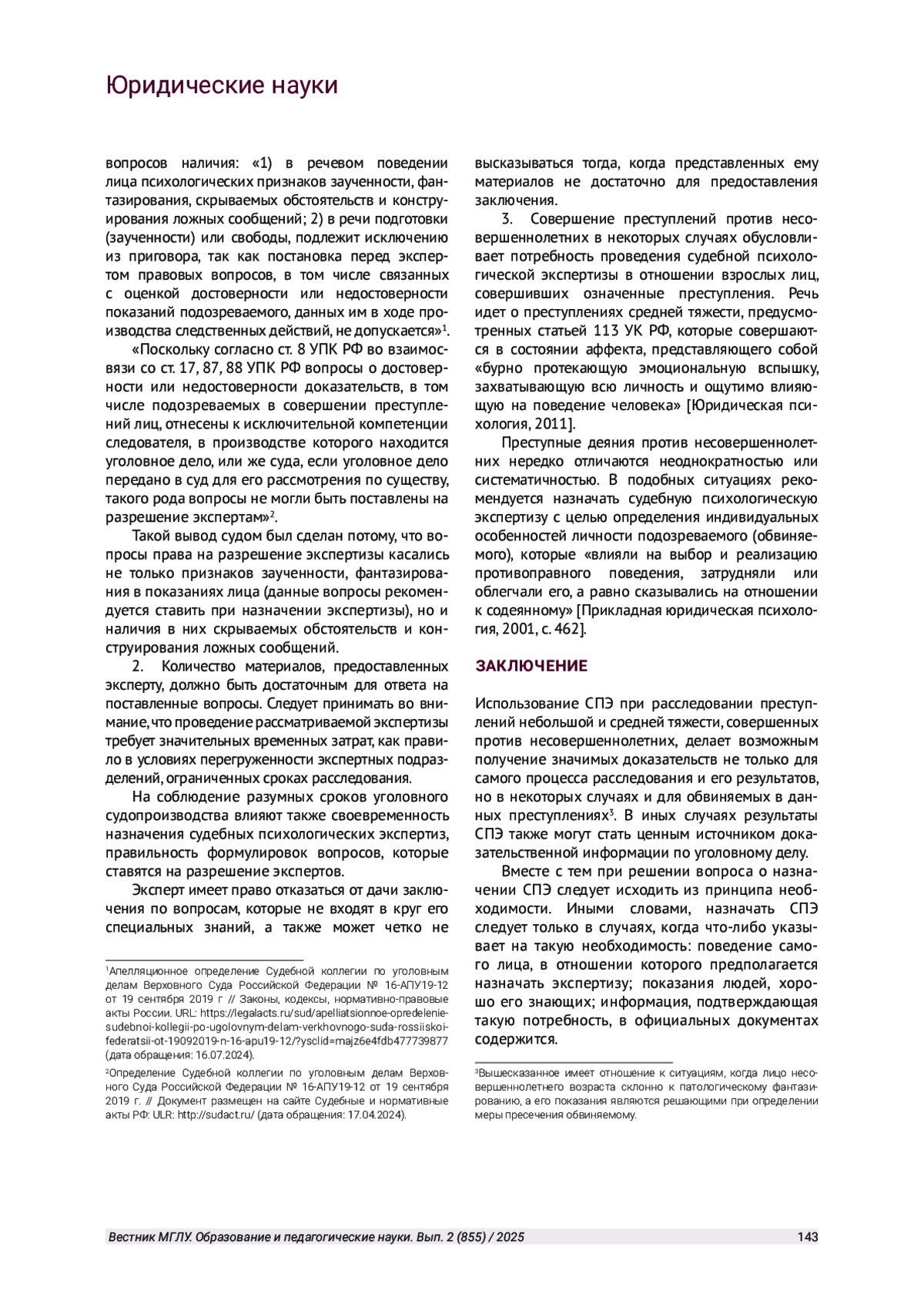 Статья: СОВРЕМЕННЫЕ ВОЗМОЖНОСТИ СУДЕБНОЙ ПСИХОЛОГИЧЕСКОЙ ЭКСПЕРТИЗЫ (НА ПРИМЕРЕ РАССЛЕДОВАНИЯ ПРЕСТУПЛЕНИЙ НЕБОЛЬШОЙ И СРЕДНЕЙ ТЯЖЕСТИ, СОВЕРШЕННЫХ В ОТНОШЕНИИ НЕСОВЕРШЕННОЛЕТНИХ) (2025)