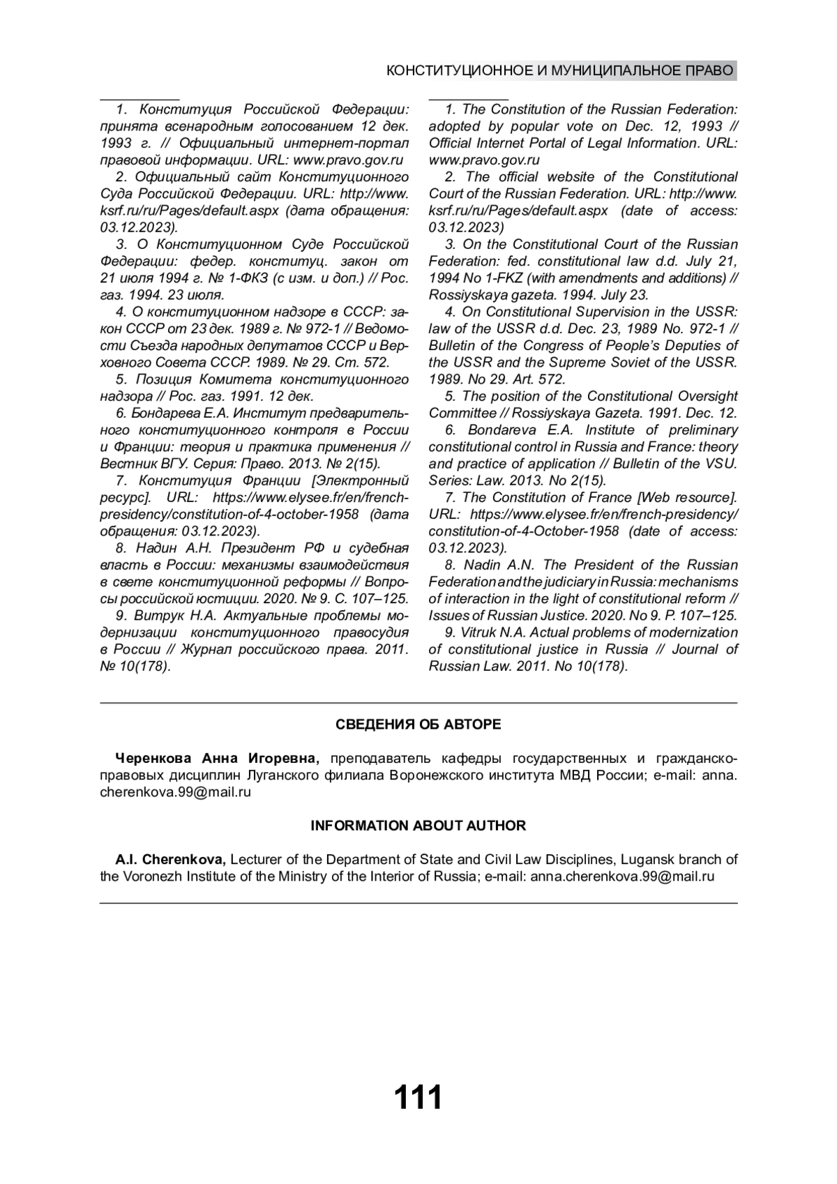 6. Бондарева Е.А. Институт предварительного конституционного контроля в России и Франции: теория и практика применения // Вестник ВГУ. Серия: Право. 2013. № 2(15). EDN: REPCMJ