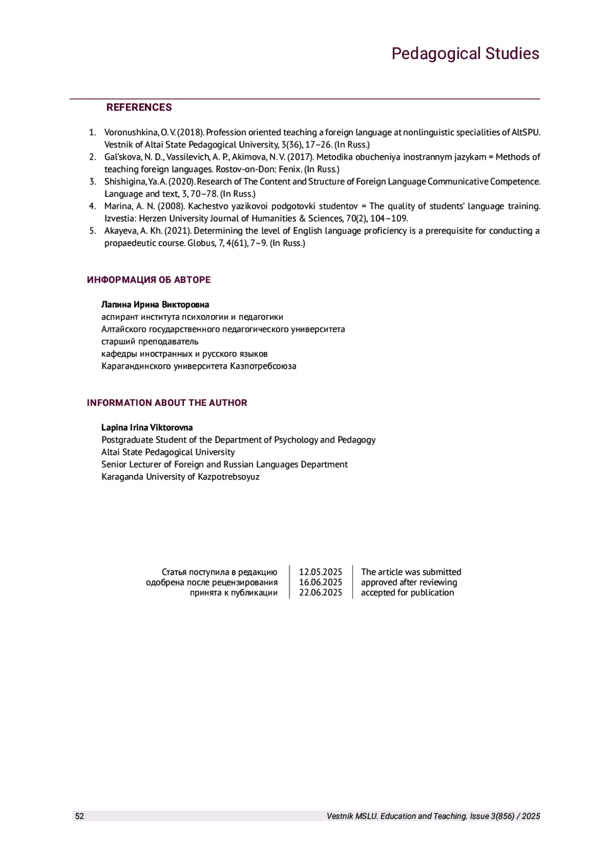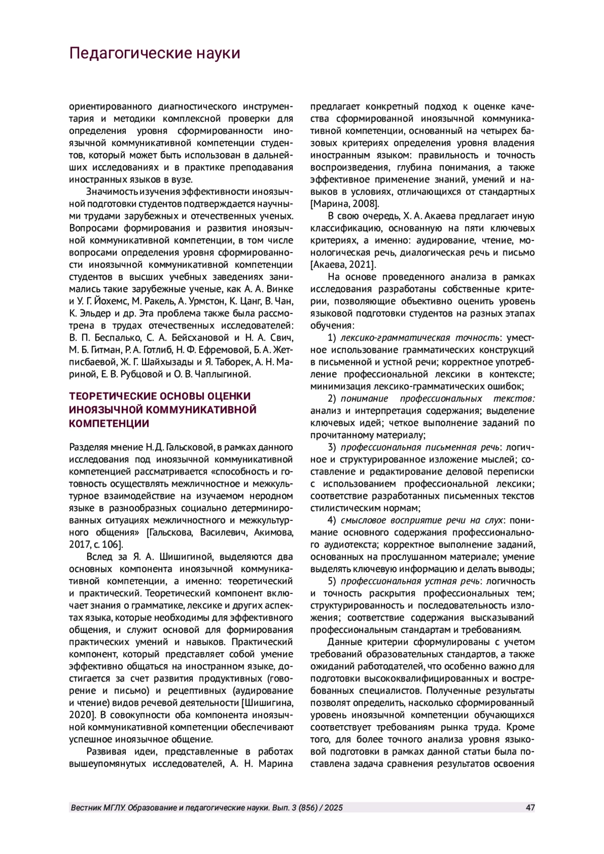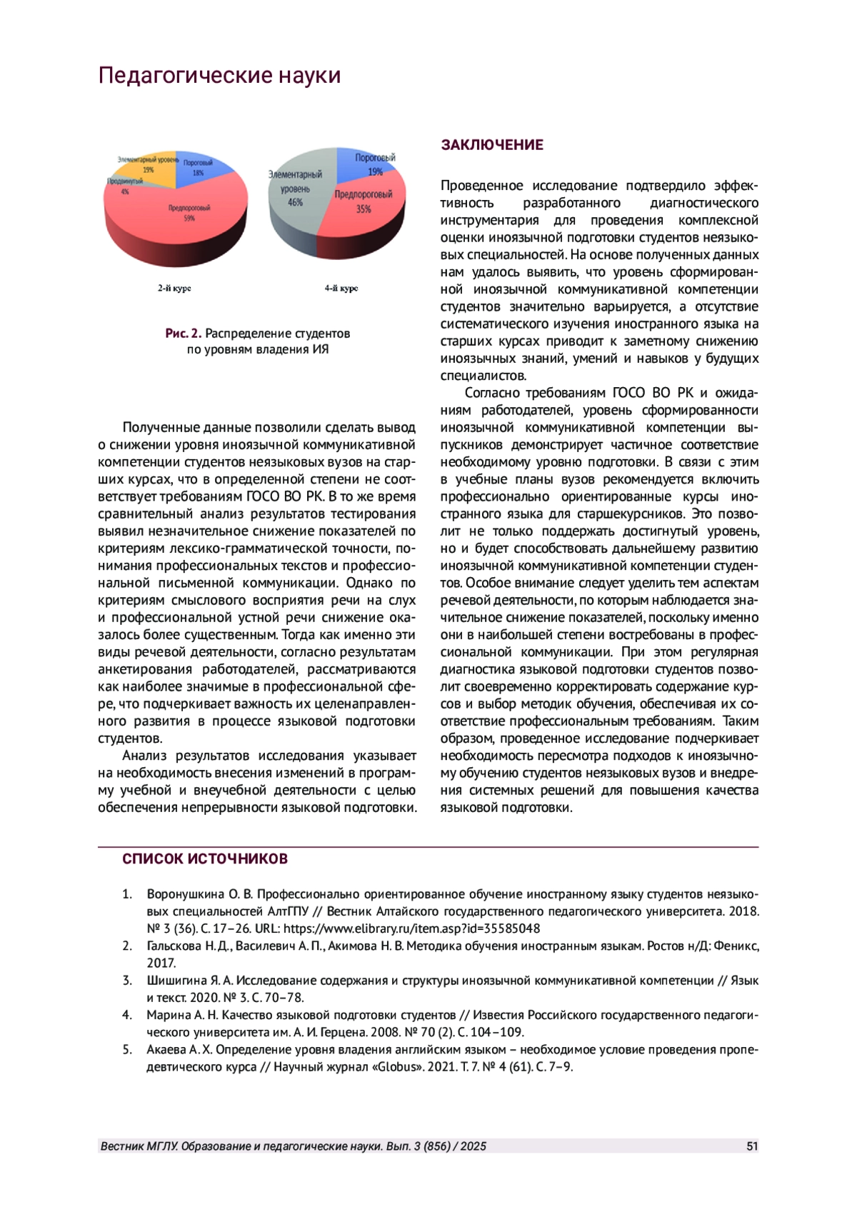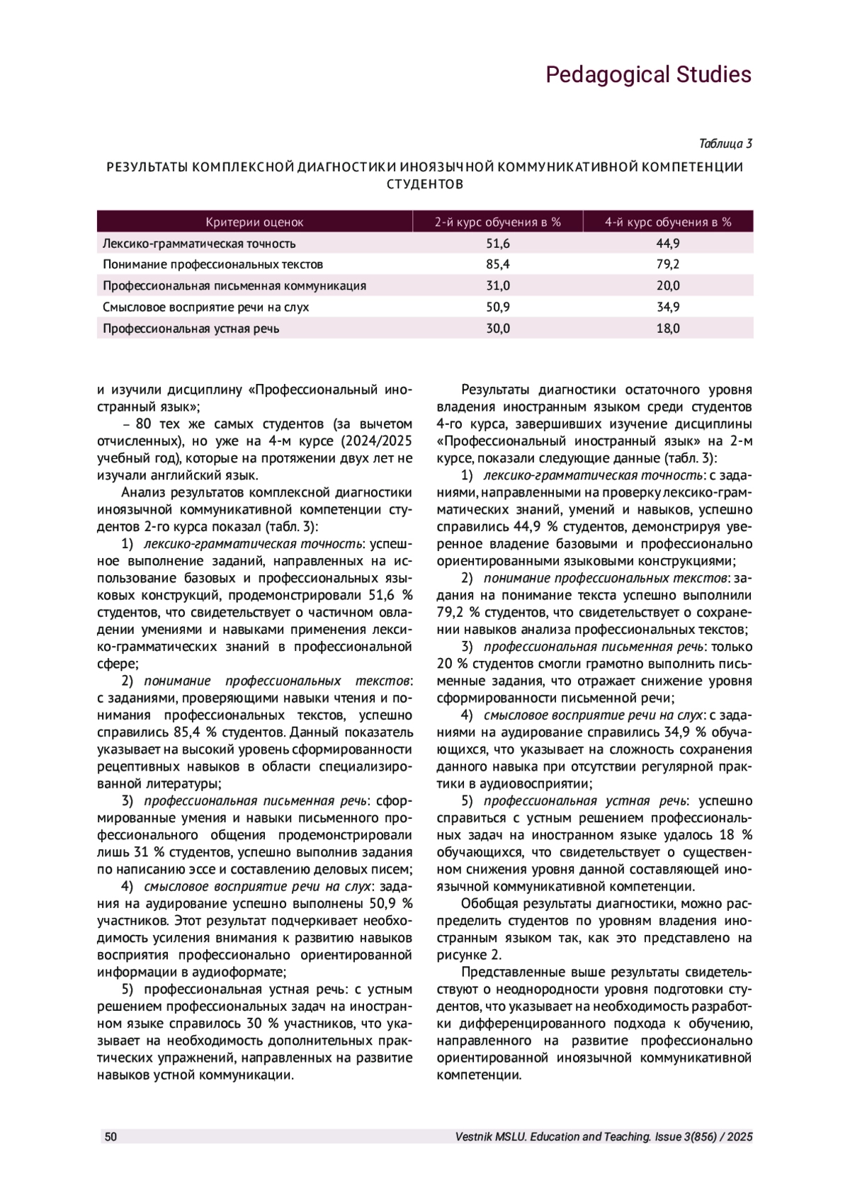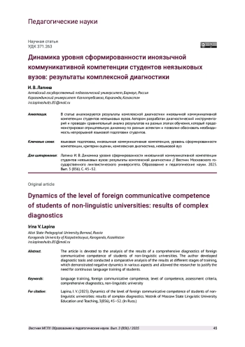 ЛАПИНА И. В. ДИНАМИКА УРОВНЯ СФОРМИРОВАННОСТИ ИНОЯЗЫЧНОЙ КОММУНИКАТИВНОЙ КОМПЕТЕНЦИИ СТУДЕНТОВ НЕЯЗЫКОВЫХ ВУЗОВ: РЕЗУЛЬТАТЫ КОМПЛЕКСНОЙ ДИАГНОСТИКИ // ВЕСТНИК МОСКОВСКОГО ГОСУДАРСТВЕННОГО ЛИНГВИСТИЧЕСКОГО УНИВЕРСИТЕТА. ОБРАЗОВАНИЕ И ПЕДАГОГИЧЕСКИЕ НАУКИ. 2025. № 3 (856)