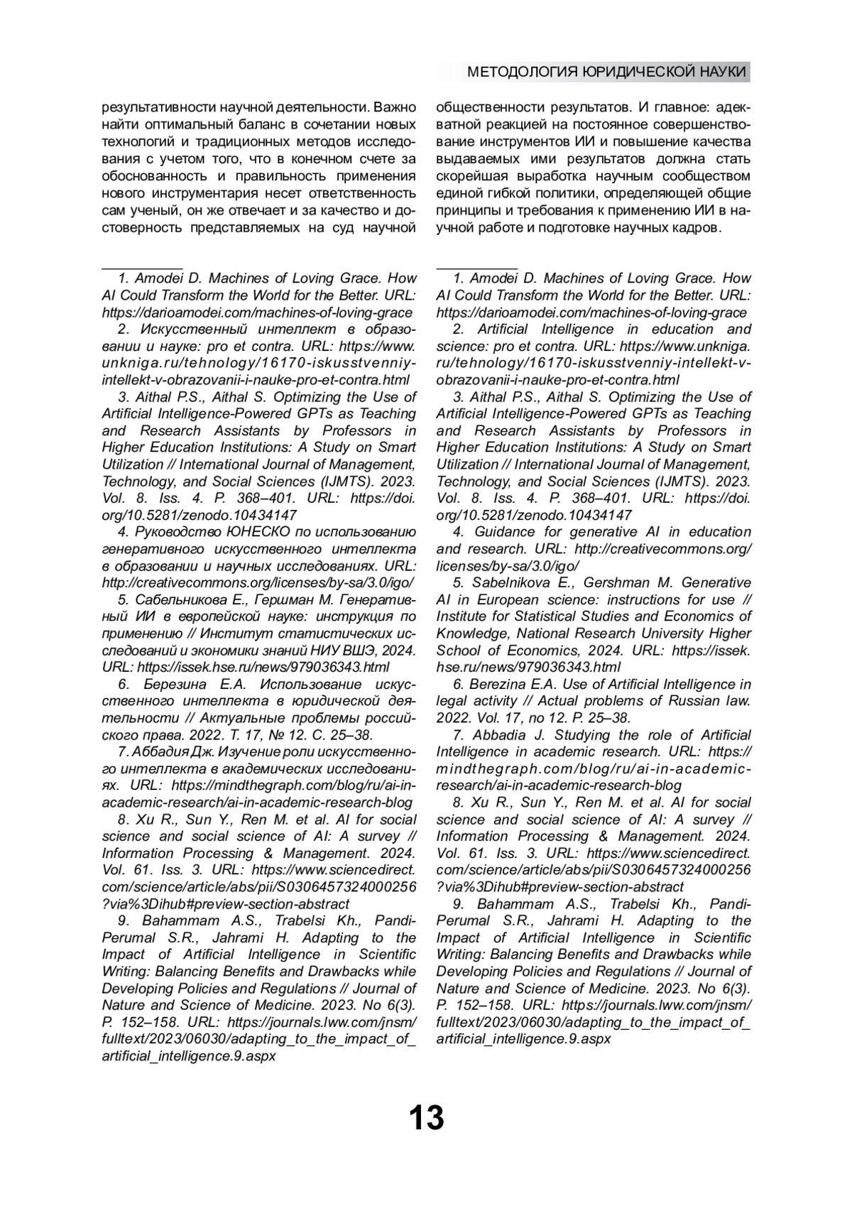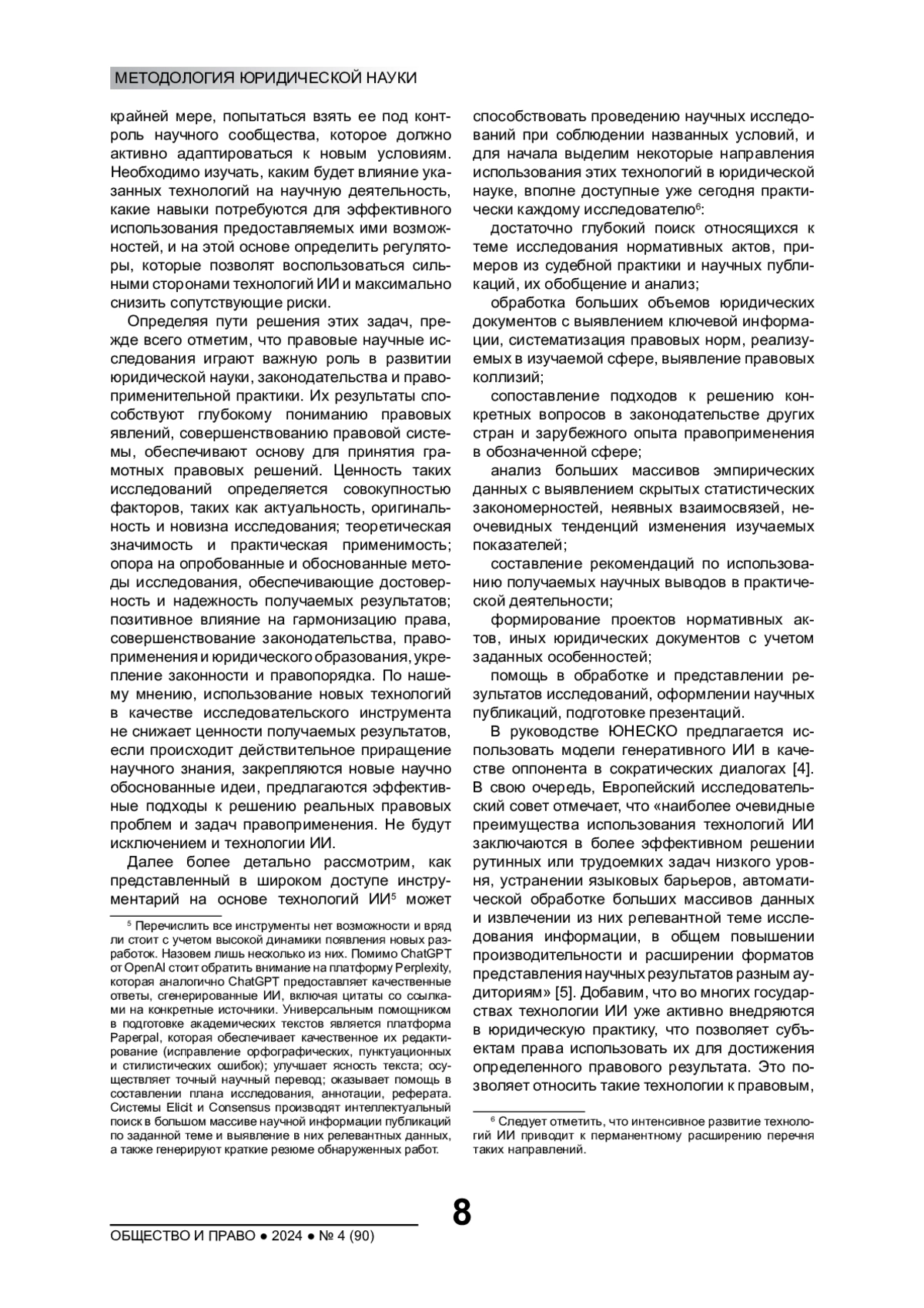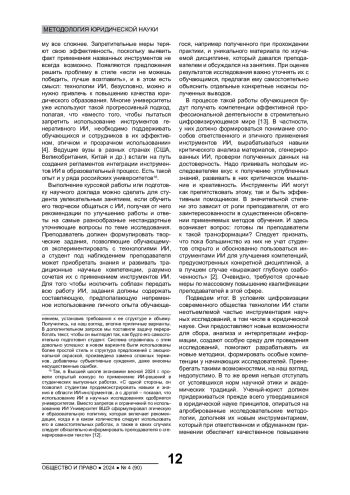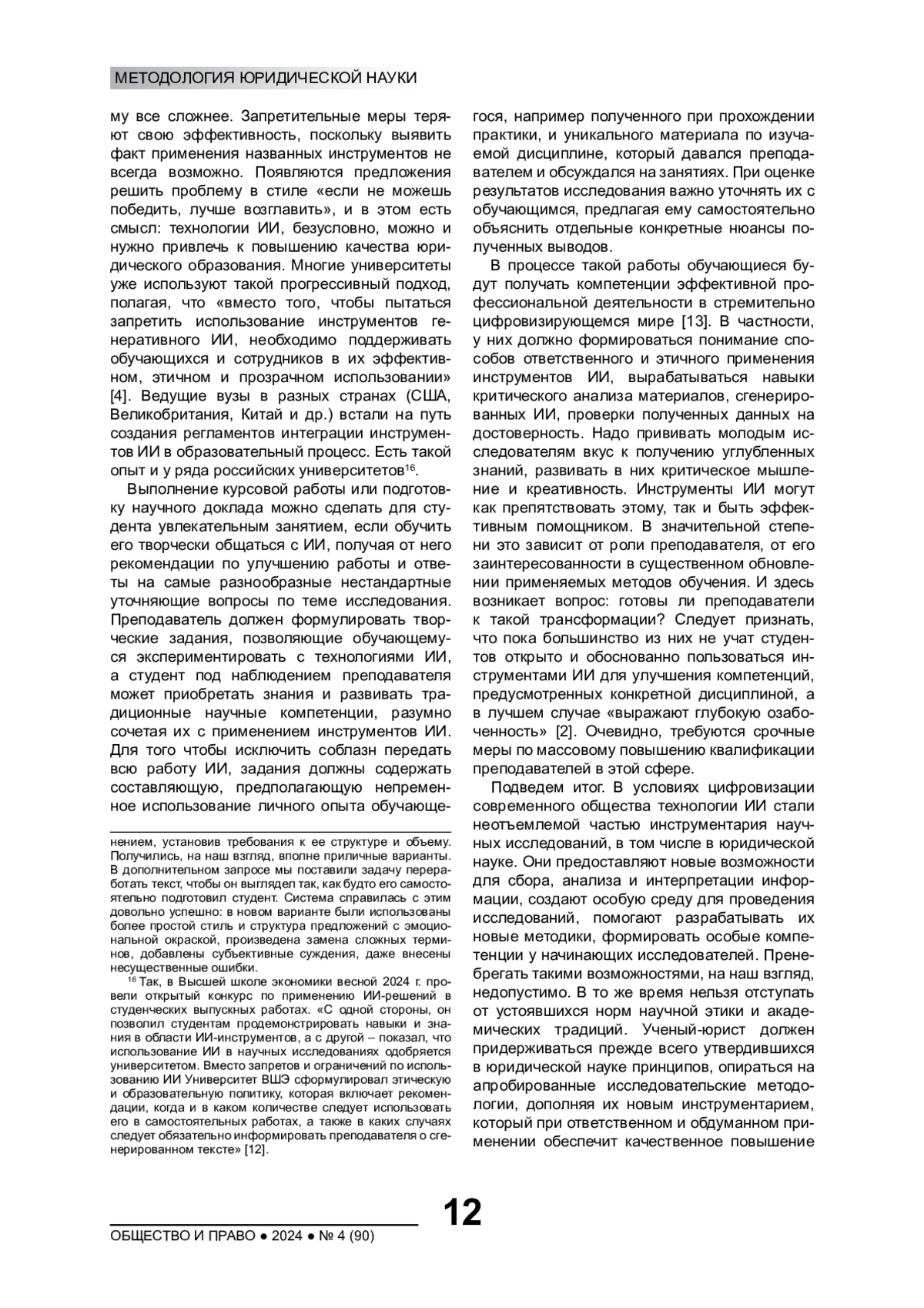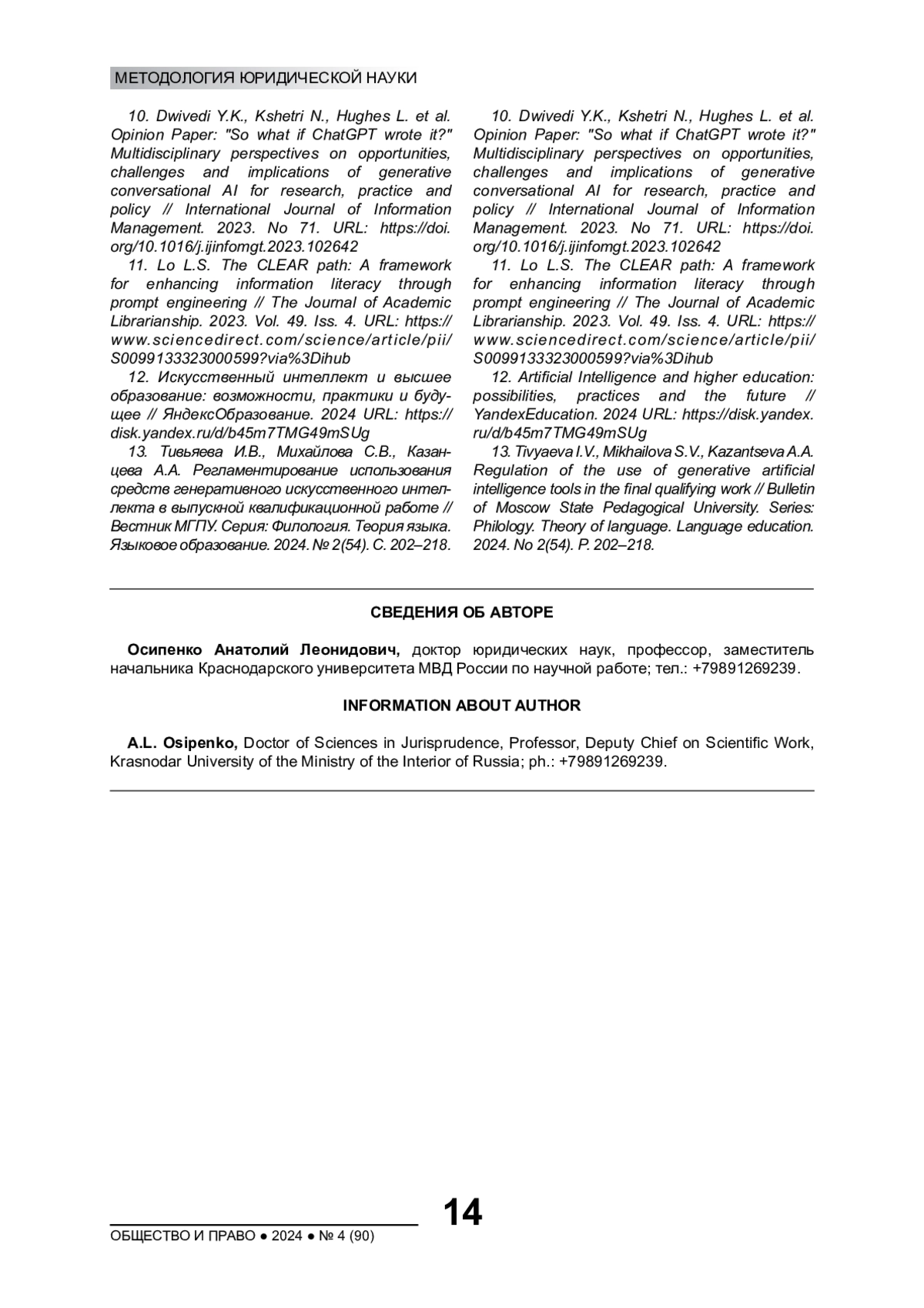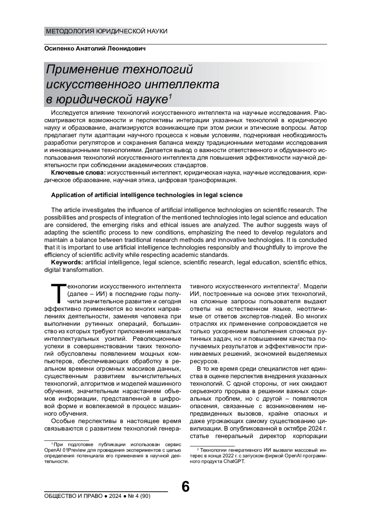 ОСИПЕНКО А. Л. ПРИМЕНЕНИЕ ТЕХНОЛОГИЙ ИСКУССТВЕННОГО ИНТЕЛЛЕКТА В ЮРИДИЧЕСКОЙ НАУКЕ // ОБЩЕСТВО И ПРАВО. 2024. № 4 (90)
