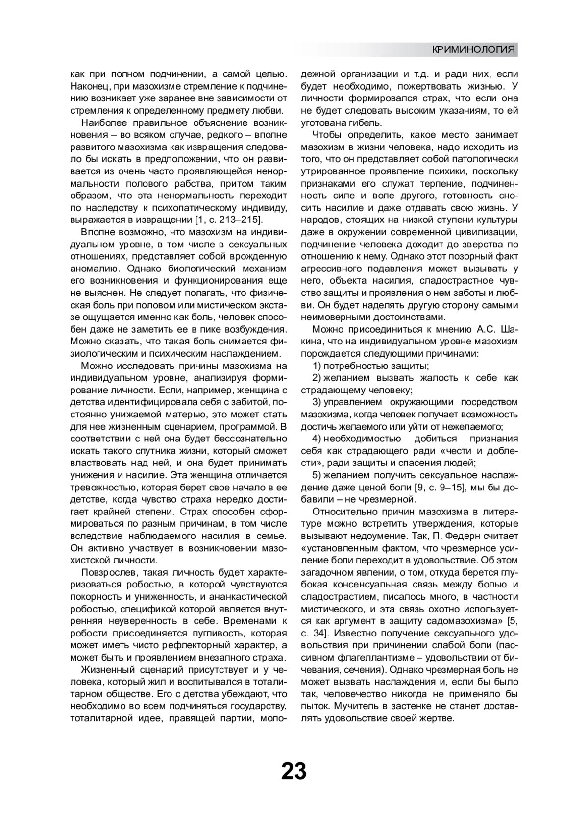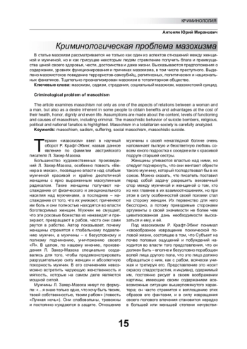 В статье мазохизм рассматривается не только как один из аспектов отношений между женщиной и мужчиной, но и как присущее некоторым людям стремление получить блага и преимущества ценой своего здоровья, чести, достоинства и даже жизни. Высказываются предположения о содержании, уровнях функционирования и причинах мазохизма, в том числе преступного. Выделено мазохистское поведение террористов-самоубийц, религиозных, политических и национальных фанатиков. Тщательно проанализирован мазохизм в тоталитарном обществе