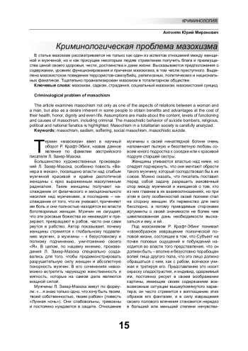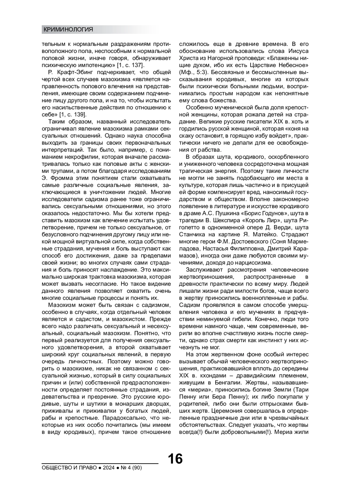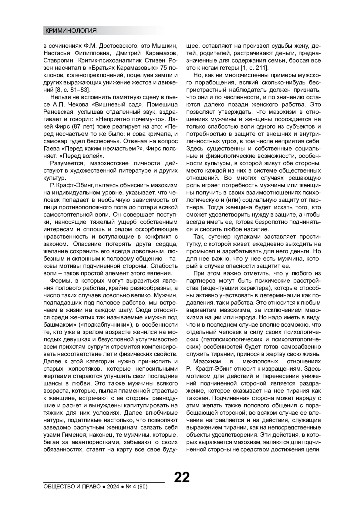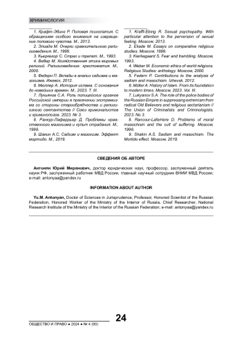 АНТОНЯН Ю. М. КРИМИНОЛОГИЧЕСКАЯ ПРОБЛЕМА МАЗОХИЗМА // ОБЩЕСТВО И ПРАВО. 2024. № 4 (90)