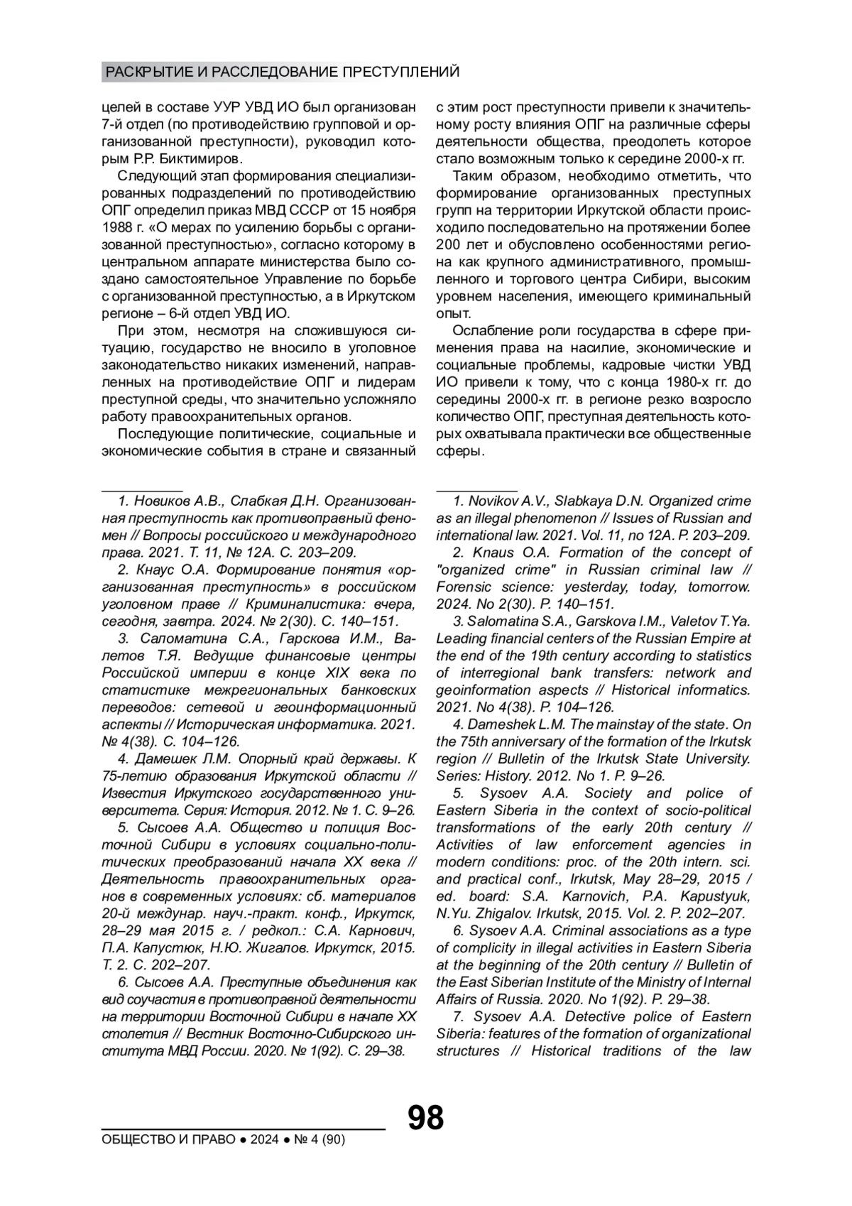 Статья: ФОРМИРОВАНИЕ ОРГАНИЗОВАННОЙ ПРЕСТУПНОСТИ В ИРКУТСКОЙ ОБЛАСТИ (2024)