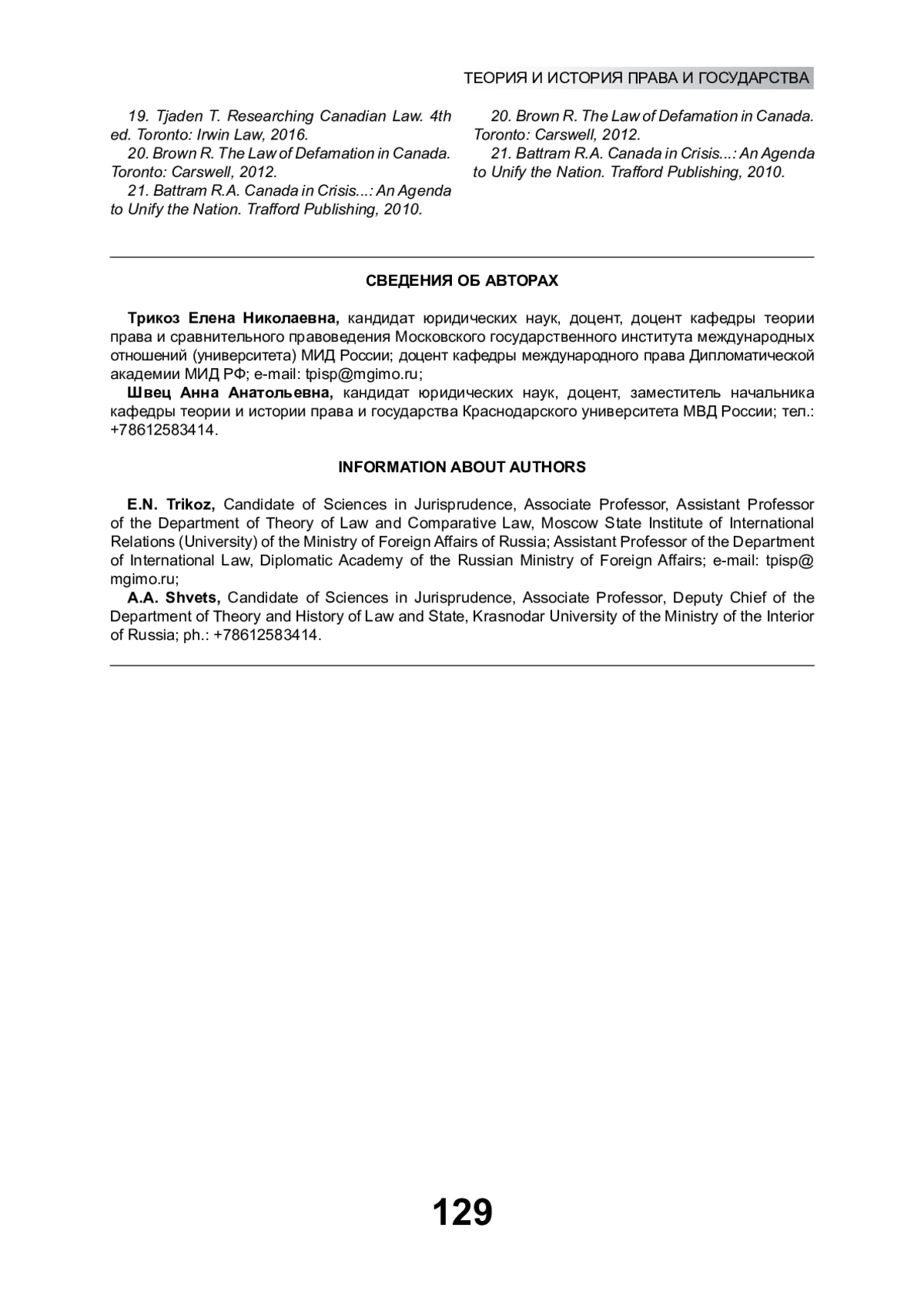 2. Трикоз Е.Н. Становление уголовно-правовой системы Канады // Журнал российского права. 2004. № 8. С. 138-146.
