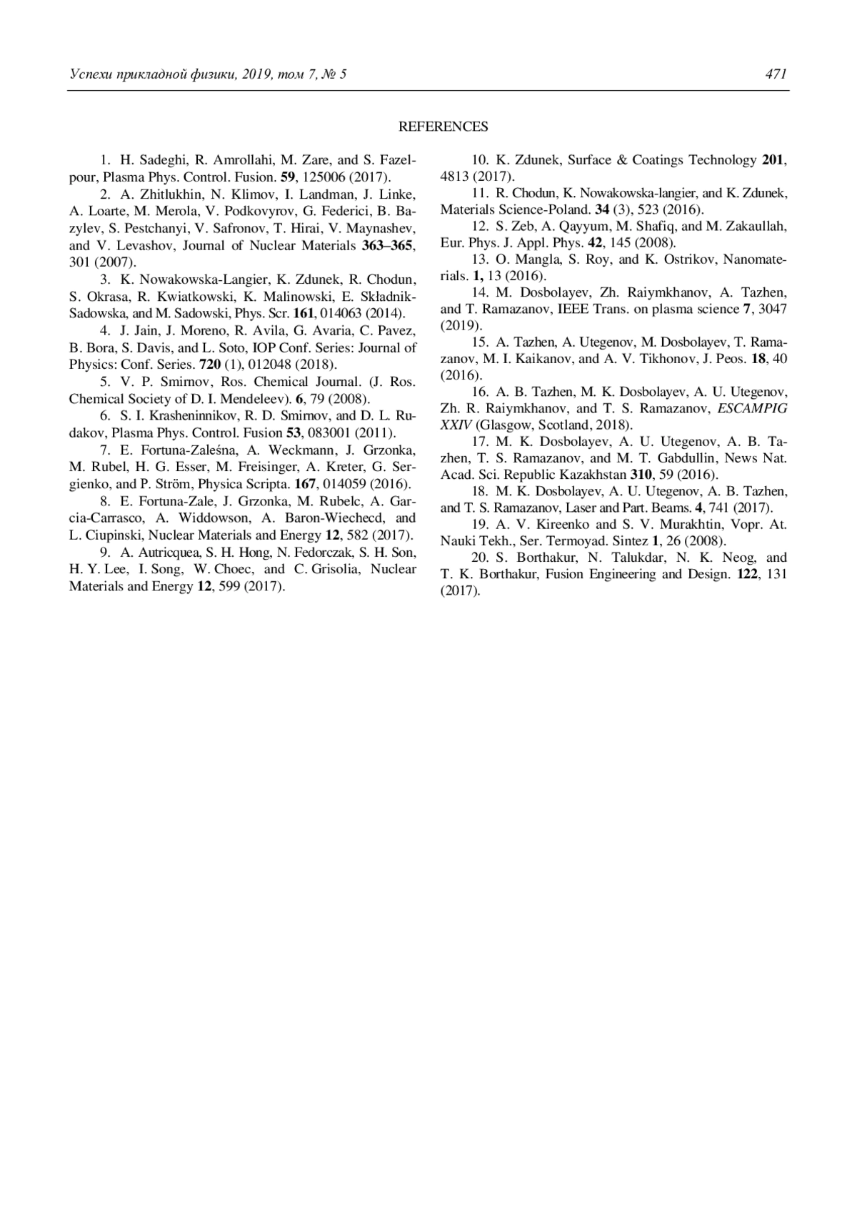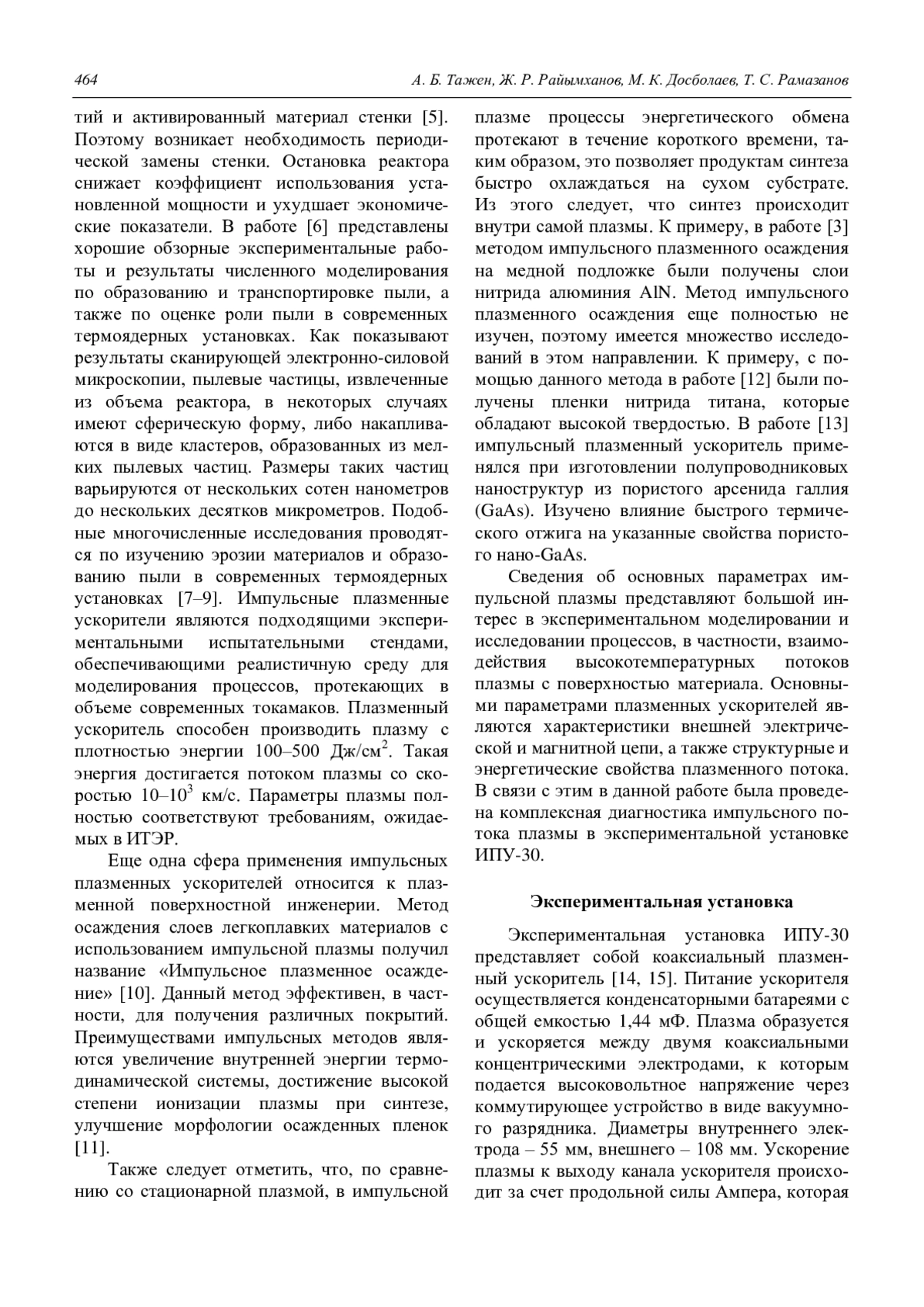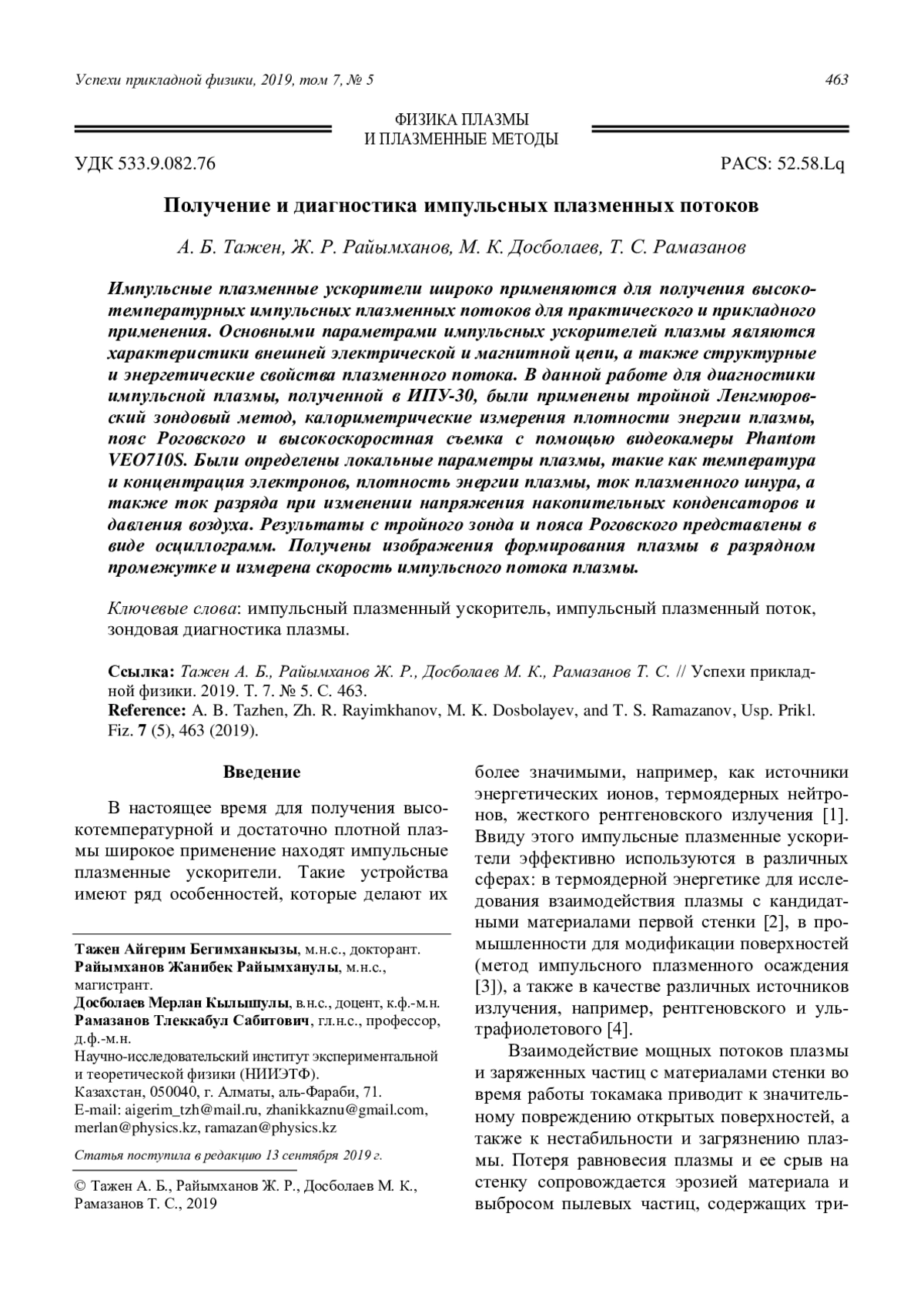 ТАЖЕН А. Б., РАЙЫМХАНОВ Ж. Р., ДОСБОЛАЕВ М. К., РАМАЗАНОВ Т. С. ПОЛУЧЕНИЕ И ДИАГНОСТИКА ИМПУЛЬСНЫХ ПЛАЗМЕННЫХ ПОТОКОВ // УСПЕХИ ПРИКЛАДНОЙ ФИЗИКИ. 2019. ТОМ 7, №5