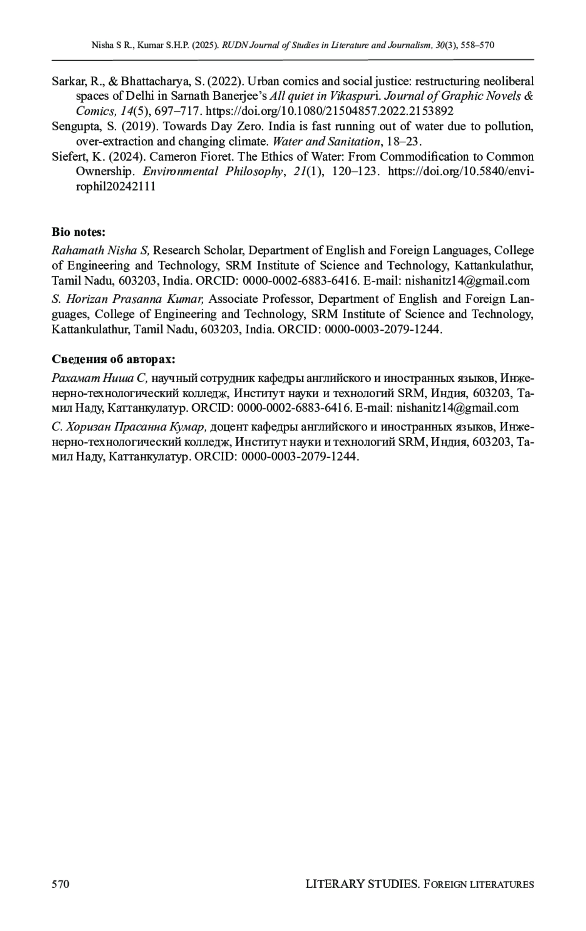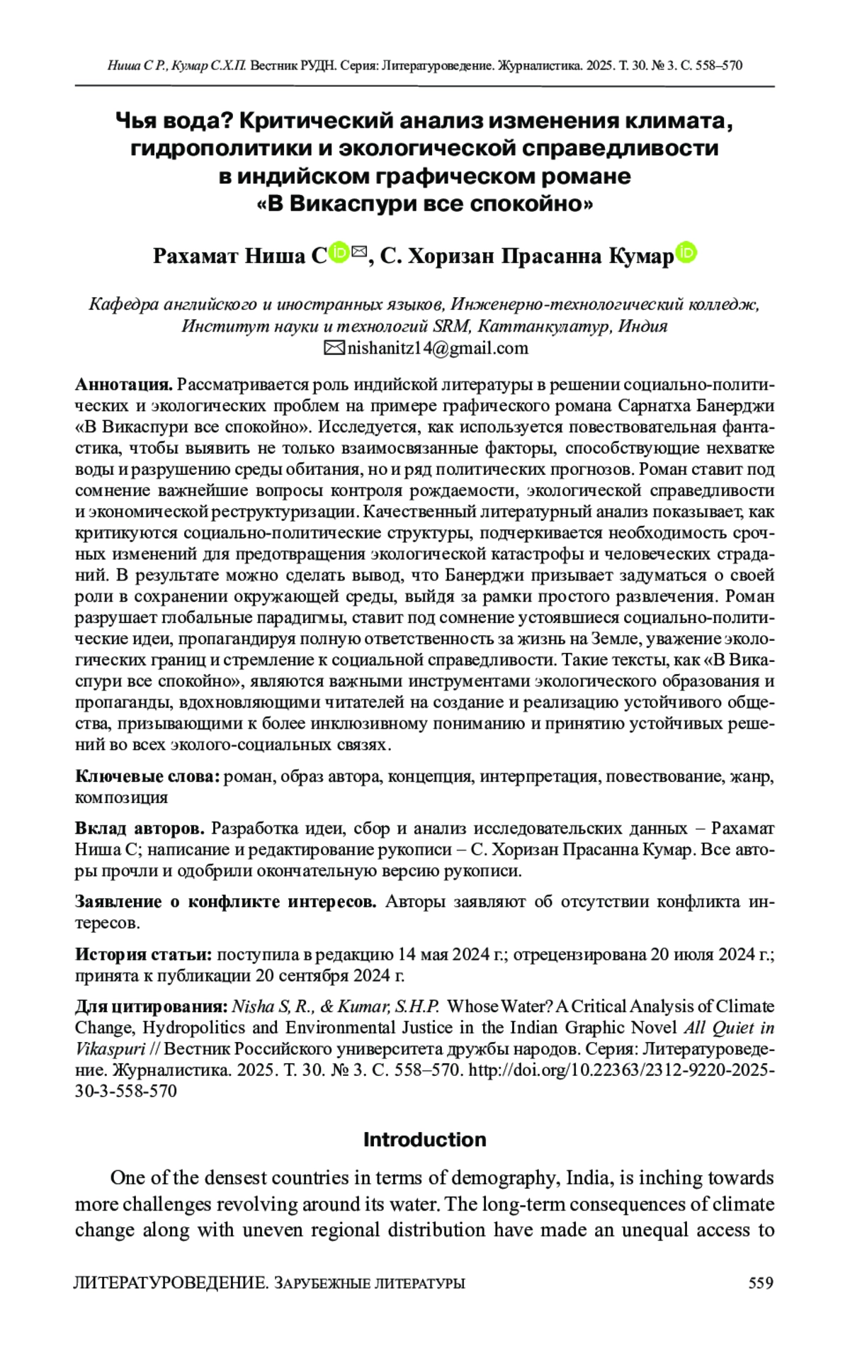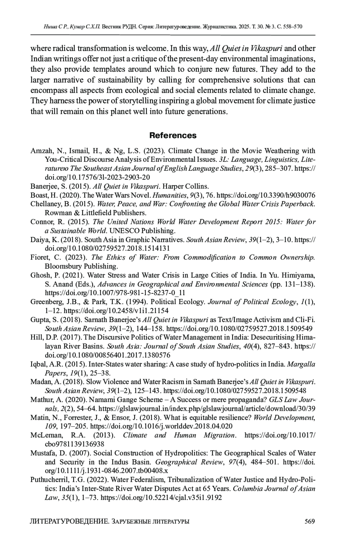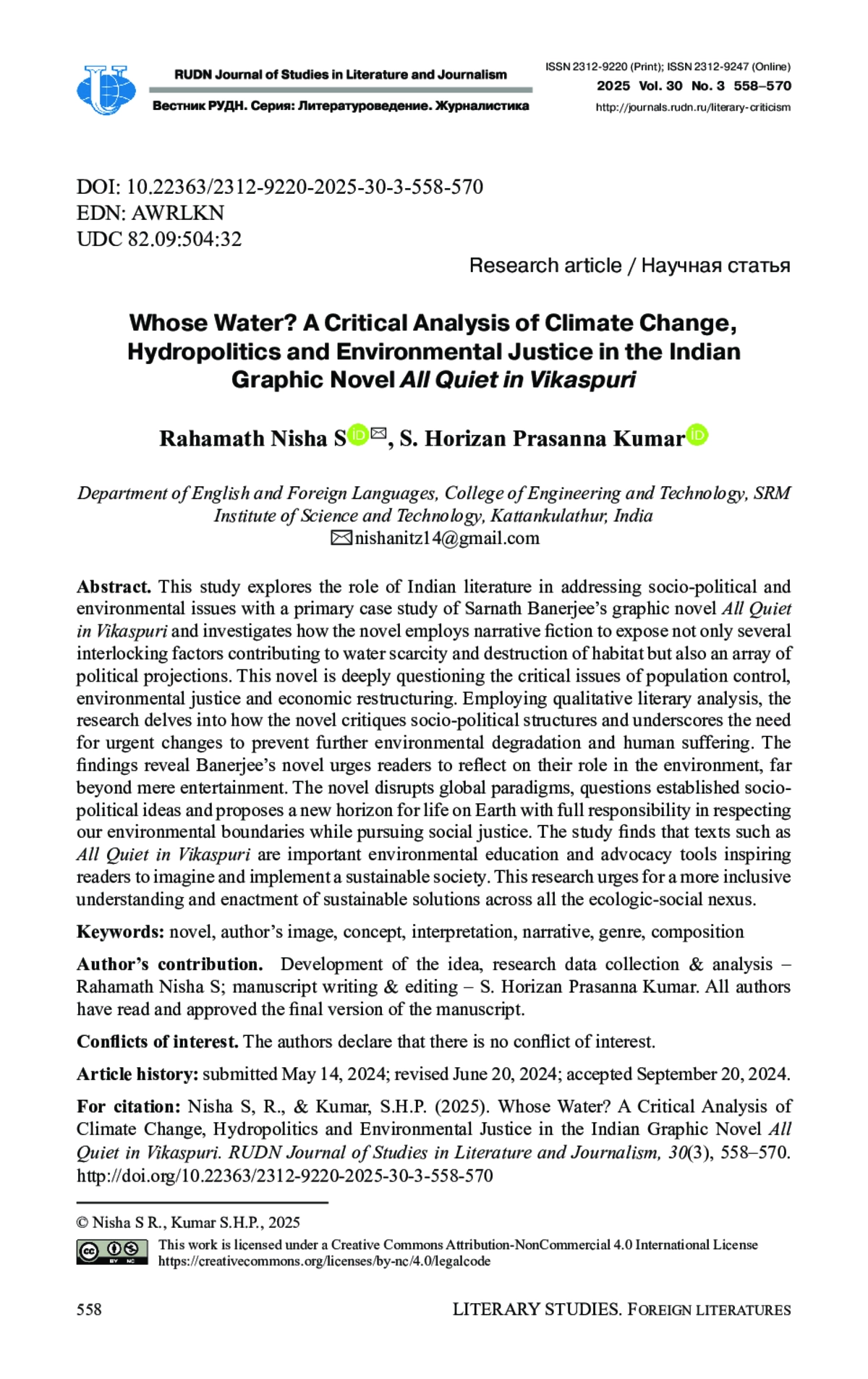 Рассматривается роль индийской литературы в решении социально-политических и экологических проблем на примере графического романа Сарнатха Банерджи «В Викаспури все спокойно». Исследуется, как используется повествовательная фантастика, чтобы выявить не только взаимосвязанные факторы, способствующие нехватке воды и разрушению среды обитания, но и ряд политических прогнозов. Роман ставит под сомнение важнейшие вопросы контроля рождаемости, экологической справедливости и экономической реструктуризации. Качественный литературный анализ показывает, как критикуются социально-политические структуры, подчеркивается необходимость срочных изменений для предотвращения экологической катастрофы и человеческих страданий. В результате можно сделать вывод, что Банерджи призывает задуматься о своей роли в сохранении окружающей среды, выйдя за рамки простого развлечения. Роман разрушает глобальные парадигмы, ставит под сомнение устоявшиеся социально-политические идеи, пропагандируя полную ответственность за жизнь на Земле, уважение экологических границ и стремление к социальной справедливости. Такие тексты, как «В Викаспури все спокойно», являются важными инструментами экологического образования и пропаганды, вдохновляющими читателей на создание и реализацию устойчивого общества, призывающими к более инклюзивному пониманию и принятию устойчивых решений во всех эколого-социальных связях.
