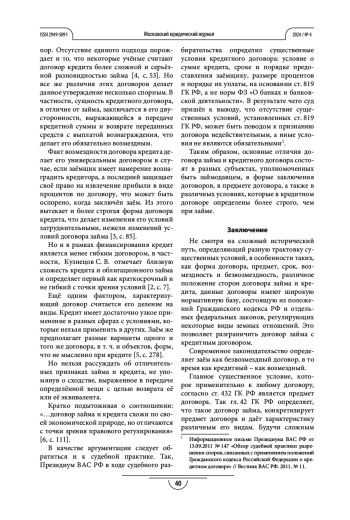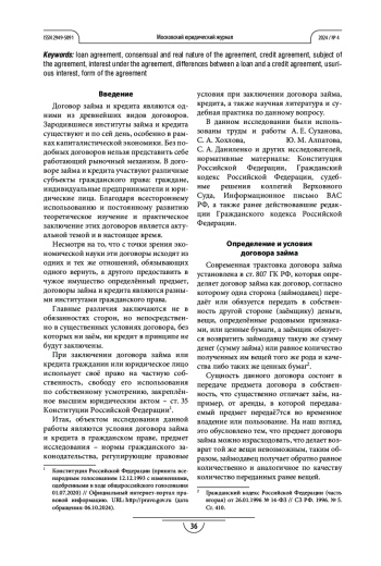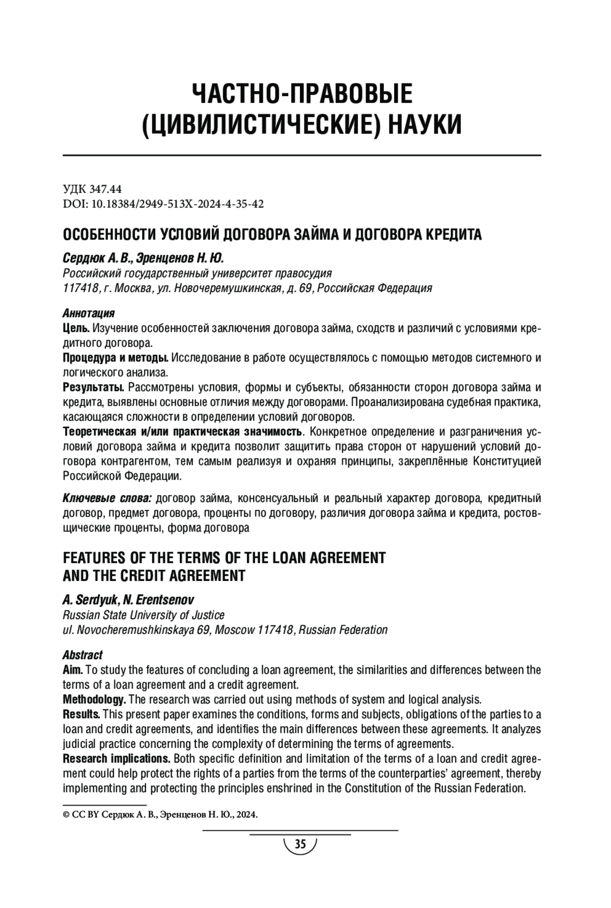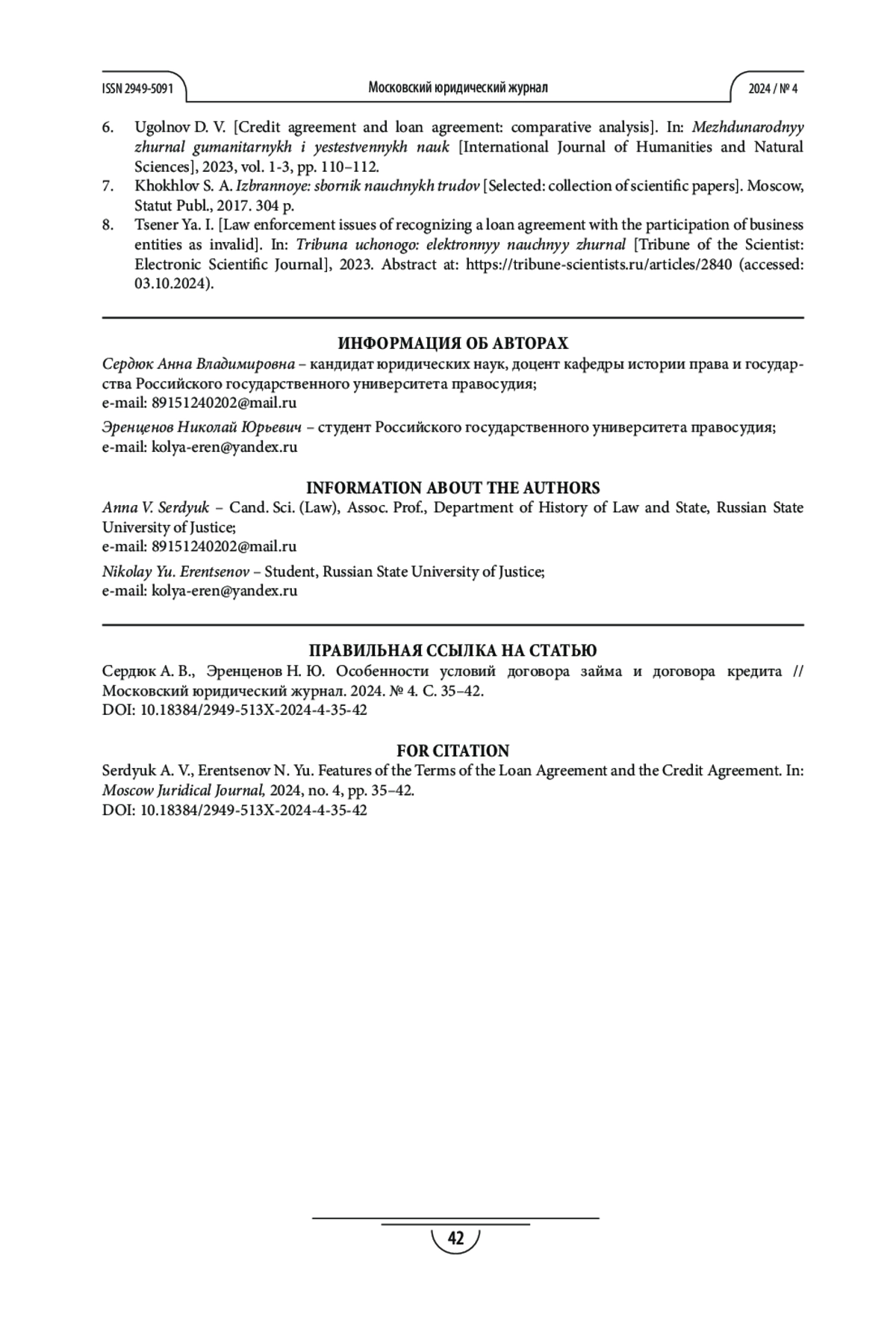 СЕРДЮК А. В., ЭРЕНЦЕНОВ Н. Ю. ОСОБЕННОСТИ УСЛОВИЙ ДОГОВОРА ЗАЙМА И ДОГОВОРА КРЕДИТА // МОСКОВСКИЙ ЮРИДИЧЕСКИЙ ЖУРНАЛ. 2024. 2024 / №4