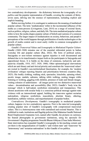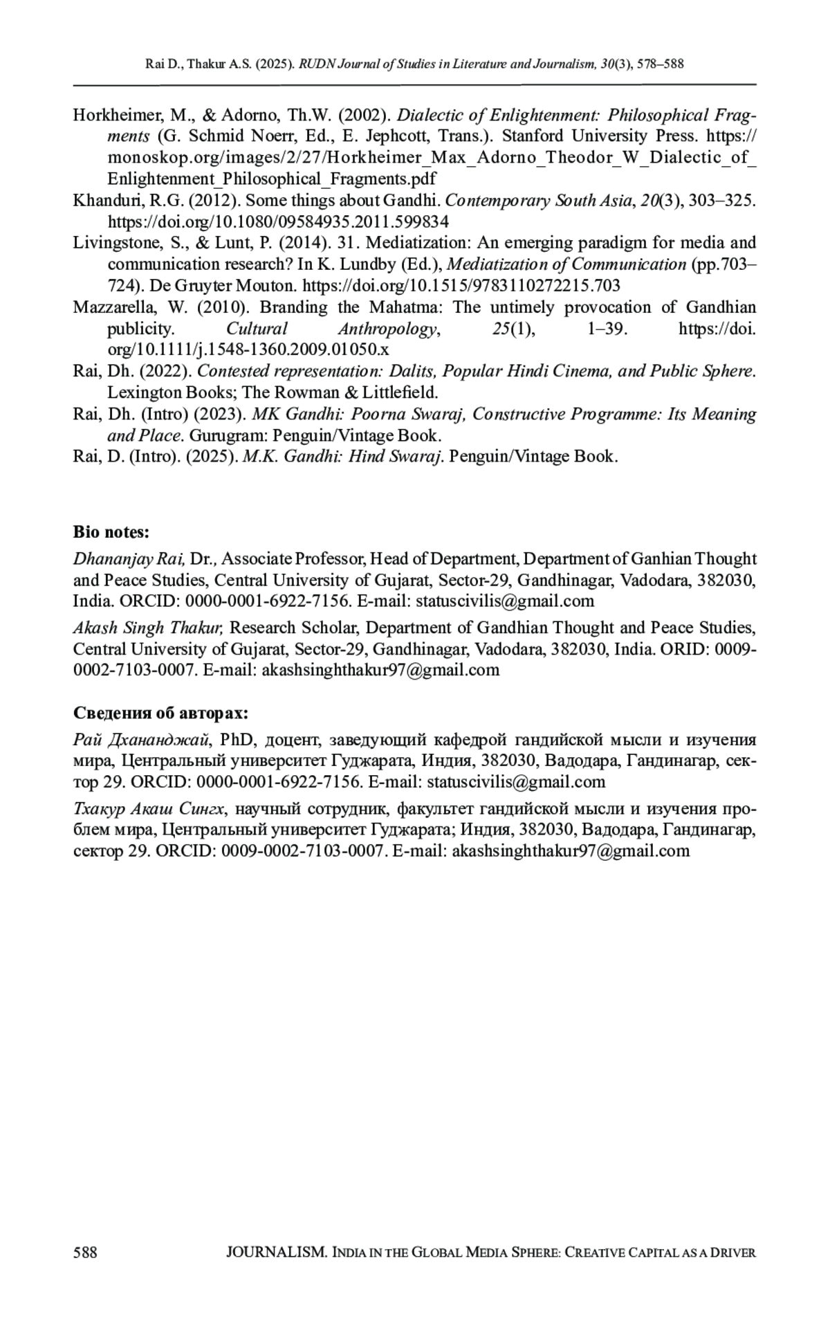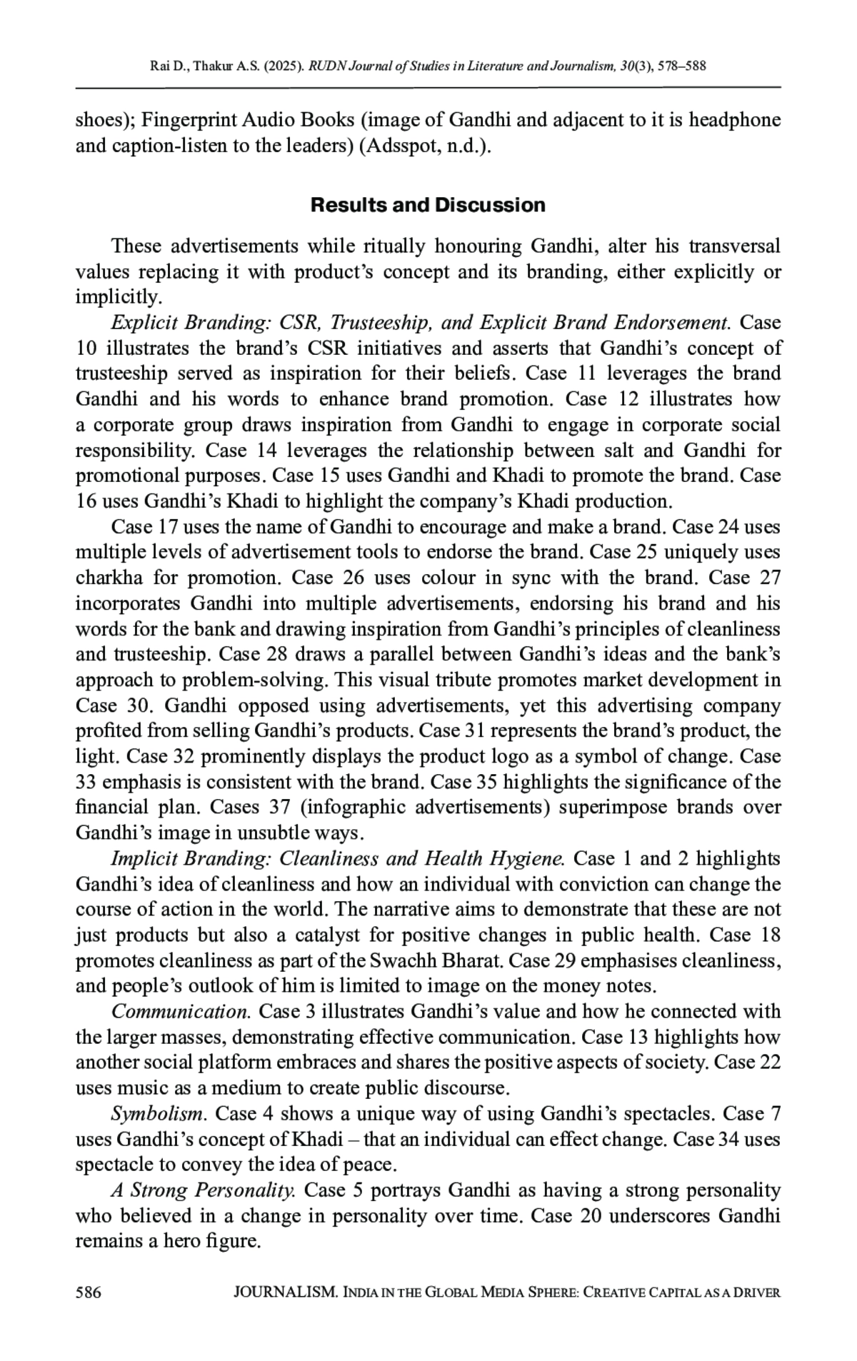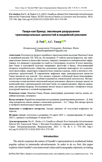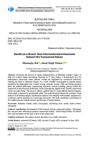 РАЙ Д., ТХАКУР А. С. ГАНДИ КАК БРЕНД: ЭВОЛЮЦИЯ РАЗРУШЕНИЯ ТРАНСВЕРСАЛЬНЫХ ЦЕННОСТЕЙ В МЕДИЙНОЙ РЕКЛАМЕ // ВЕСТНИК РОССИЙСКОГО УНИВЕРСИТЕТА ДРУЖБЫ НАРОДОВ. СЕРИЯ: ЛИТЕРАТУРОВЕДЕНИЕ. ЖУРНАЛИСТИКА. 2025. ТОМ 30 № 3
