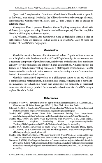 Examined the process of media reinterpretation of Mahatma Gandhi’s legacy in 20th-21st century Indian advertising. Drawing on 37 case studies, it demonstrates how the philosopher’s transversal values (ahimsa, swaraj) are supplanted by commercial narratives, reducing his ideas to utilitarian slogans. As a result, Gandhi’s iconography in popular culture transforms the philosopher into a brand serving consumer society, while advertising practices dilute his political philosophy, emphasizing superficial symbols (clothing, glasses) within the framework of heteronomous preferences. In the contemporary digital world, Gandhi’s transversal values are under threat. This process reflects a global trend of commodifying historical figures, where depth is replaced by questionable utility. The methodological framework combines visual analysis of advertising imagery and discourse analysis of its interplay with Gandhi’s original texts, worldview, and his archetype as a moral sage and mentor. The study contributes to the debate on the conflict between cultural memory and the logic of media markets.