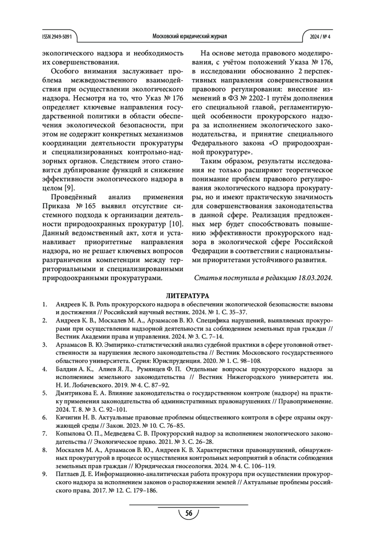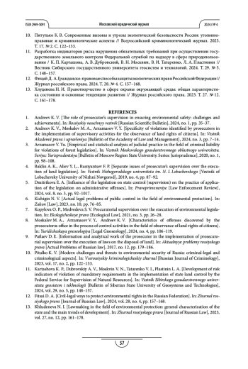 1. Андреев К. В. Роль прокурорского надзора в обеспечении экологической безопасности: вызовы и достижения // Российский научный вестник. 2024. № 1. С. 35-37.