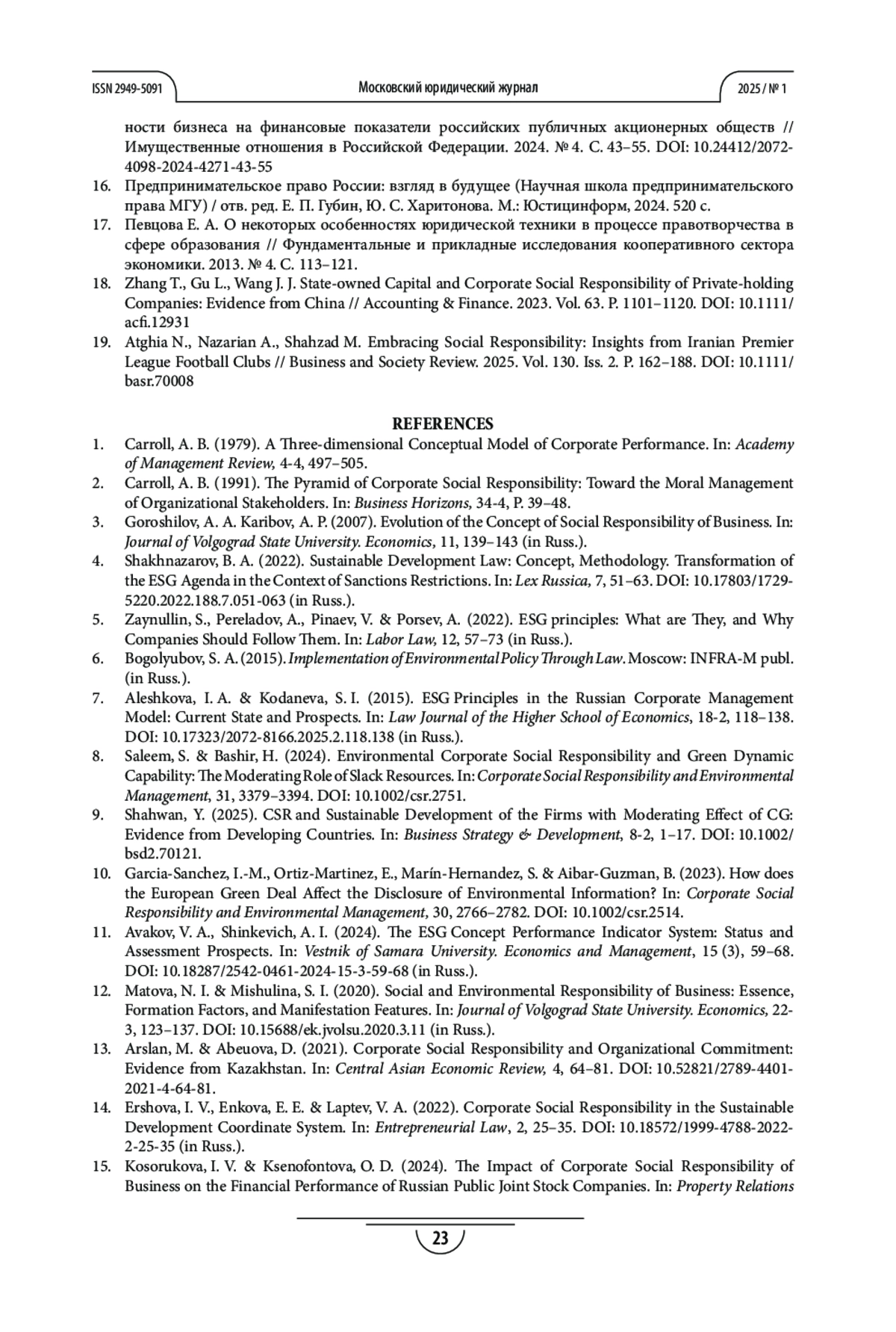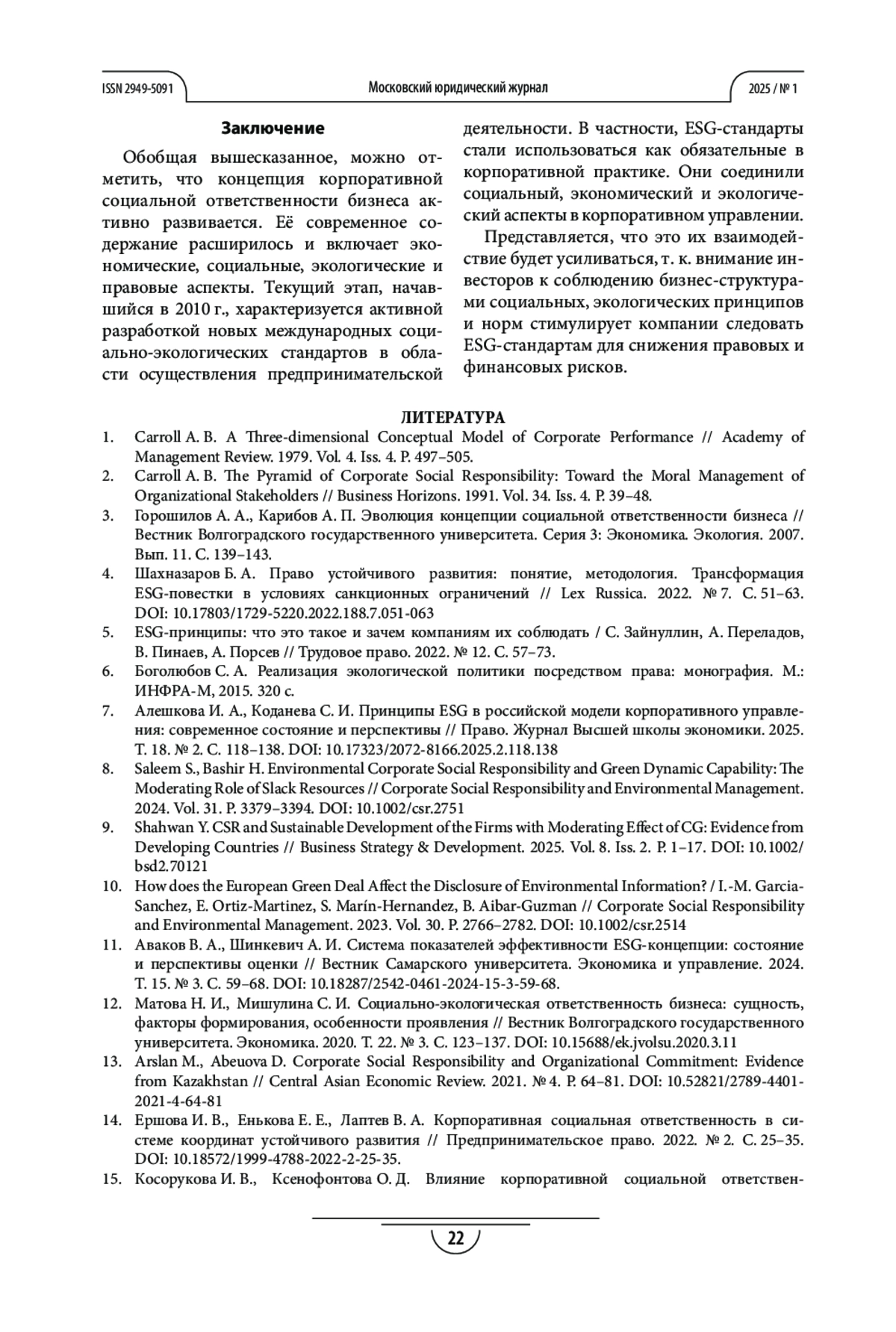 7. Алешкова И. А., Коданева С. И. Принципы ESG в российской модели корпоративного управления: современное состояние и перспективы // Право. Журнал Высшей школы экономики. 2025. Т. 18. № 2. С. 118-138. https://doi.org/10.17323/2072-8166.2025.2.118.138