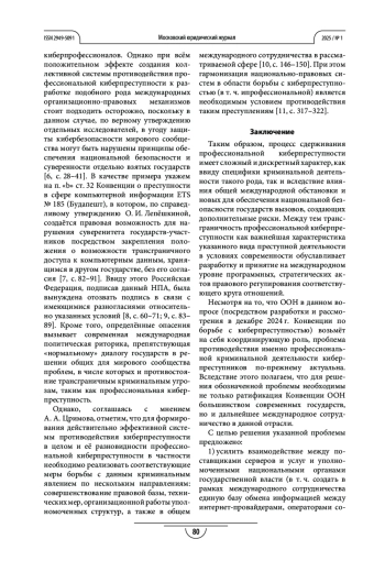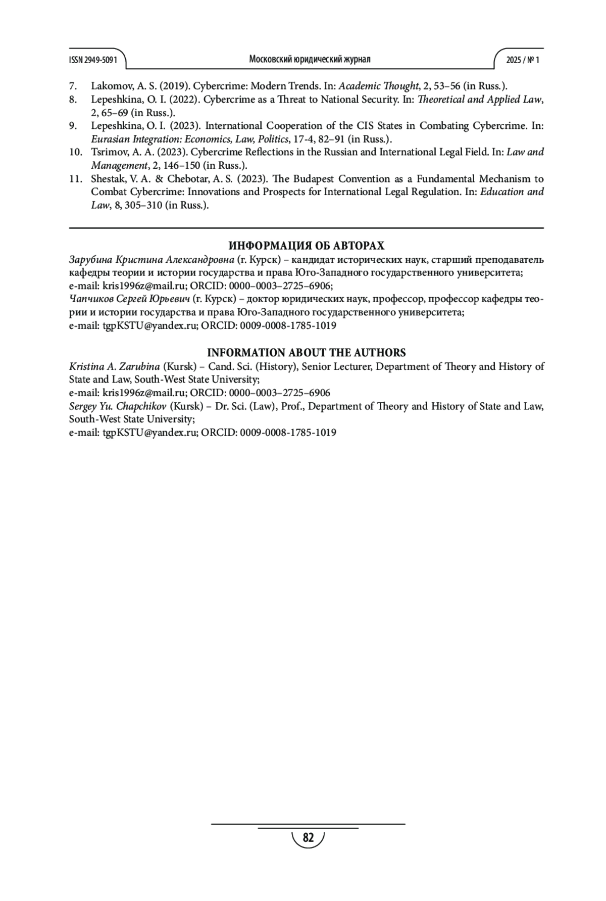 8. Лепешкина О. И. Международное сотрудничество государств СНГ по противодействию киберпреступности // Евразийская интеграция: экономика, право, политика. 2023. Т. 17. № 4. С. 82-91.