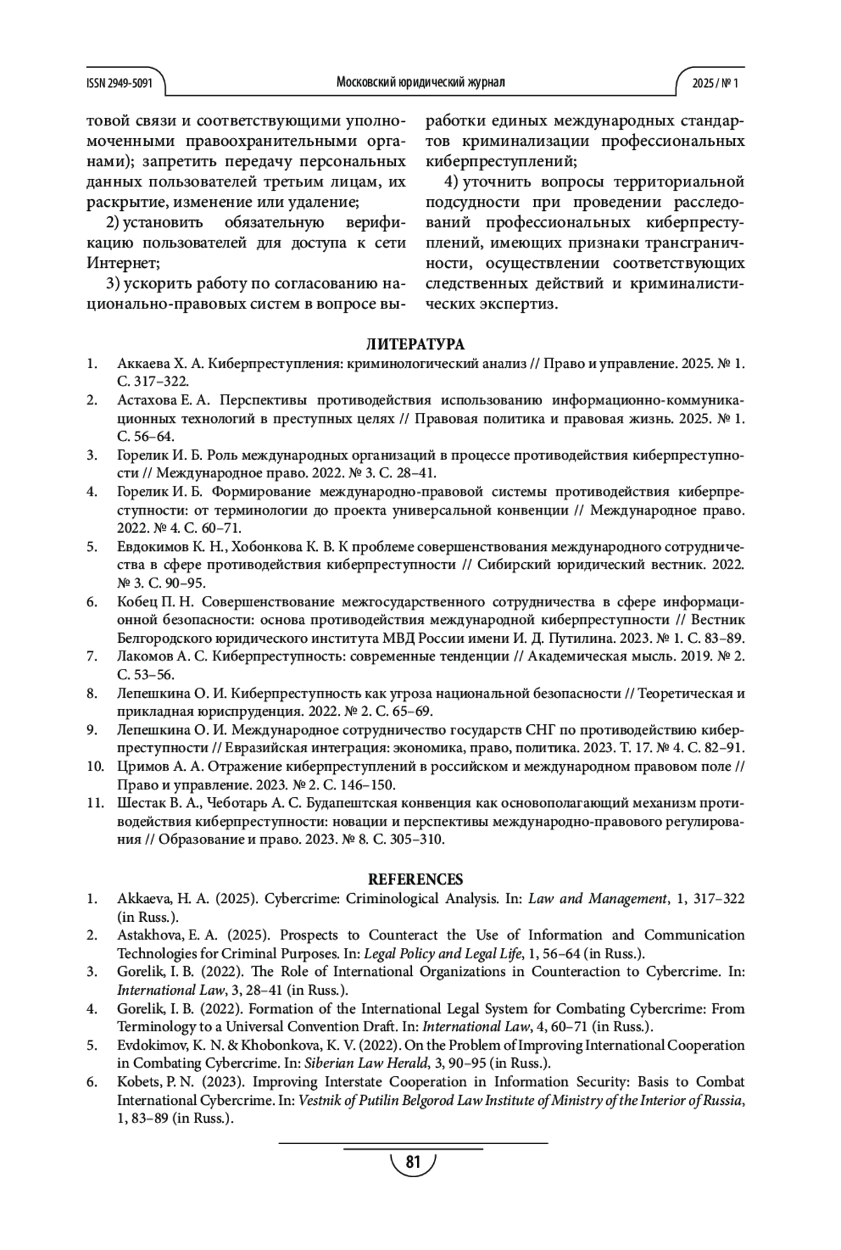 4. Горелик И. Б. Формирование международно-правовой системы противодействия киберпреступности: от терминологии до проекта универсальной конвенции // Международное право. 2022. № 4. С. 60-71.