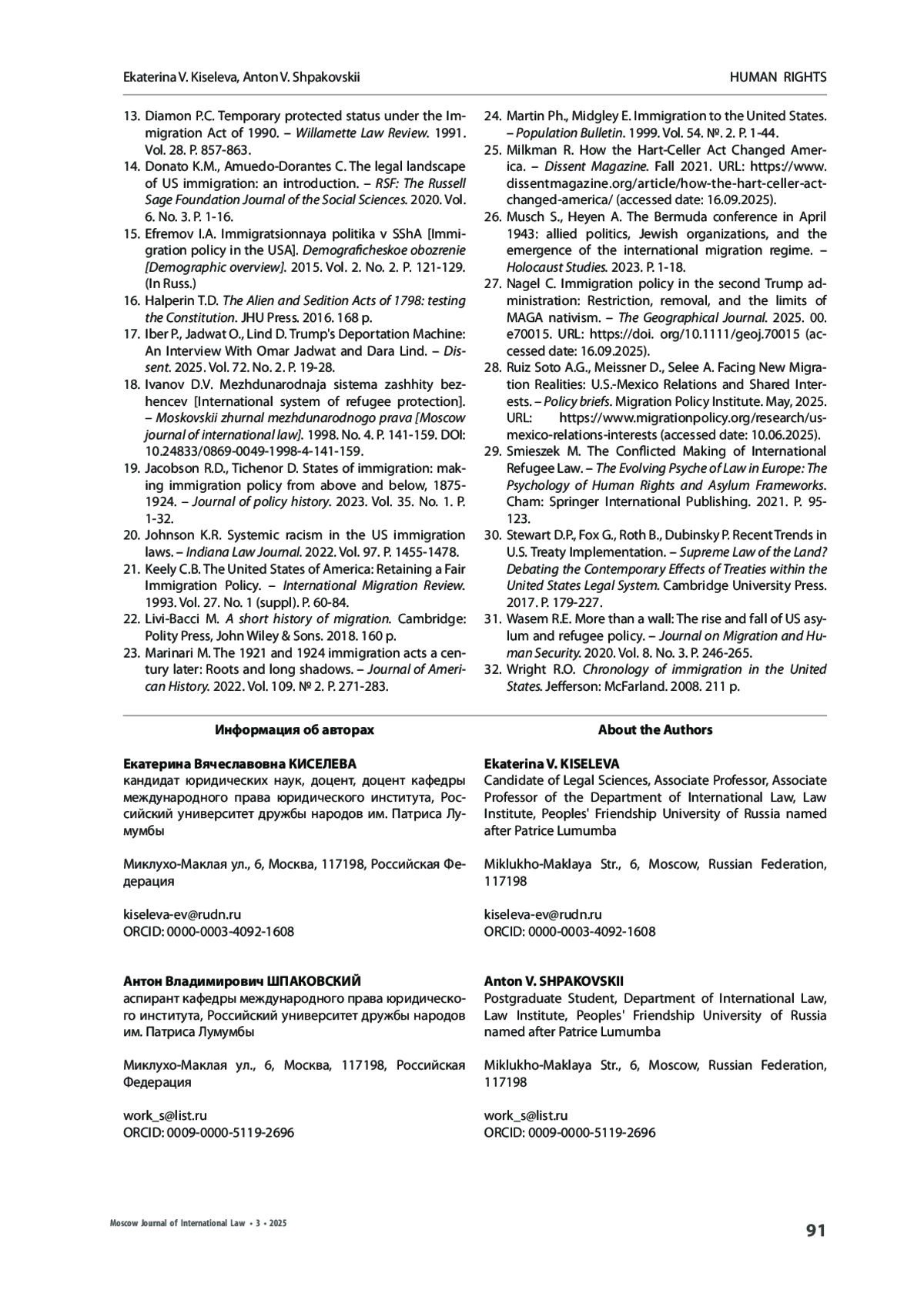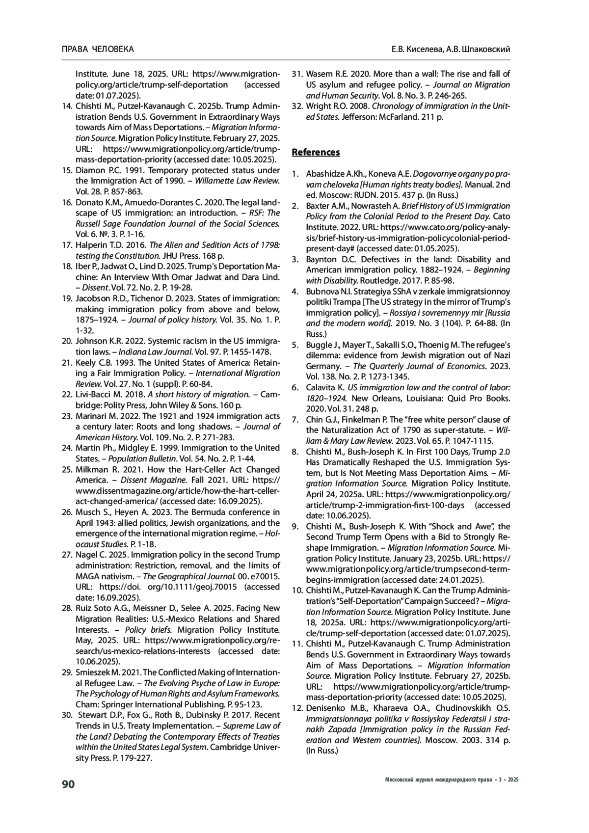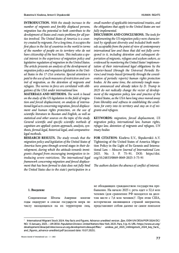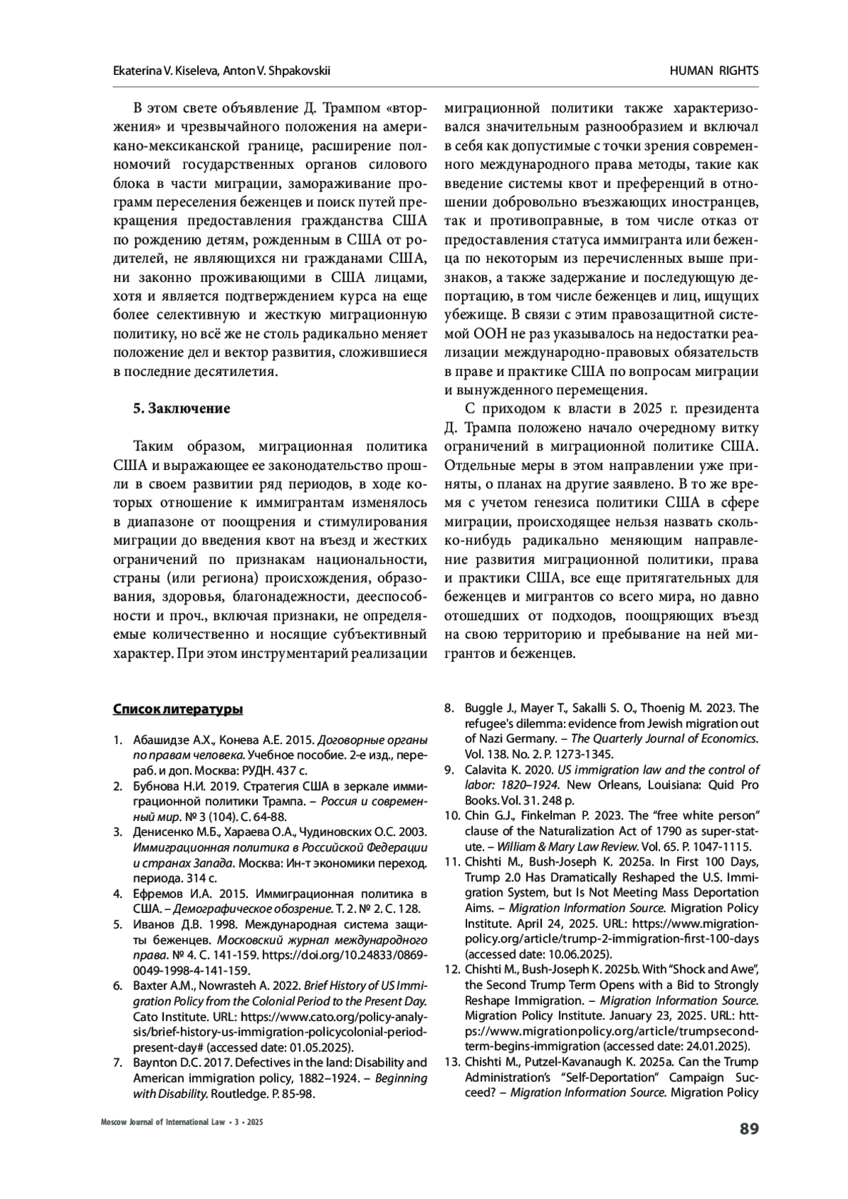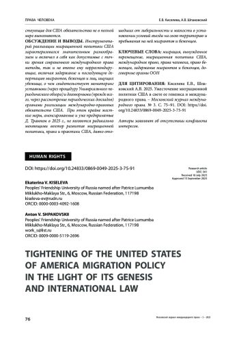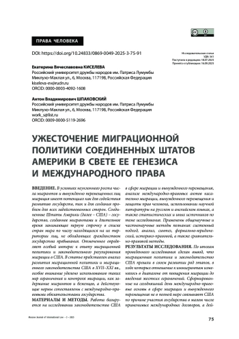 КИСЕЛЕВА Е. В., ШПАКОВСКИЙ А. В. УЖЕСТОЧЕНИЕ МИГРАЦИОННОЙ ПОЛИТИКИ СОЕДИНЕННЫХ ШТАТОВ АМЕРИКИ В СВЕТЕ ЕЕ ГЕНЕЗИСА И МЕЖДУНАРОДНОГО ПРАВА // МОСКОВСКИЙ ЖУРНАЛ МЕЖДУНАРОДНОГО ПРАВА. 2025. ВЫПУСК 3